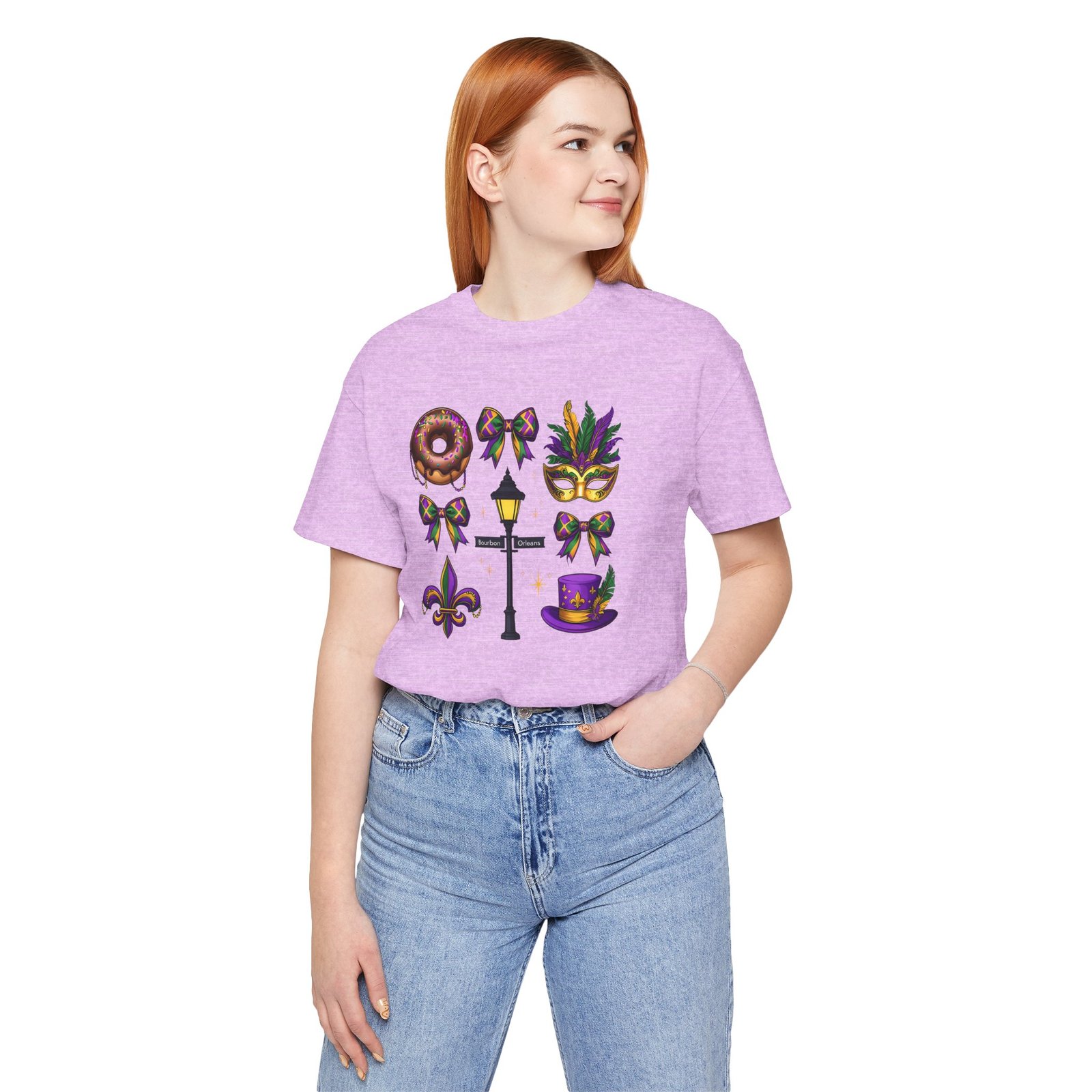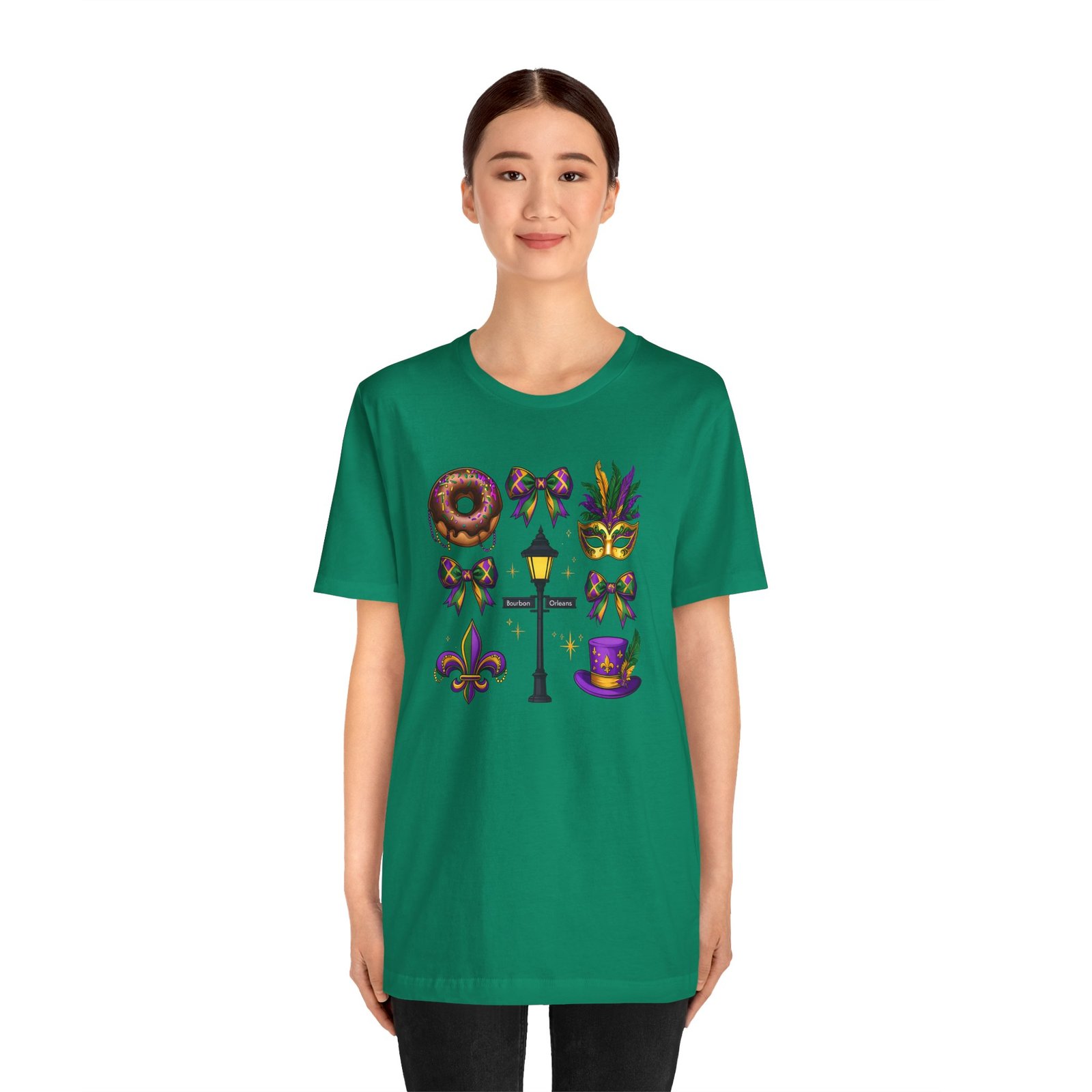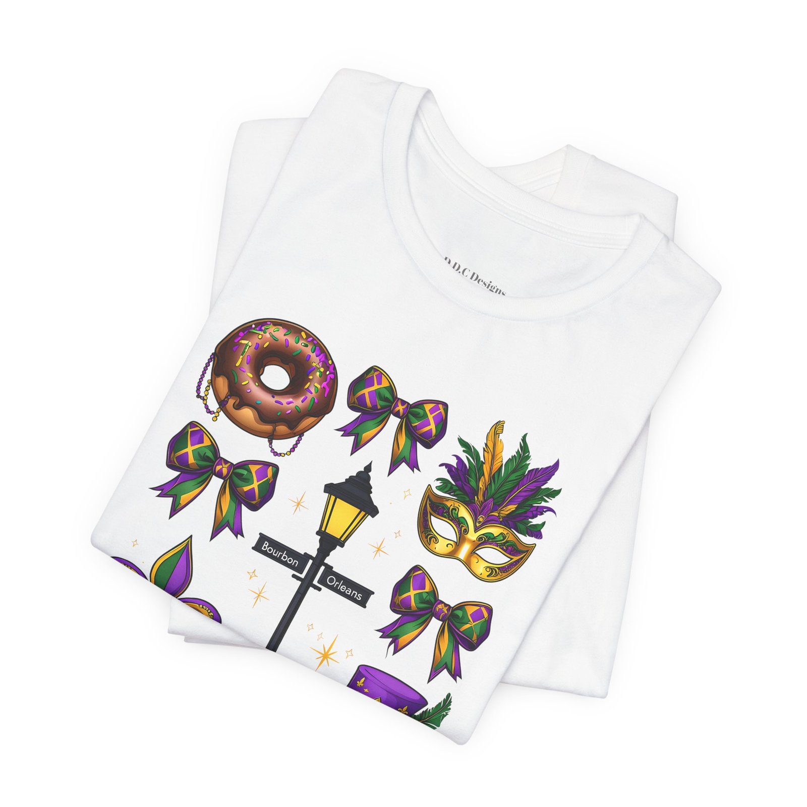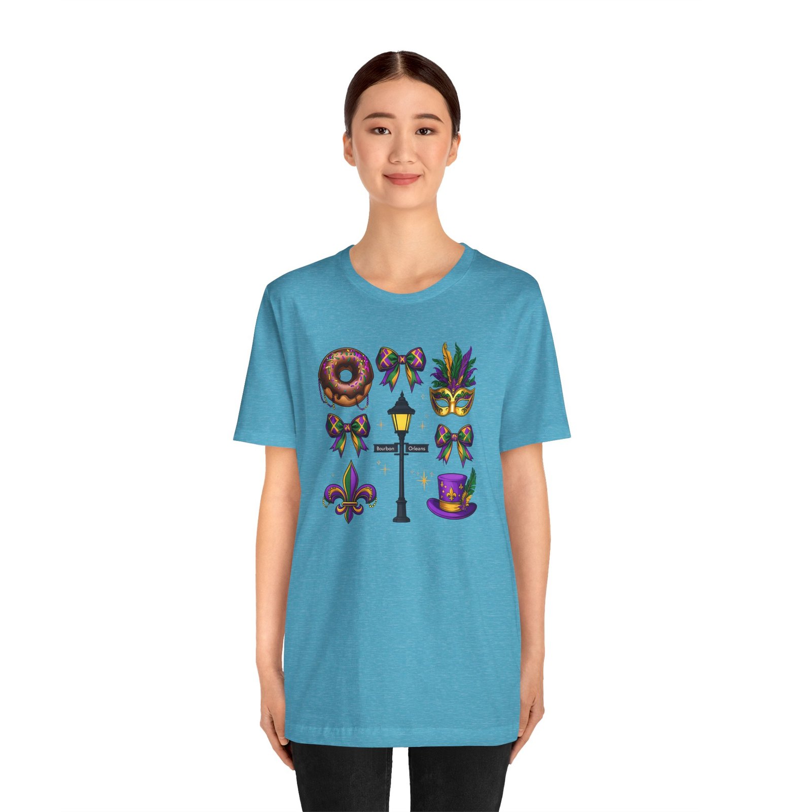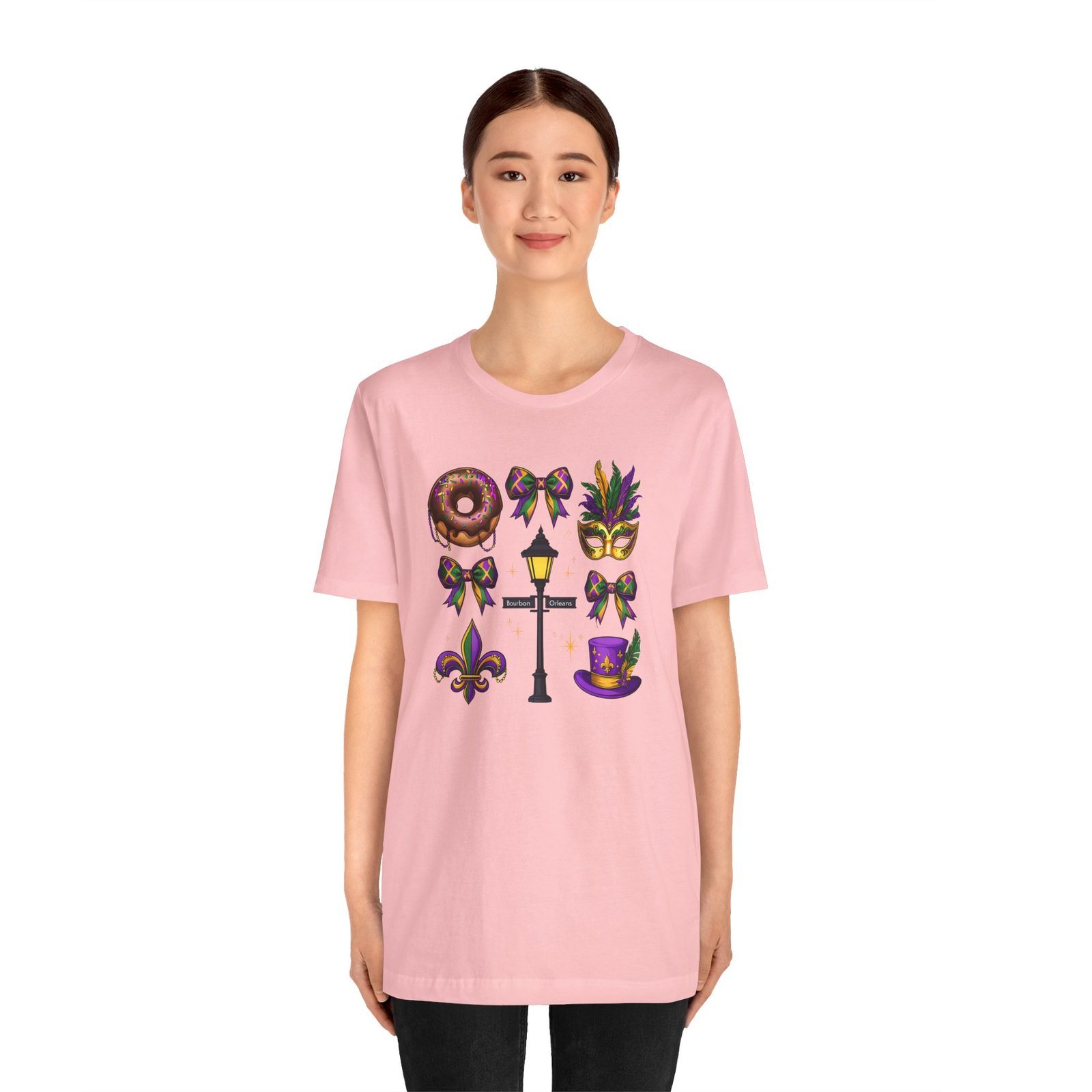 Feel the thrum of Bourbon Street with this playful Mardi Gras tee. A curated grid of icons — a chocolate-frosted donut, a feathered top hat, a masquerade mask, a lamp post and fleur-de-lis — pops in purple, green and gold against crisp white. It’s lightweight and breathable, so you can move through parades, dance at King Cake parties, or wander the French Quarter without overheating. The classic crewneck and retail fit make it easy to style: knot the front, add sequins or flared leggings, and you’ve got a look that reads both casual and celebratory. Small details like ribbed collar, shoulder tape and side seams keep the shape, while soft Airlume combed cotton feels gentle on the skin. Wear it to relive a NOLA weekend or to bring Carnival energy to your next gathering. Product features – 100% Airlume combed & ring-spun cotton for a soft, breathable feel – Ribbed knit collar and shoulder tape for shape retention and durability – Side seams and retail fit for structure and a flattering silhouette – Vibrant, crisp prints via DTF/DTG on sleeves and neck label; tear-away label for comfort – REACH certified materials; responsibly manufactured with fair labor standards Care instructions – Machine wash: cold (max 30C or 90F) – Non-chlorine: bleach as needed – Tumble dry: low heat – Iron, steam or dry: medium heat – Do not dryclean
