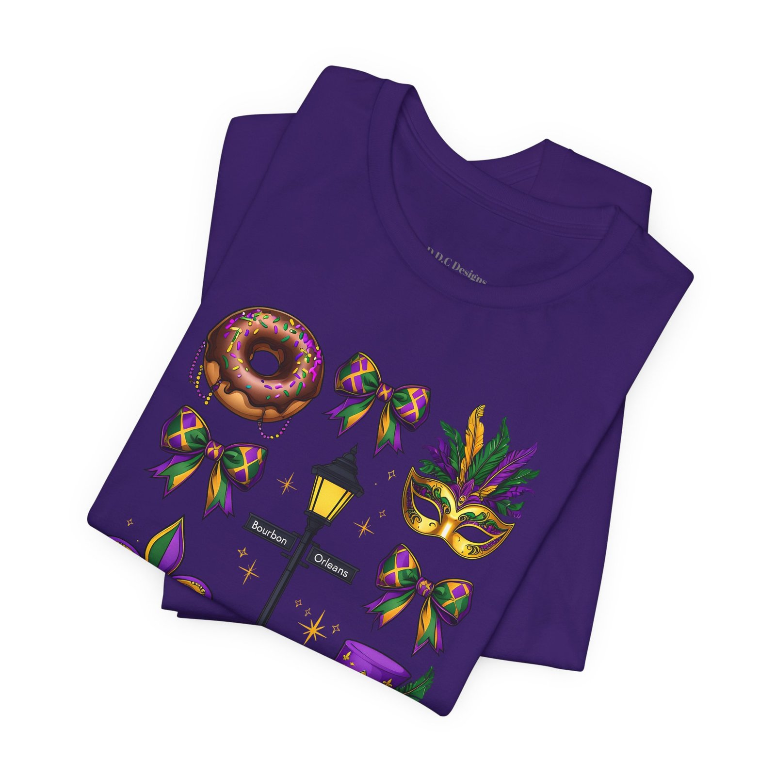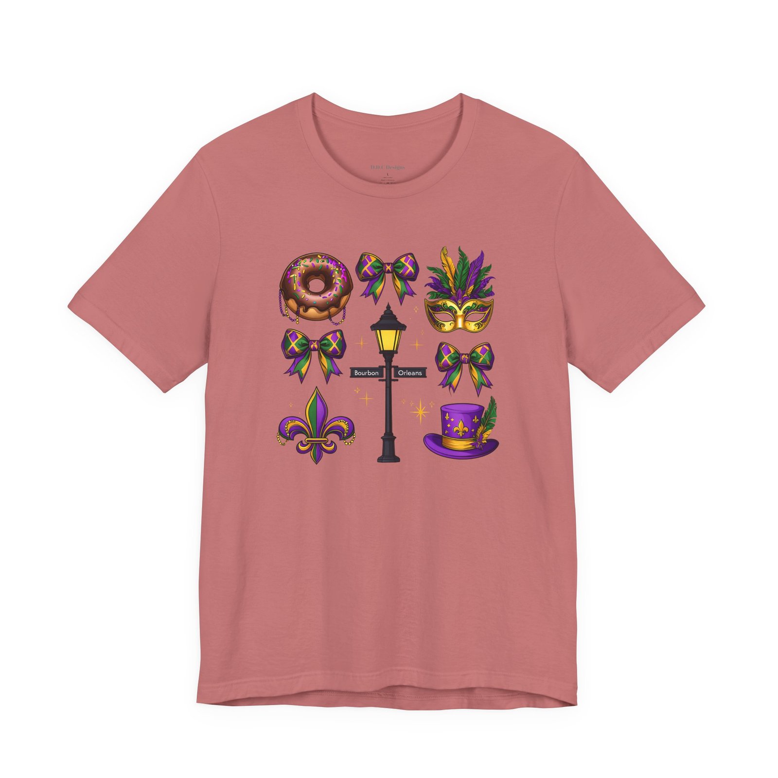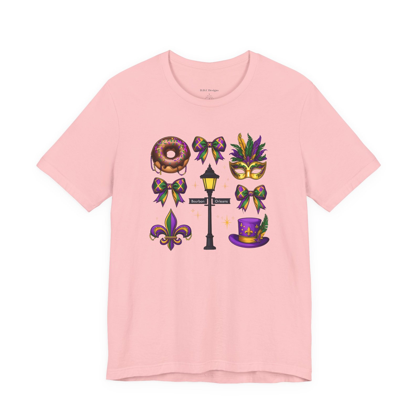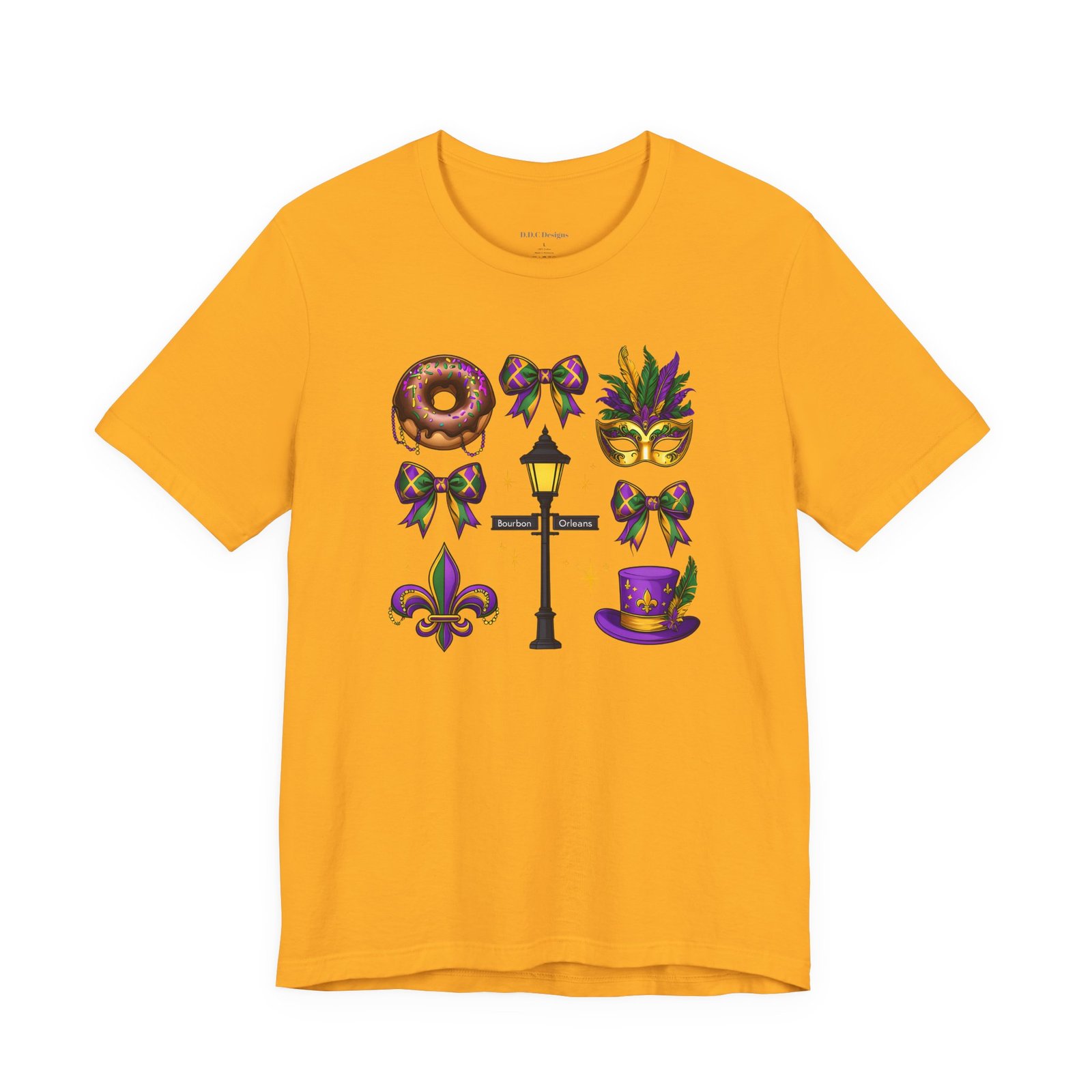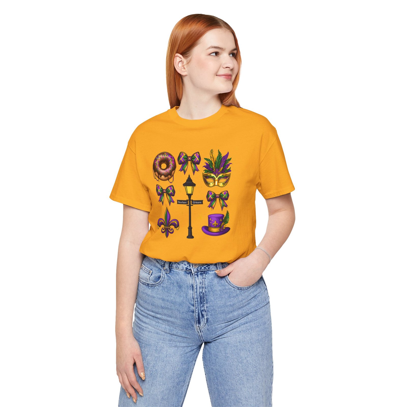 Feel the thrum of Bourbon Street with this playful Mardi Gras tee. A curated grid of icons — a chocolate-frosted donut, a feathered top hat, a masquerade mask, a lamp post and fleur-de-lis — pops in purple, green and gold against crisp white. It’s lightweight and breathable, so you can move through parades, dance at King Cake parties, or wander the French Quarter without overheating. The classic crewneck and retail fit make it easy to style: knot the front, add sequins or flared leggings, and you’ve got a look that reads both casual and celebratory. Small details like ribbed collar, shoulder tape and side seams keep the shape, while soft Airlume combed cotton feels gentle on the skin. Wear it to relive a NOLA weekend or to bring Carnival energy to your next gathering. Product features – 100% Airlume combed & ring-spun cotton for a soft, breathable feel – Ribbed knit collar and shoulder tape for shape retention and durability – Side seams and retail fit for structure and a flattering silhouette – Vibrant, crisp prints via DTF/DTG on sleeves and neck label; tear-away label for comfort – REACH certified materials; responsibly manufactured with fair labor standards Care instructions – Machine wash: cold (max 30C or 90F) – Non-chlorine: bleach as needed – Tumble dry: low heat – Iron, steam or dry: medium heat – Do not dryclean