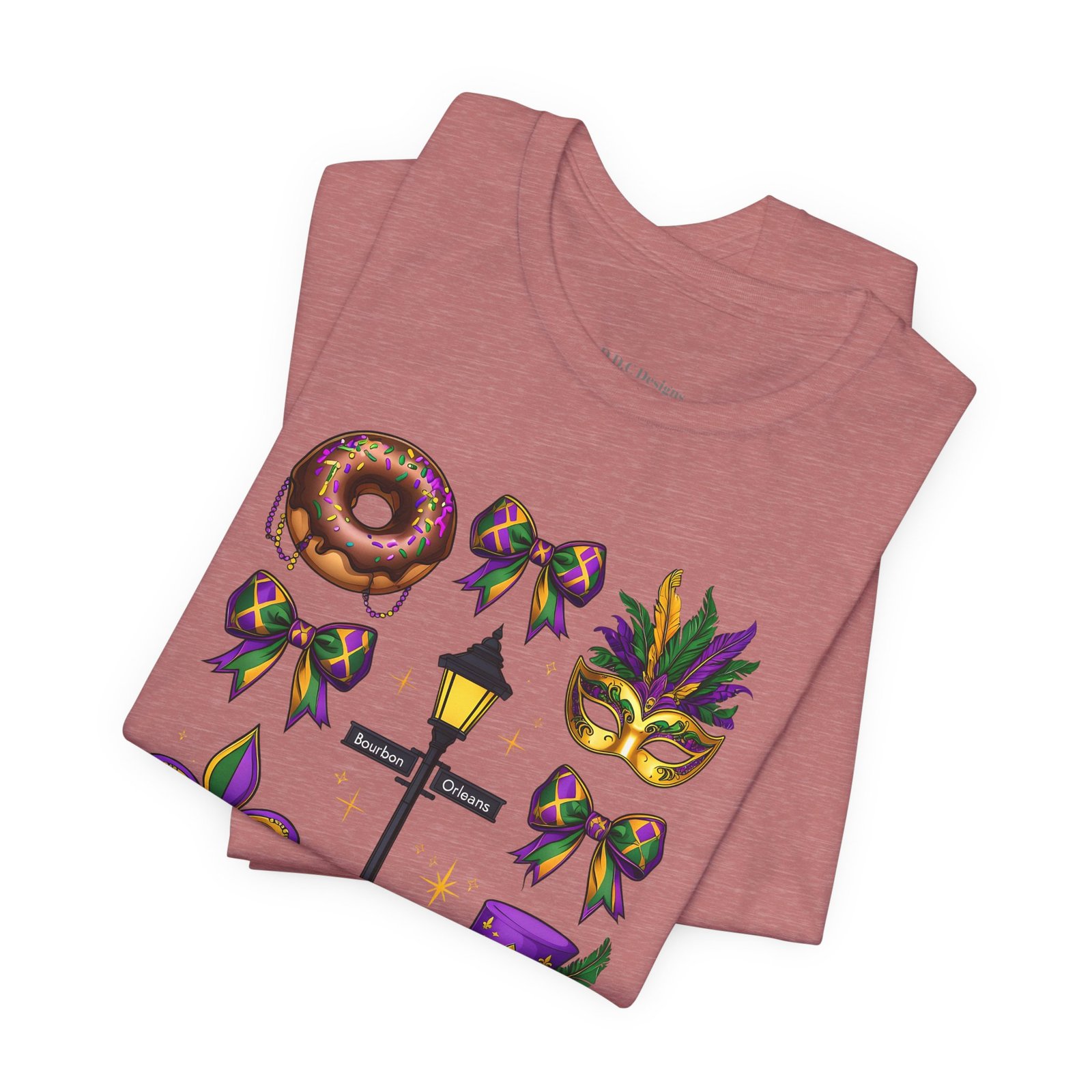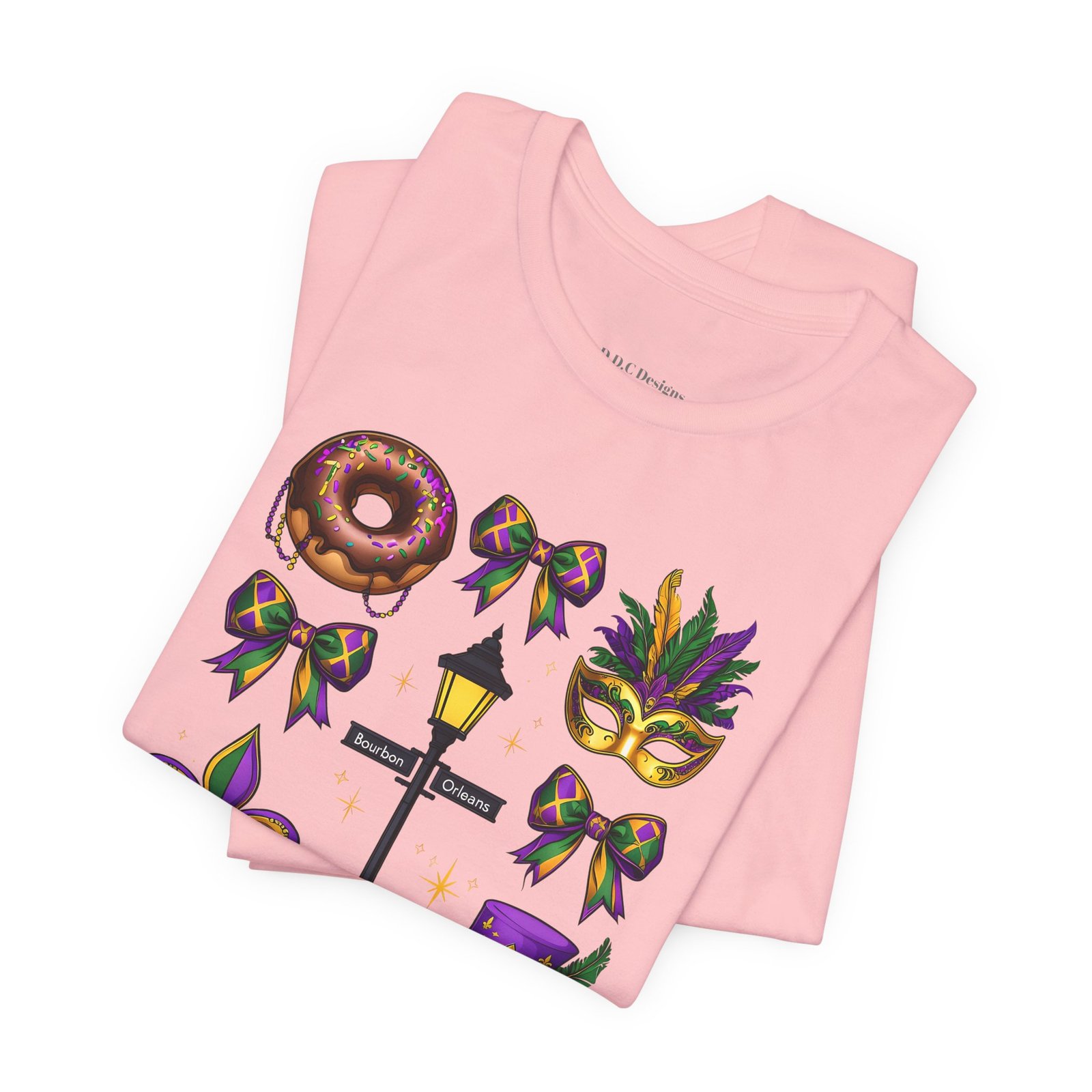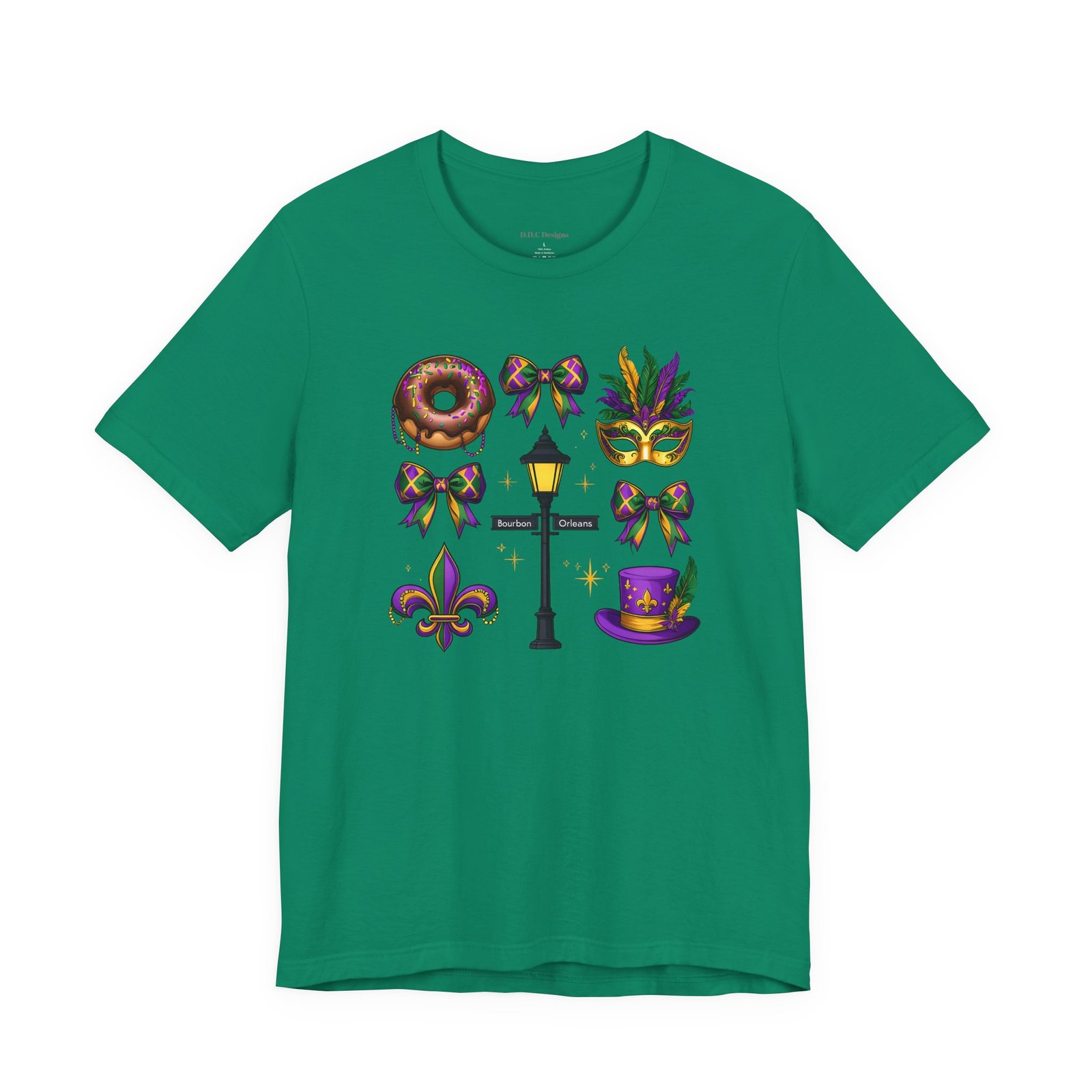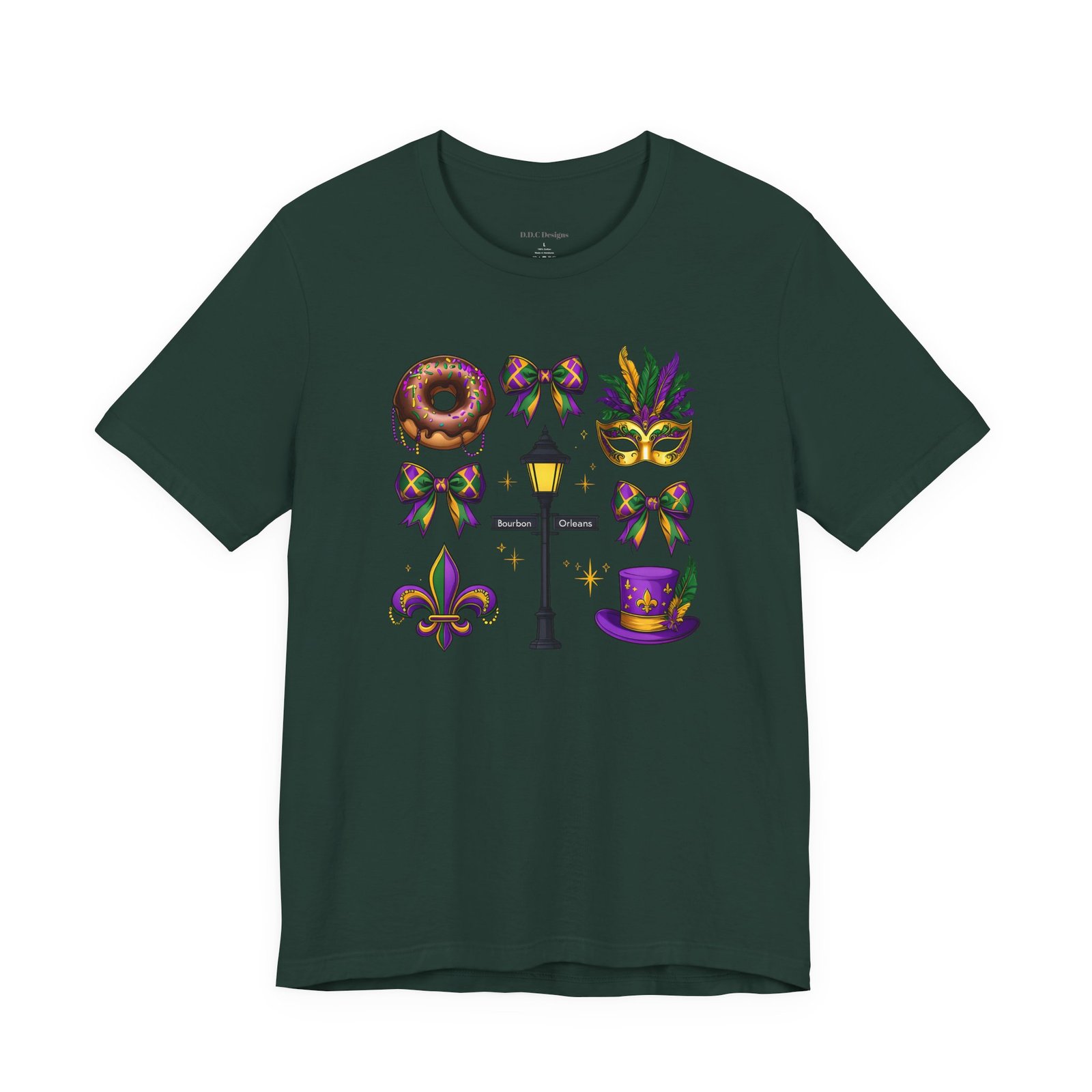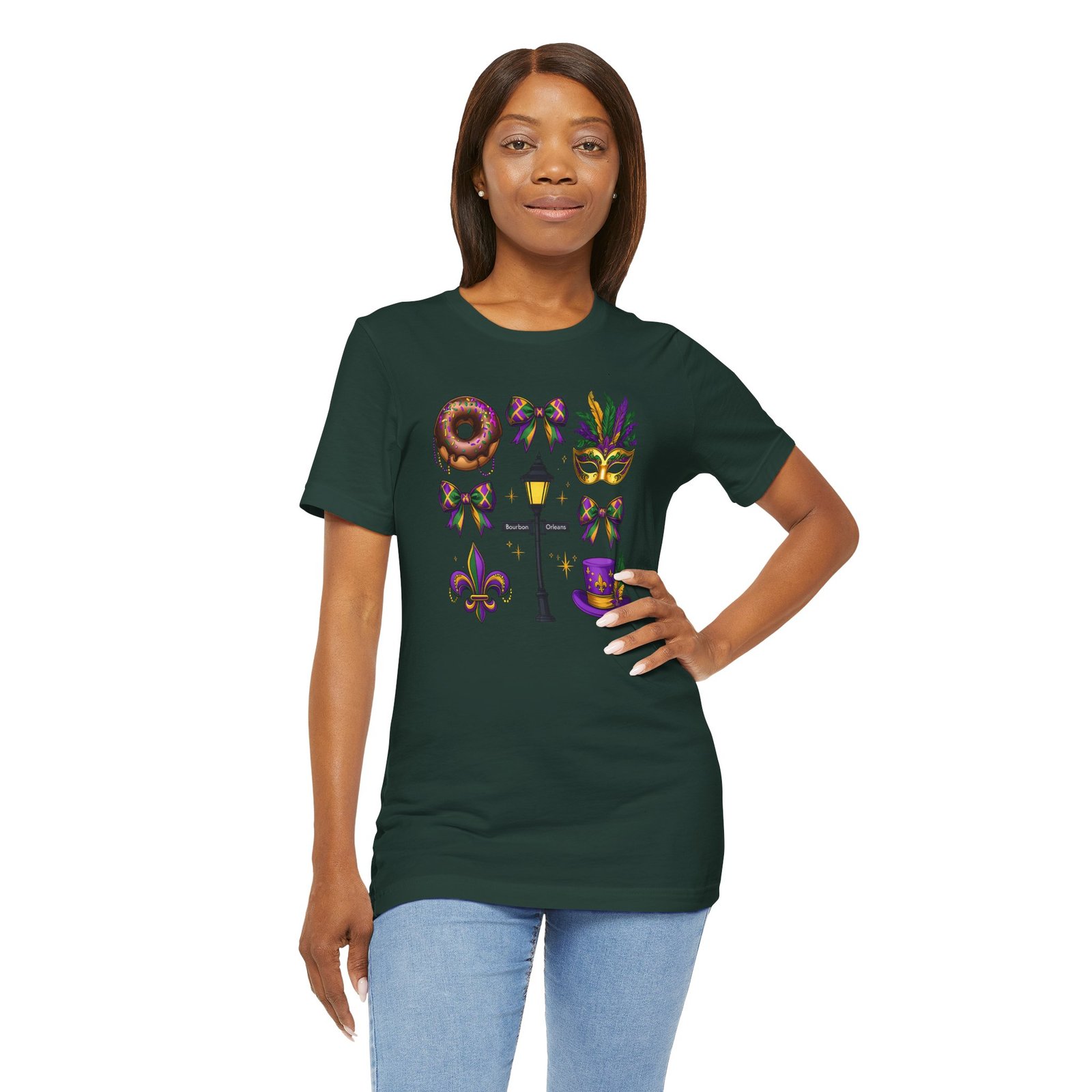 Feel the thrum of Bourbon Street with this playful Mardi Gras tee. A curated grid of icons — a chocolate-frosted donut, a feathered top hat, a masquerade mask, a lamp post and fleur-de-lis — pops in purple, green and gold against crisp white. It’s lightweight and breathable, so you can move through parades, dance at King Cake parties, or wander the French Quarter without overheating. The classic crewneck and retail fit make it easy to style: knot the front, add sequins or flared leggings, and you’ve got a look that reads both casual and celebratory. Small details like ribbed collar, shoulder tape and side seams keep the shape, while soft Airlume combed cotton feels gentle on the skin. Wear it to relive a NOLA weekend or to bring Carnival energy to your next gathering. Product features – 100% Airlume combed & ring-spun cotton for a soft, breathable feel – Ribbed knit collar and shoulder tape for shape retention and durability – Side seams and retail fit for structure and a flattering silhouette – Vibrant, crisp prints via DTF/DTG on sleeves and neck label; tear-away label for comfort – REACH certified materials; responsibly manufactured with fair labor standards Care instructions – Machine wash: cold (max 30C or 90F) – Non-chlorine: bleach as needed – Tumble dry: low heat – Iron, steam or dry: medium heat – Do not dryclean