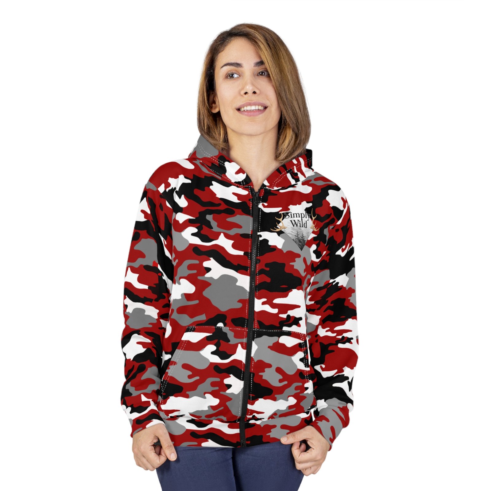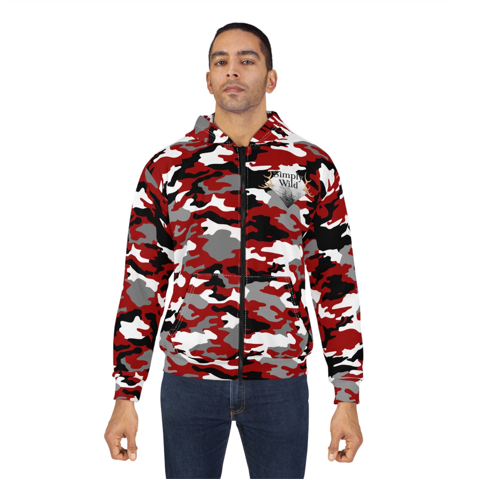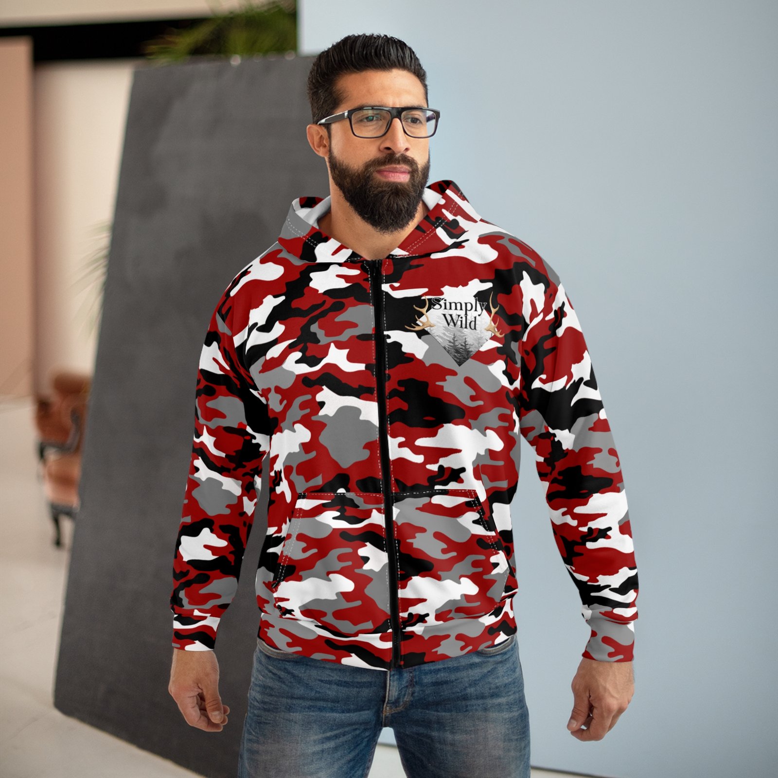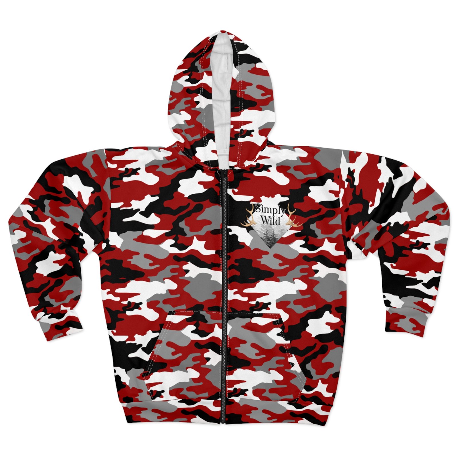 This zip-front hoodie wraps bold, modern camo in a striking red, black and gray palette with artful wildlife accents. The all-over print keeps the pattern continuous across the seams while a detailed stag emblem on the back and a small chest mark add character. It feels sturdy and substantial without weighing you down, with roomy front pockets and a classic cut that lets you move freely. Wear it on early-morning trail checks, around the campfire, or when you want a confident, outdoorsy edge in streetwear rotations.