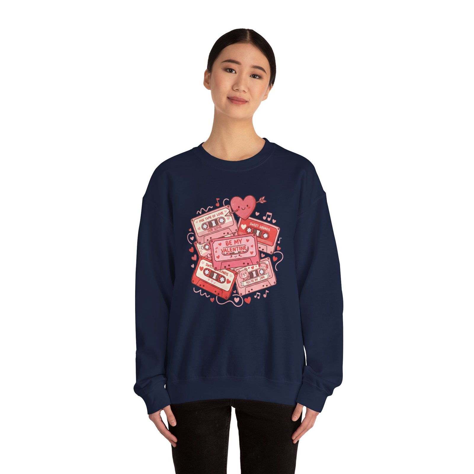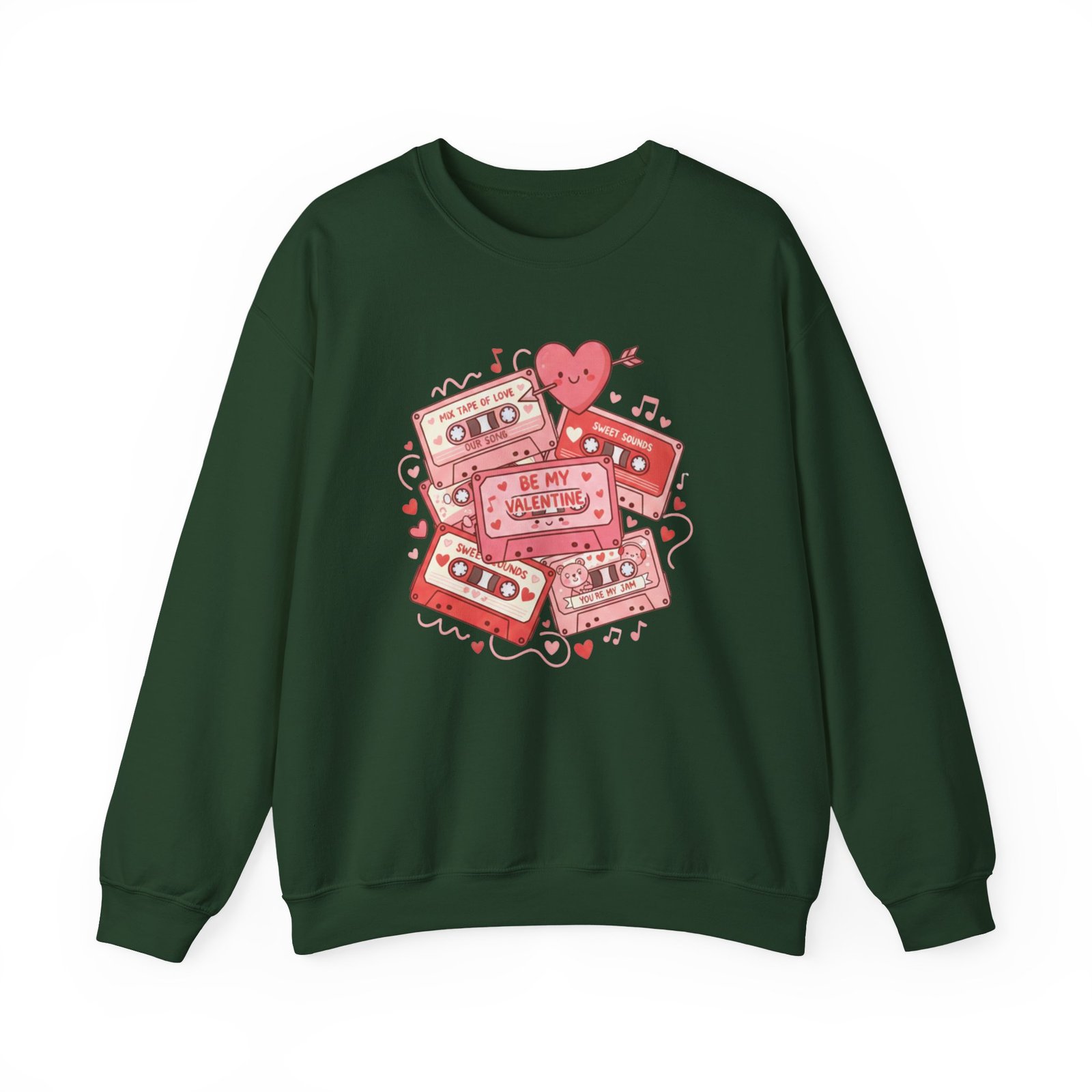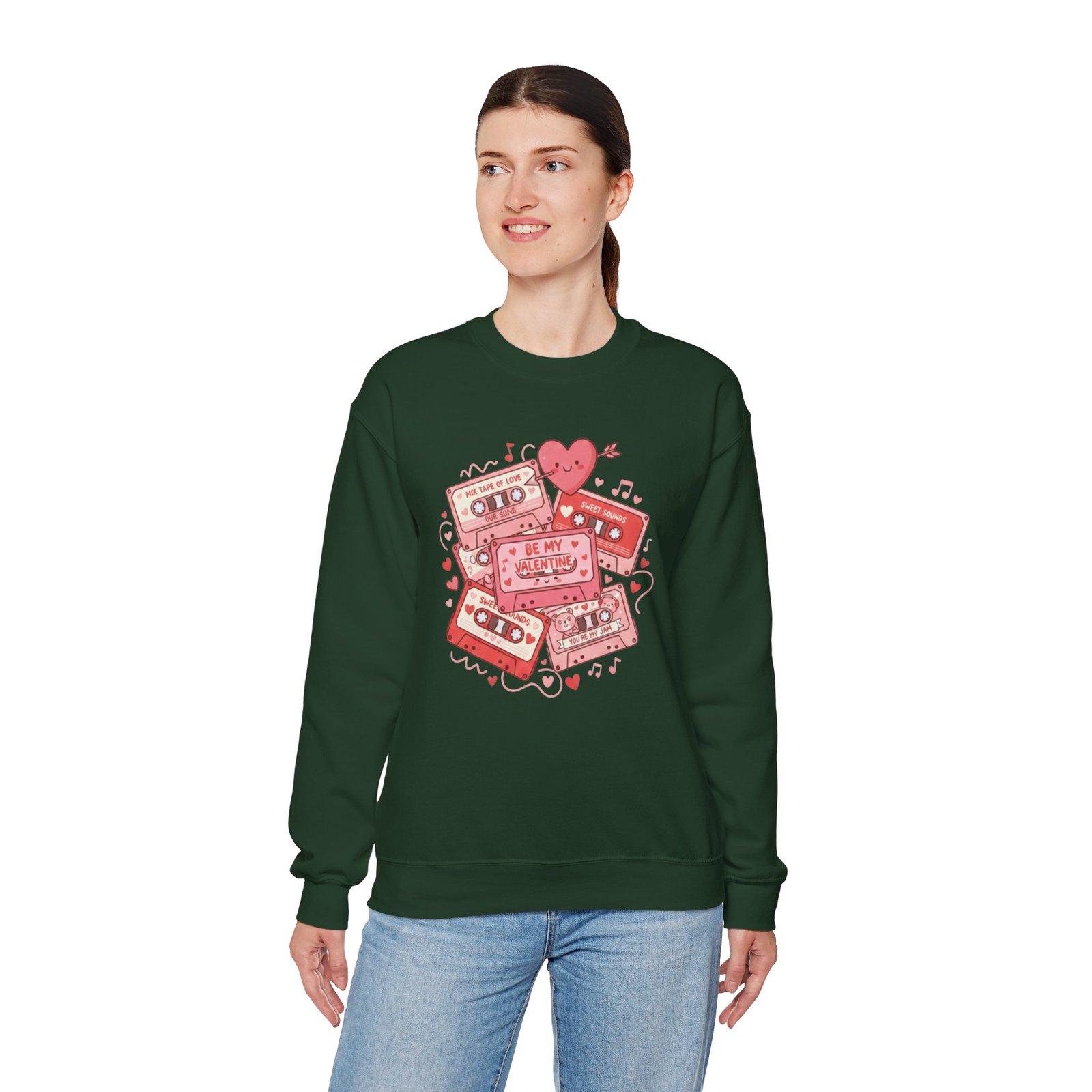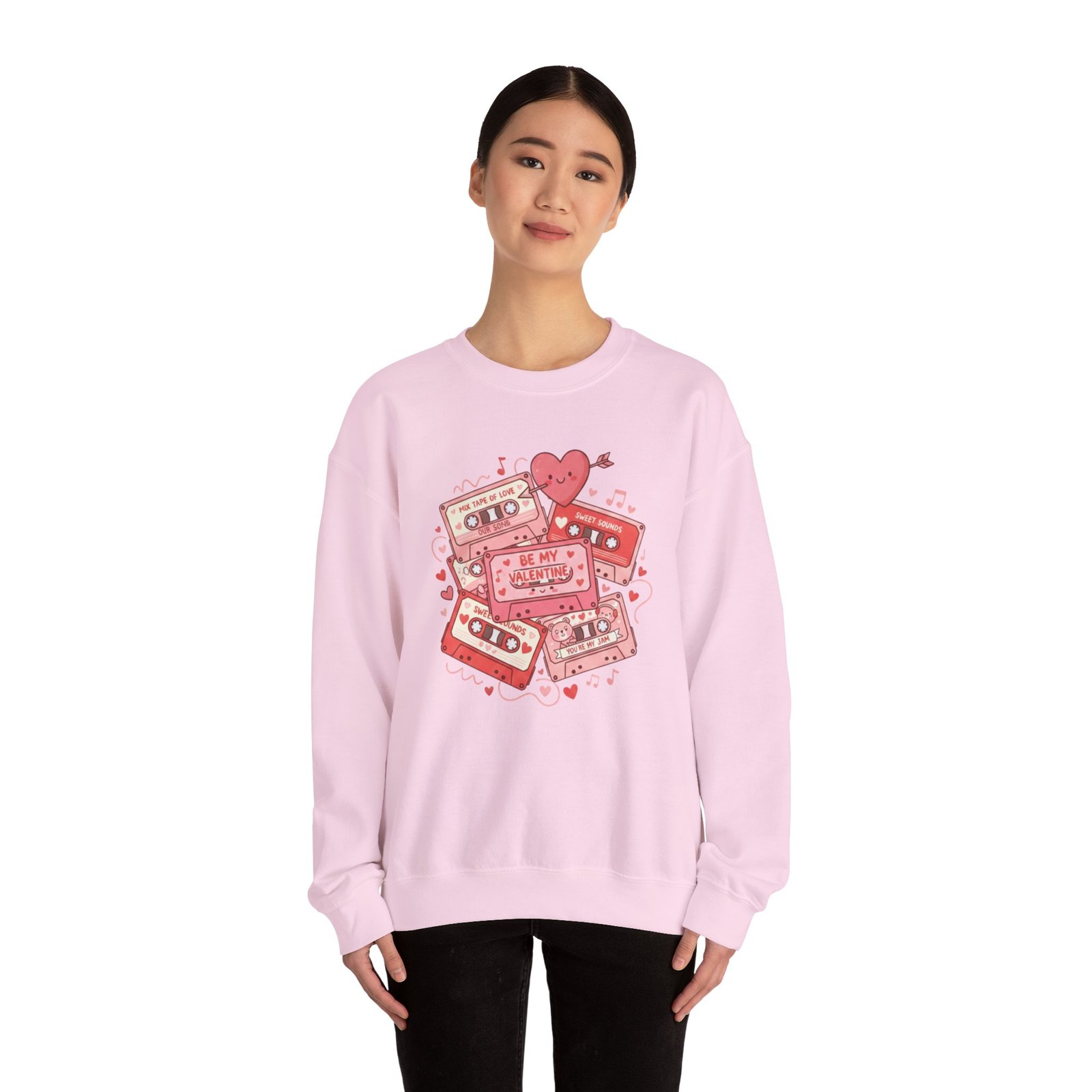 Throw this sweatshirt on and relive mixtape nights and handwritten valentines. The retro cassette stack, scattered hearts, and floating notes feel like a weathered love letter from the 80s/90s — warm, slightly worn, and entirely sincere. It settles around your shoulders with the same comfort as a living-room couch and keeps conversation light and nostalgic on Galentine nights or low-key date evenings. Soft fabric, thoughtful stitching, and a clean crewneck silhouette let the design speak: playful, familiar, and quietly romantic. Whether you’re swapping stories over cocoa or walking under string lights, this sweatshirt layers in personality without shouting. It’s for people who treasure analog memories and want their everyday comfort to echo them.