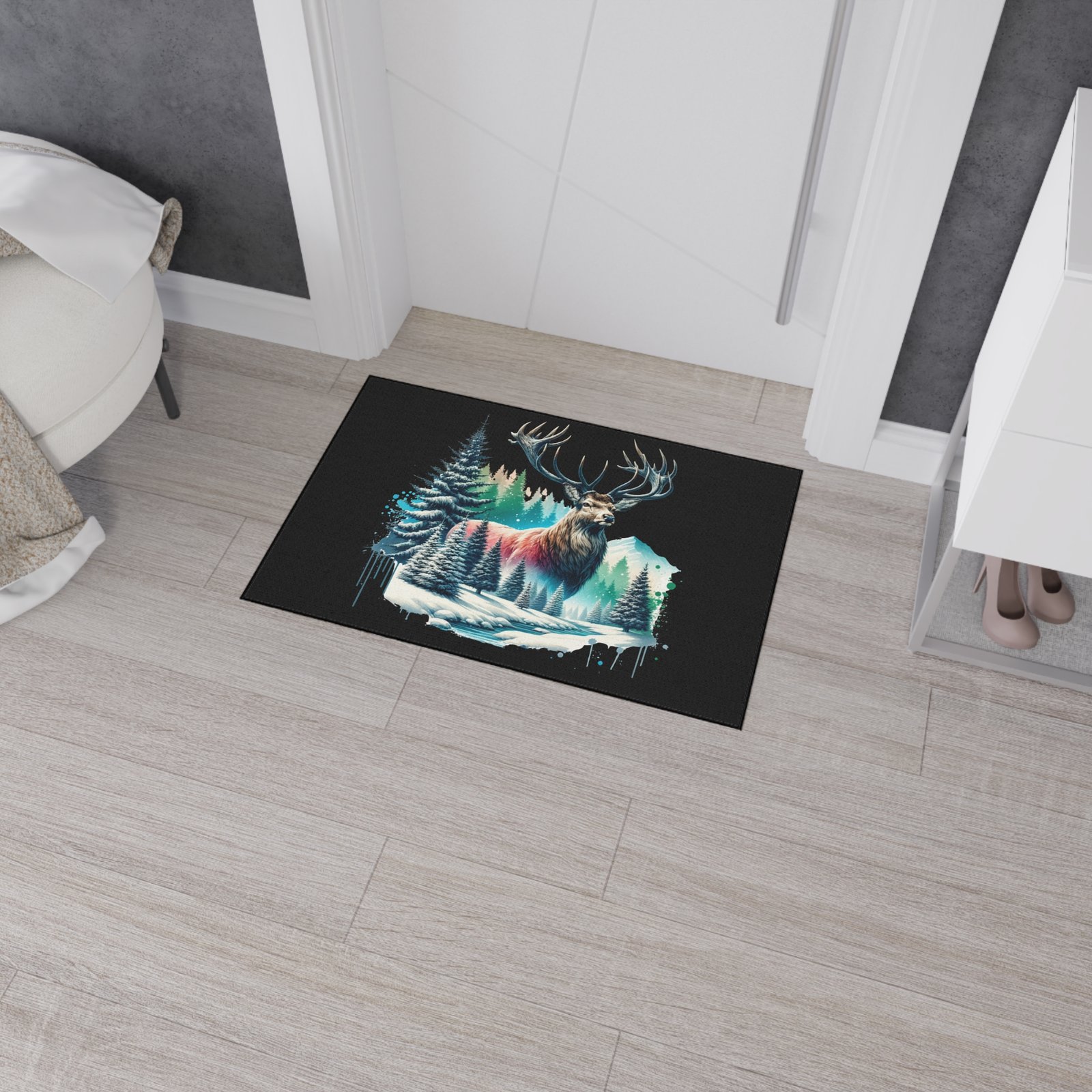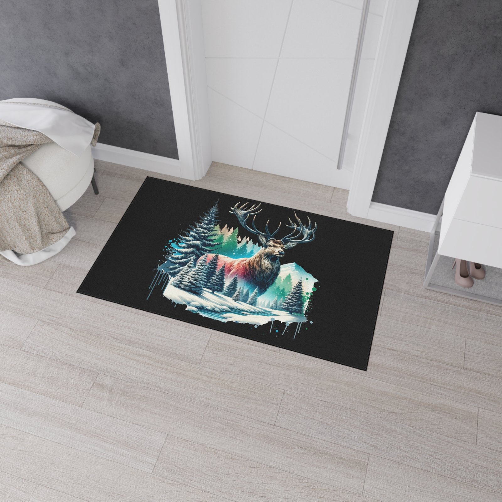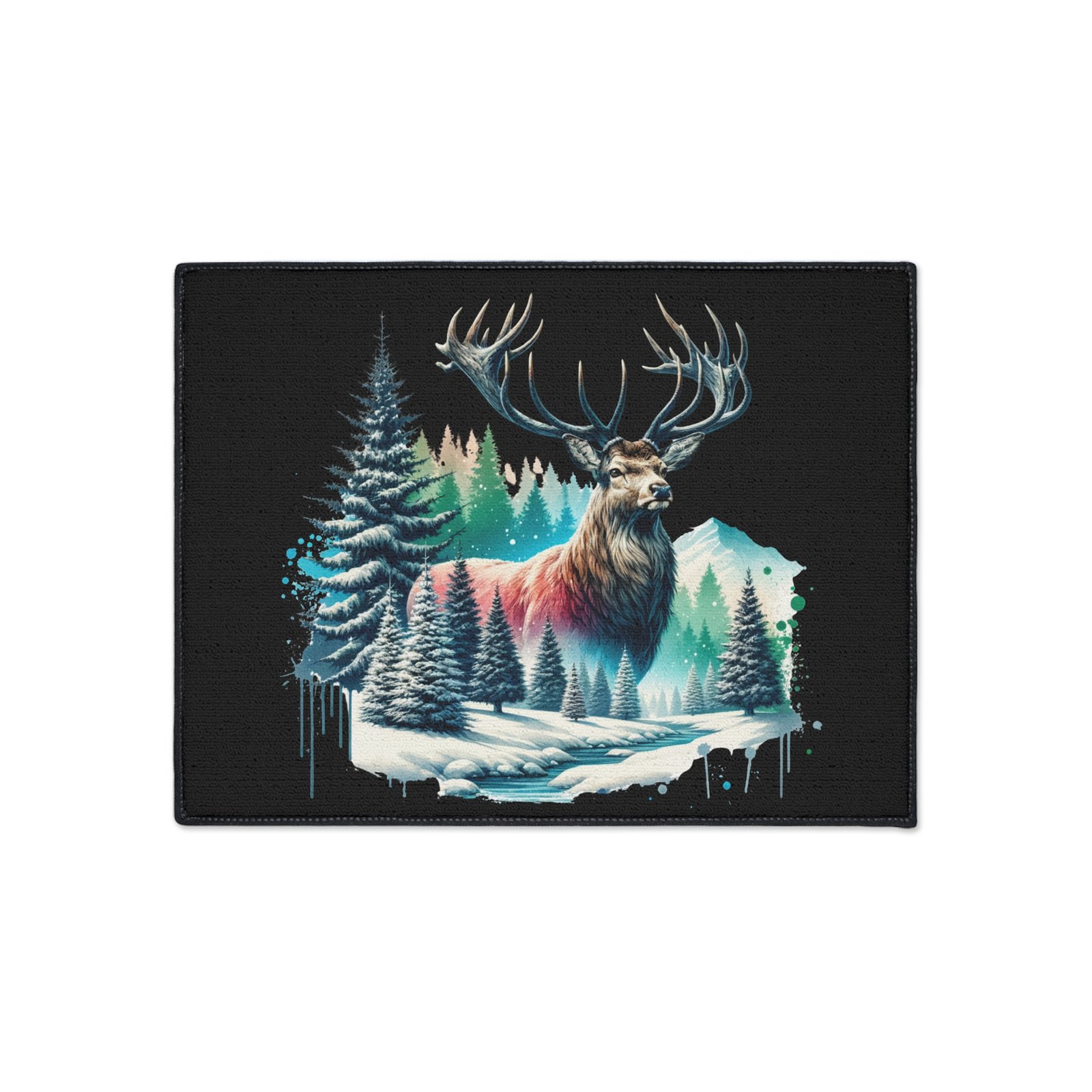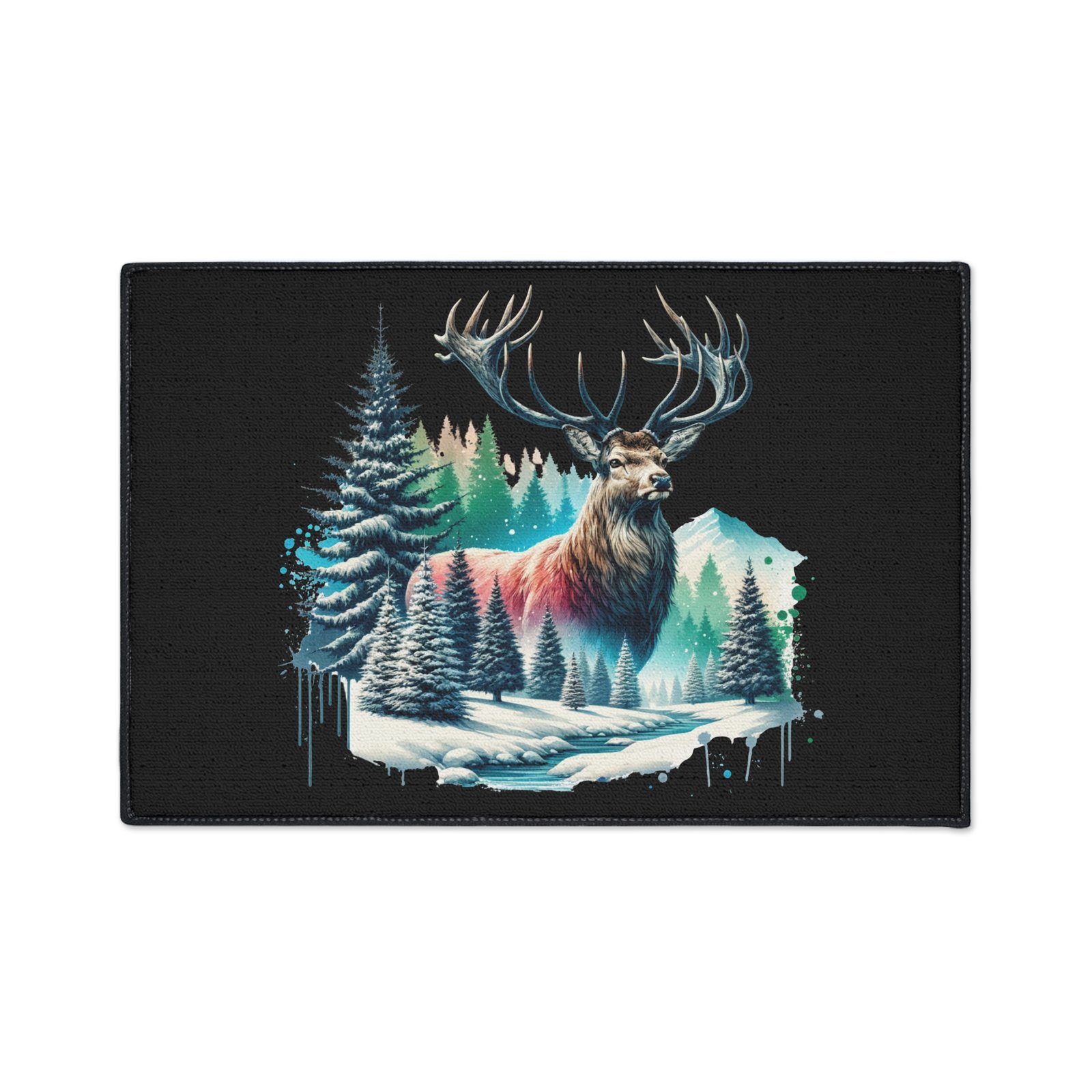 Bring the serene beauty of the wilderness into your space with the Winter Majesty buck Rug. This stunning floor mat features a majestic elk with powerful antlers standing amidst a snowy forest, with frosted pine trees, icy streams, and snow-capped mountains in the background. The vivid artwork is enhanced by splashes of cool blues, soft pinks, and rich forest greens, creating a striking contrast against the deep black background. Perfect for nature lovers and rustic decor enthusiasts, this floor mat adds warmth and character to any room—whether it’s your living area, cabin retreat, or office. Crafted for both durability and comfort, it’s as functional as it is beautiful.