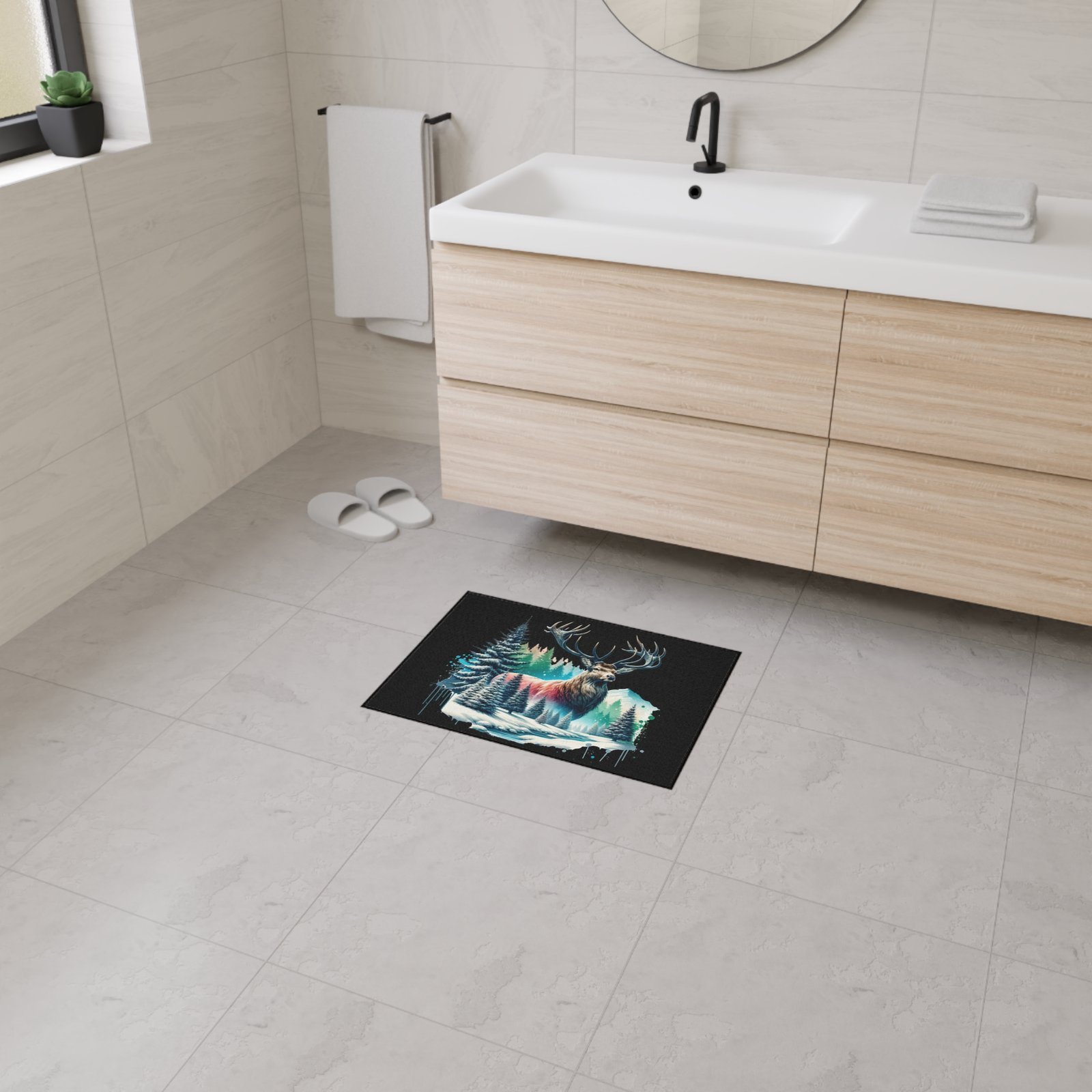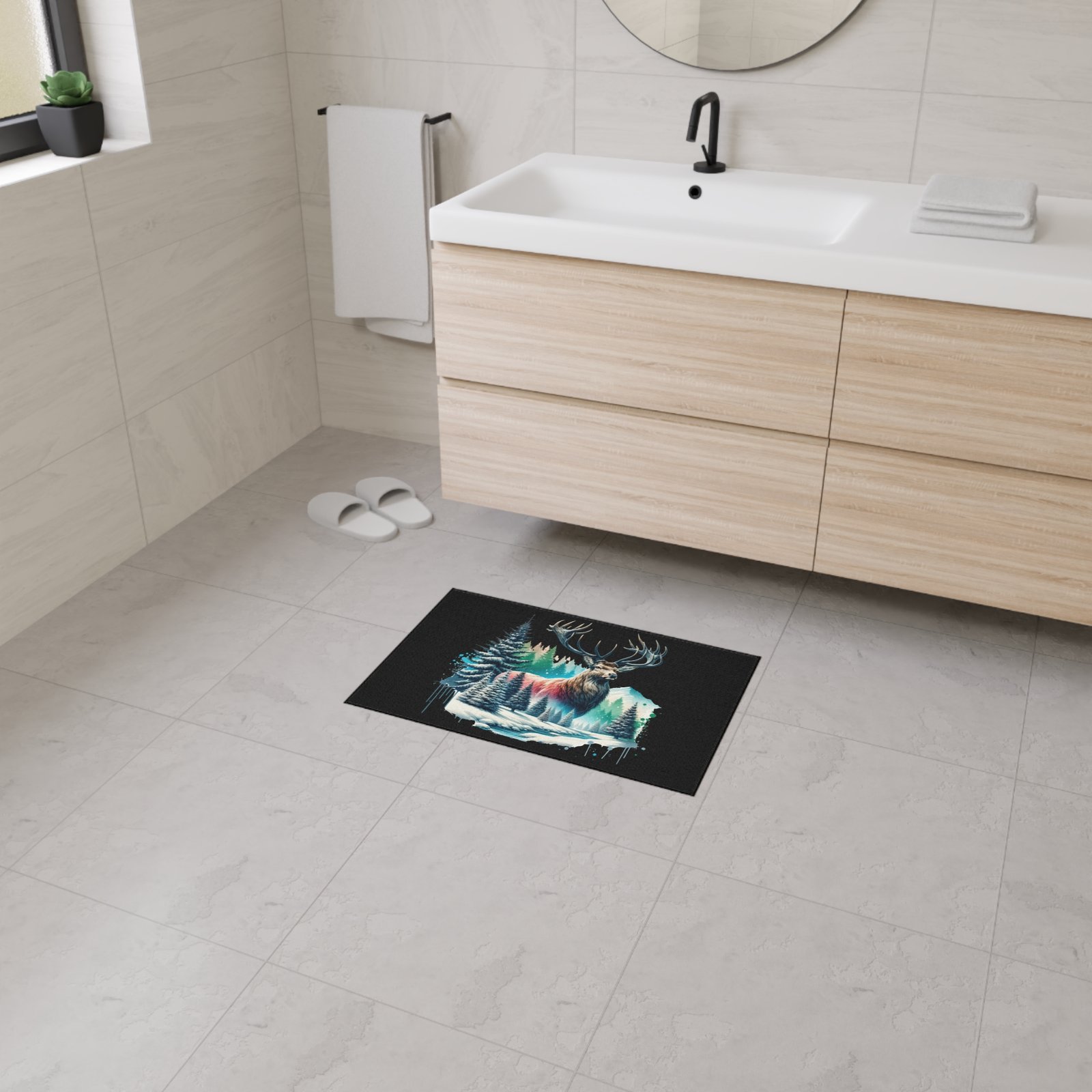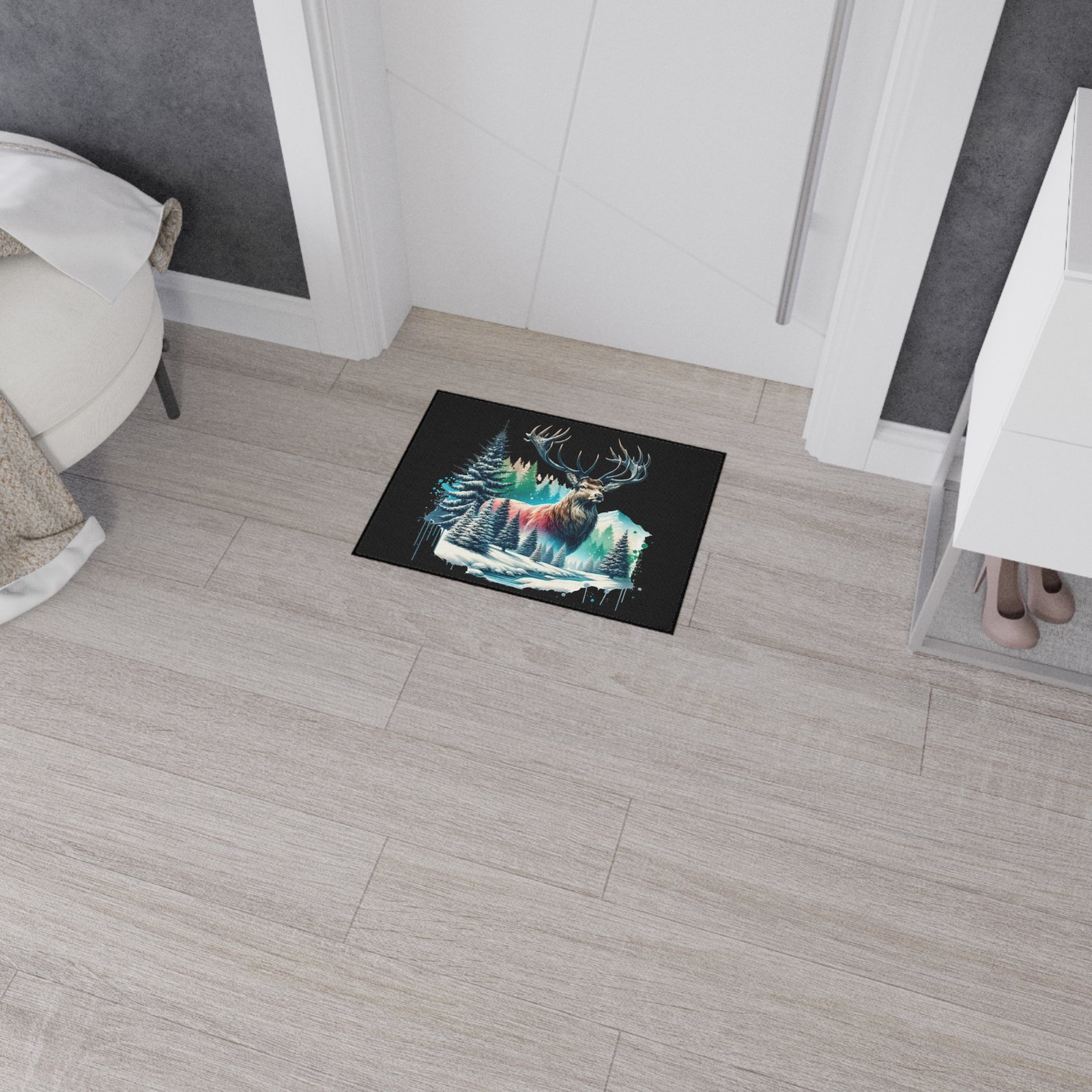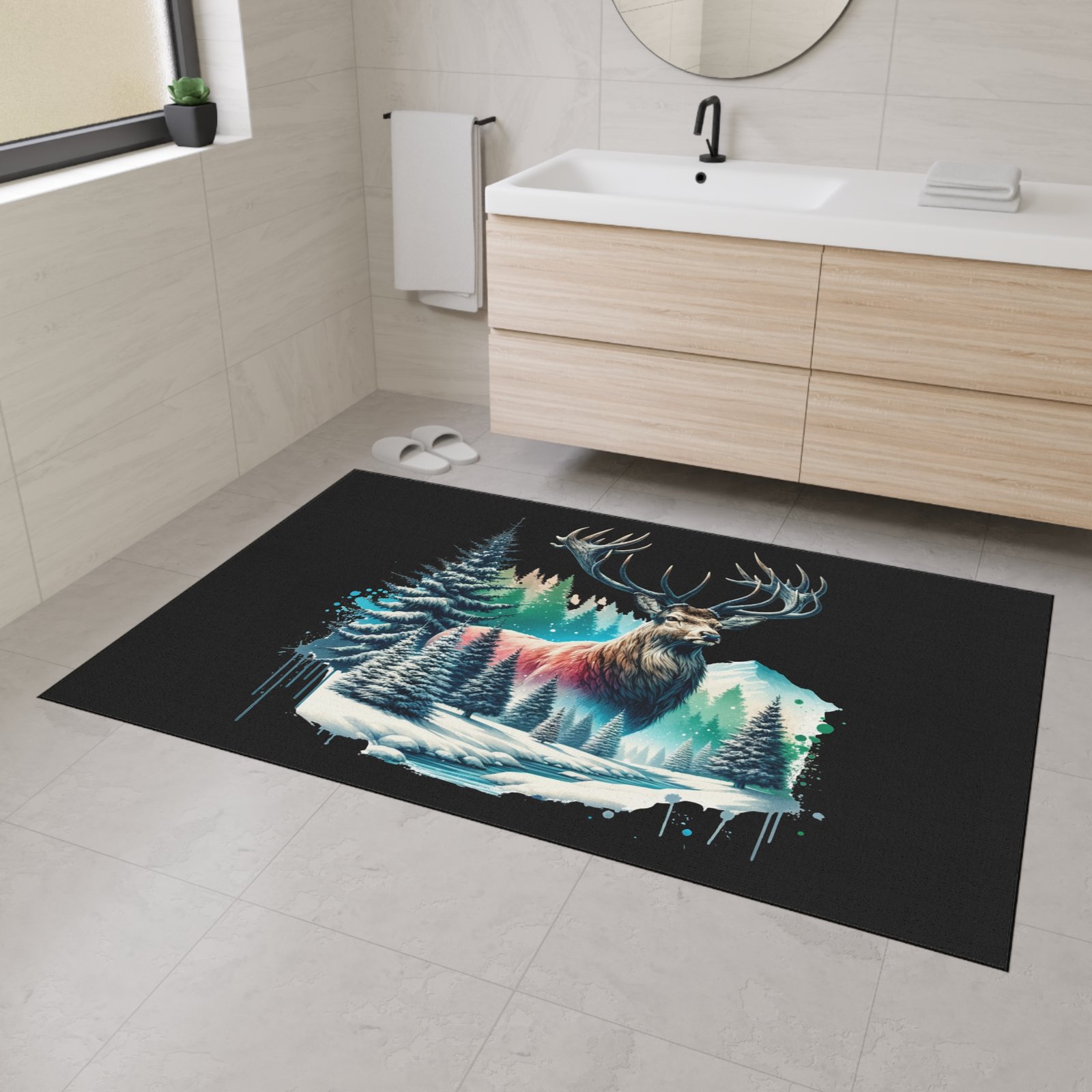 Bring the serene beauty of the wilderness into your space with the Winter Majesty buck Rug. This stunning floor mat features a majestic elk with powerful antlers standing amidst a snowy forest, with frosted pine trees, icy streams, and snow-capped mountains in the background. The vivid artwork is enhanced by splashes of cool blues, soft pinks, and rich forest greens, creating a striking contrast against the deep black background. Perfect for nature lovers and rustic decor enthusiasts, this floor mat adds warmth and character to any room—whether it’s your living area, cabin retreat, or office. Crafted for both durability and comfort, it’s as functional as it is beautiful.