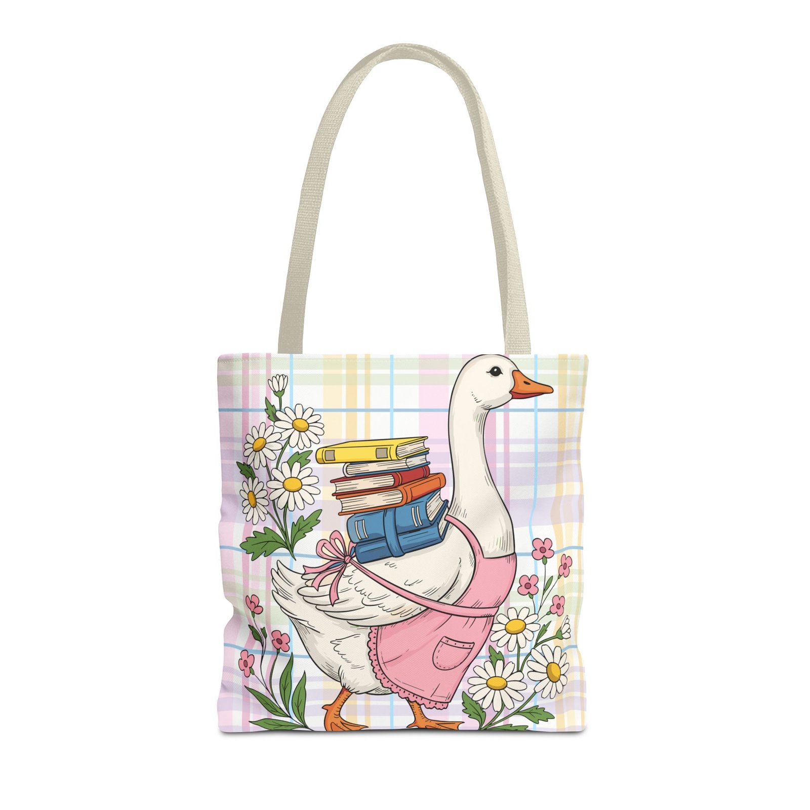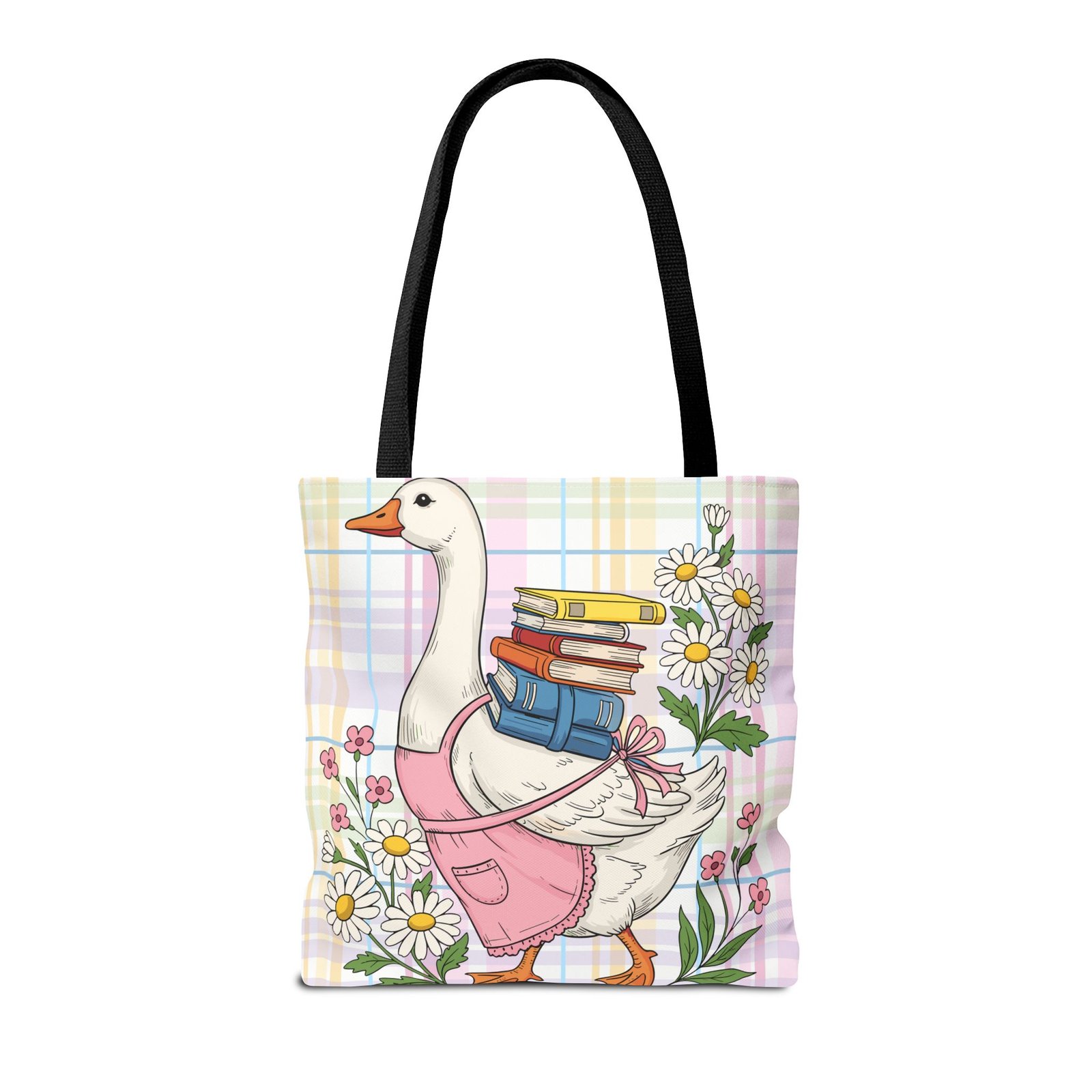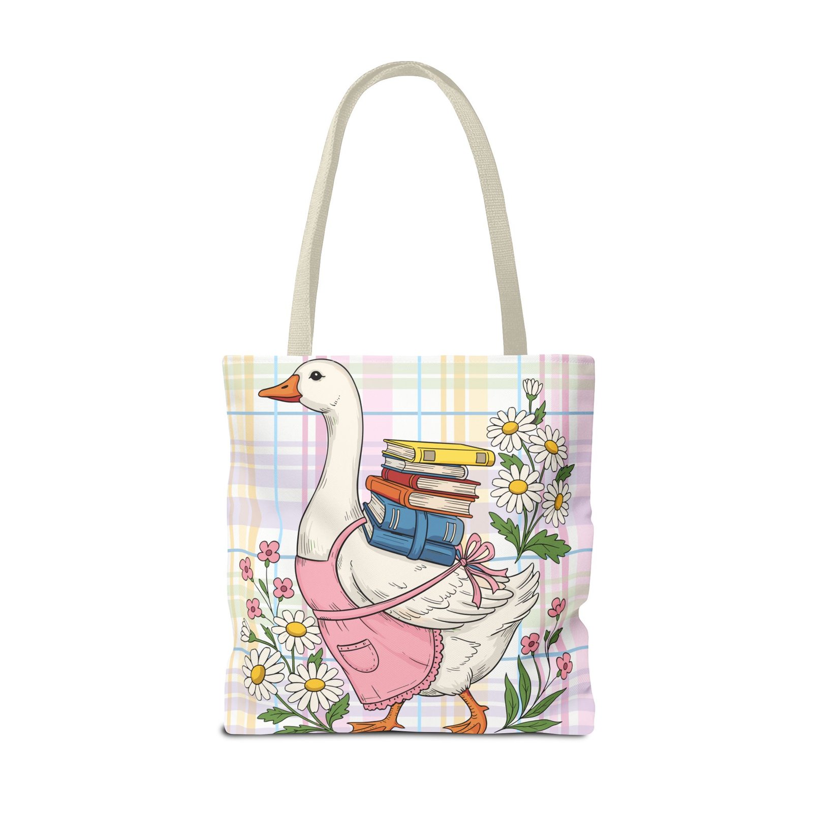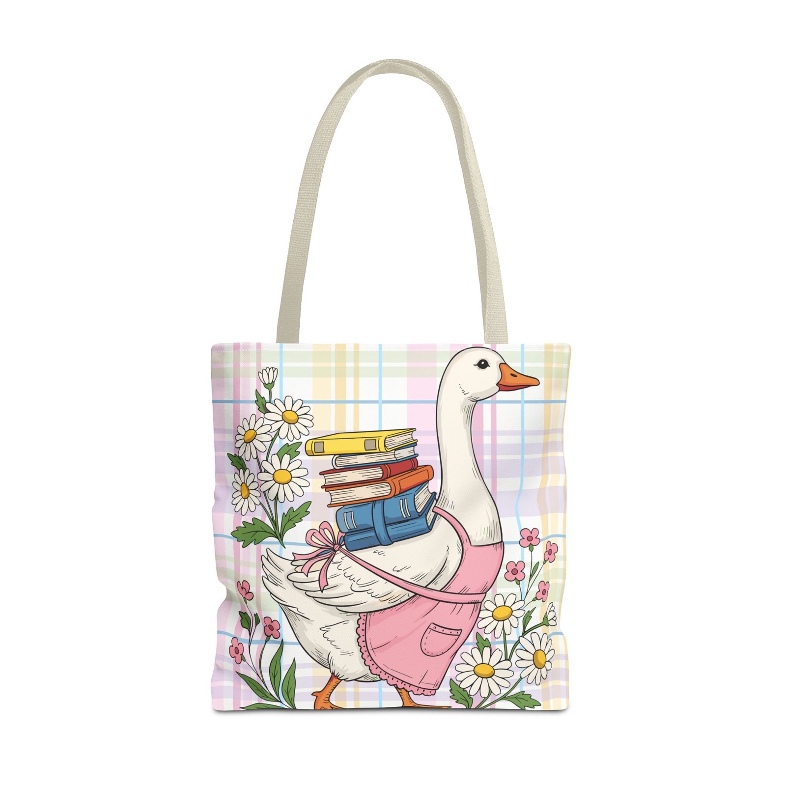 Scholarly Goose Illustration Tote Bag | Cottagecore Pastel Plaid, Daisy Accent