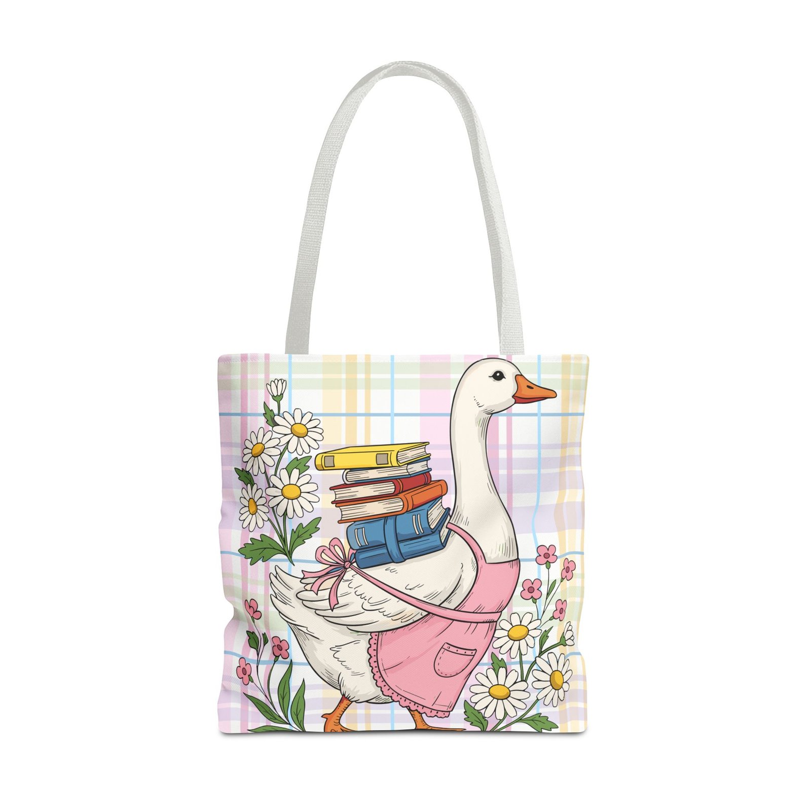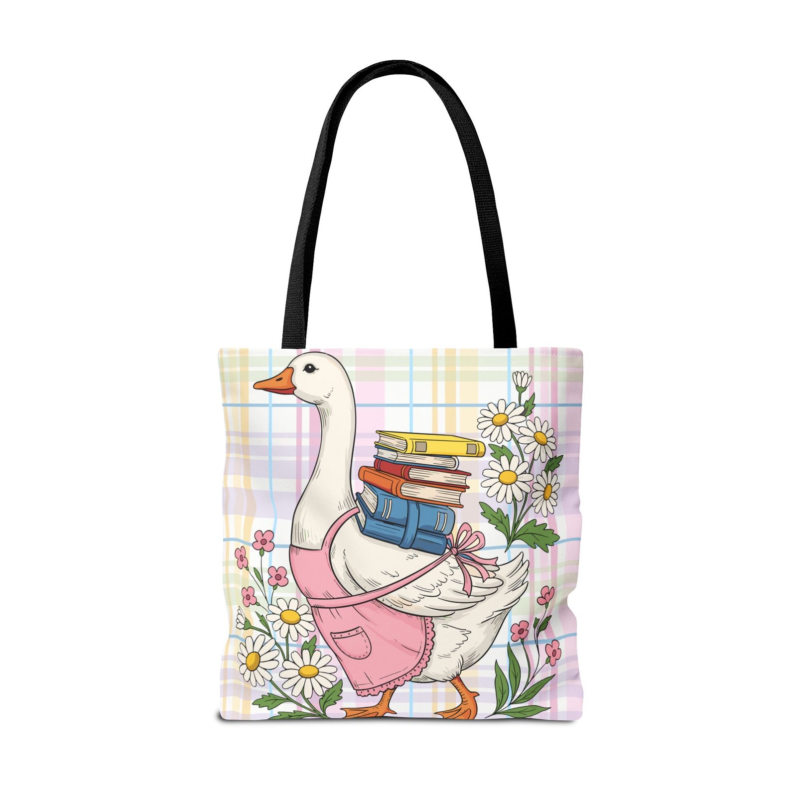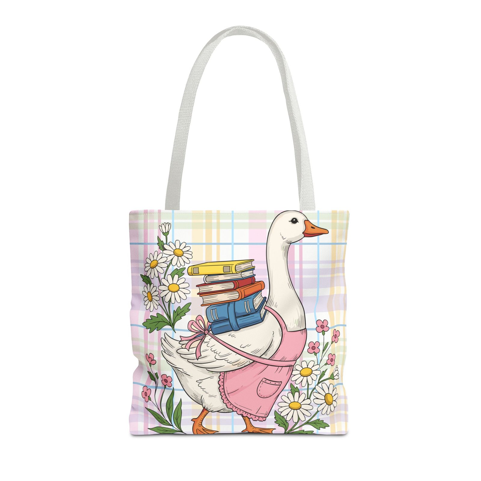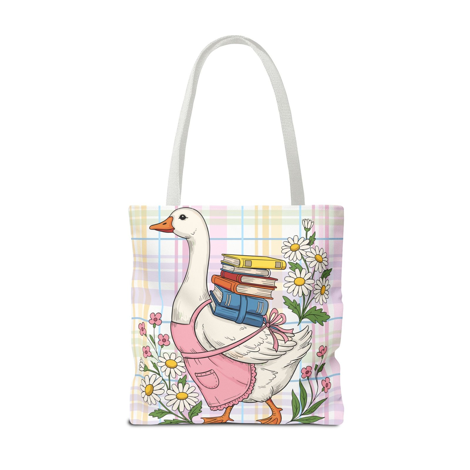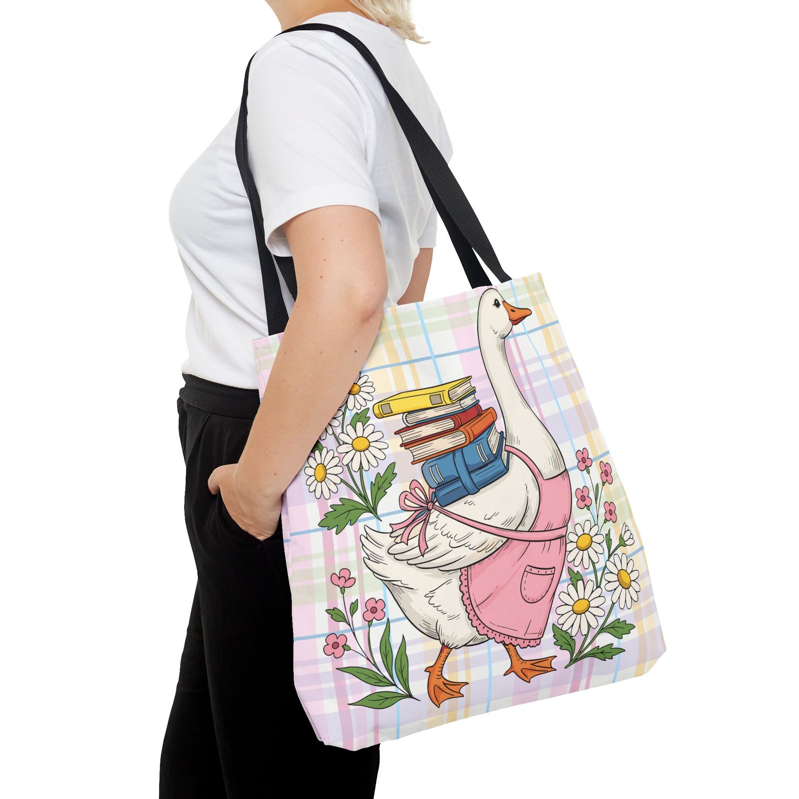 Scholarly Goose Illustration Tote Bag | Cottagecore Pastel Plaid, Daisy Accent