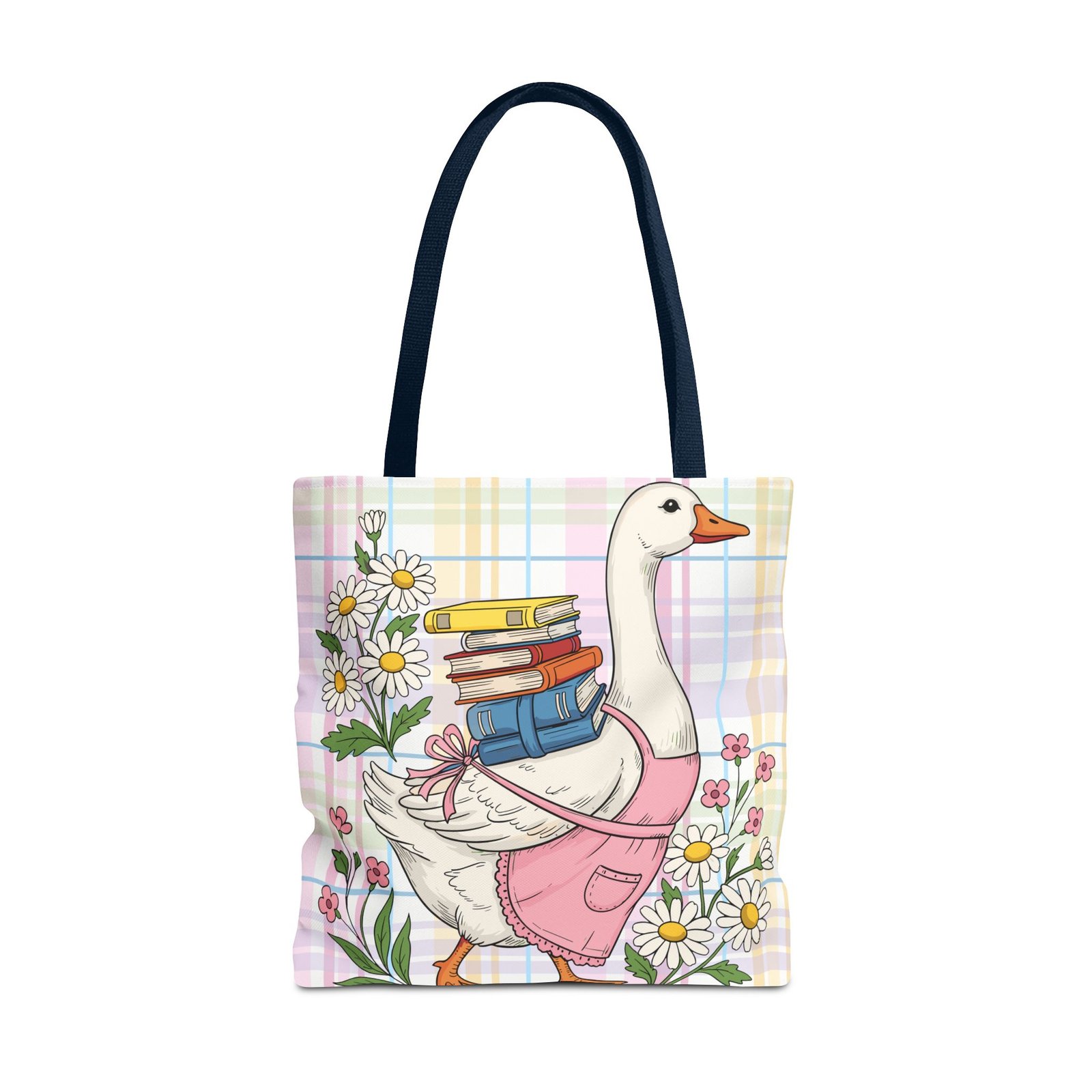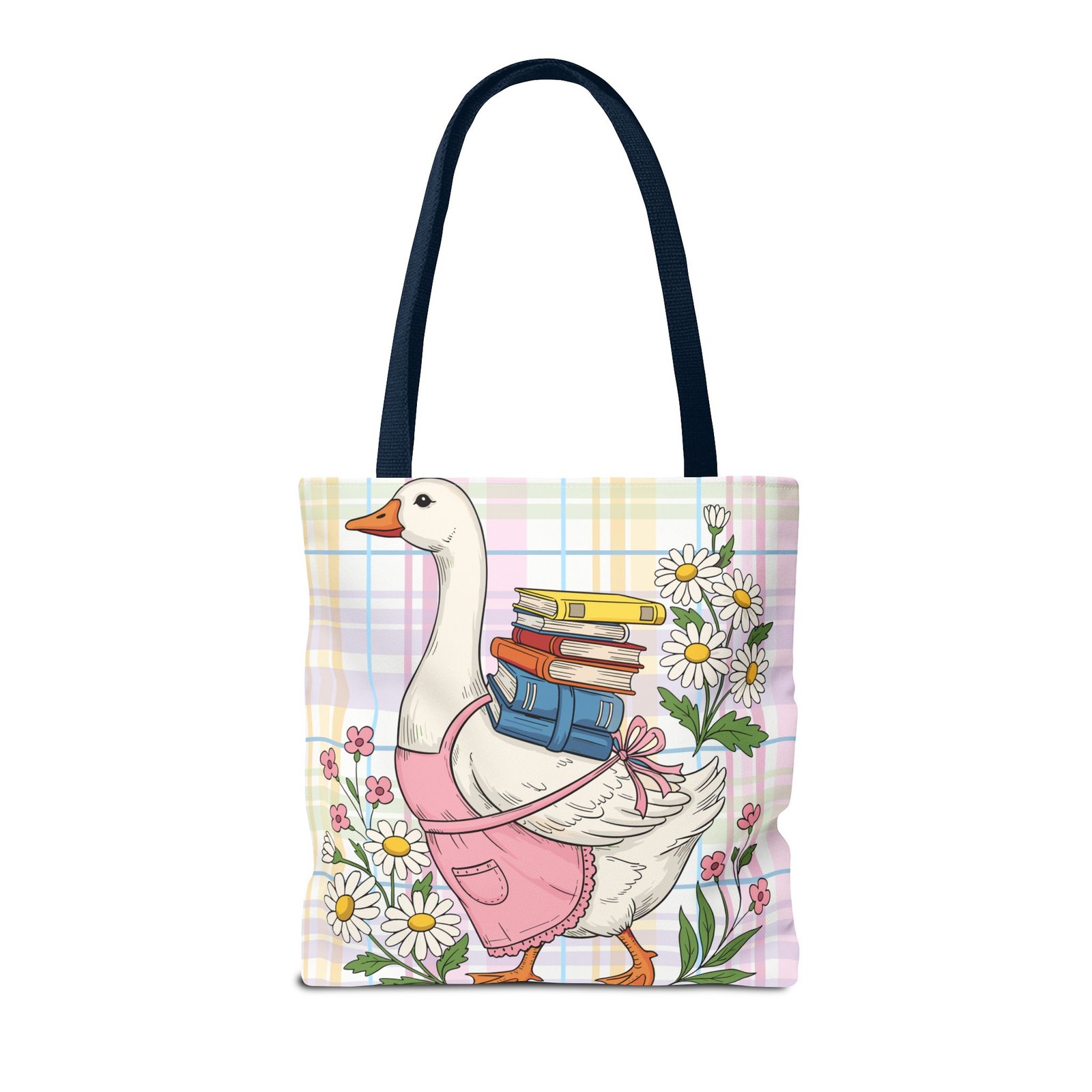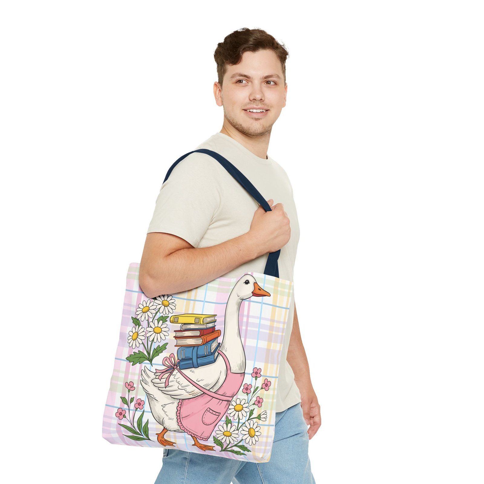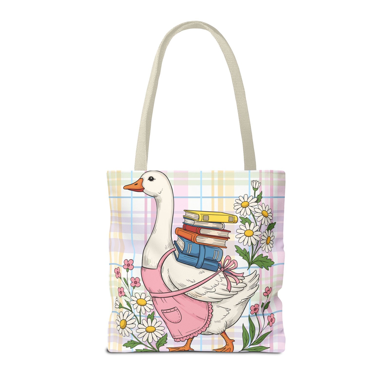 Scholarly Goose Illustration Tote Bag | Cottagecore Pastel Plaid, Daisy Accent