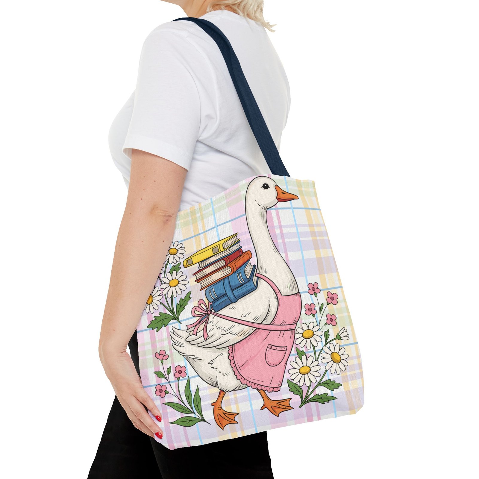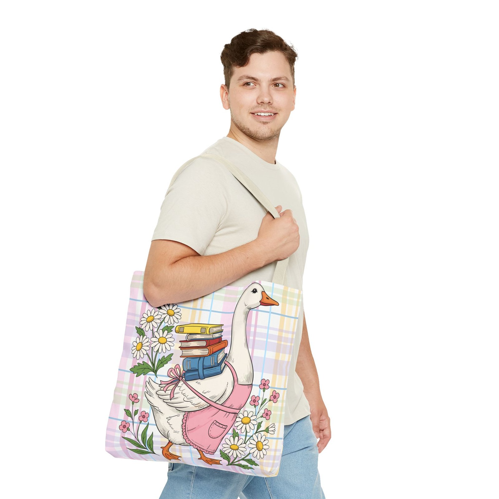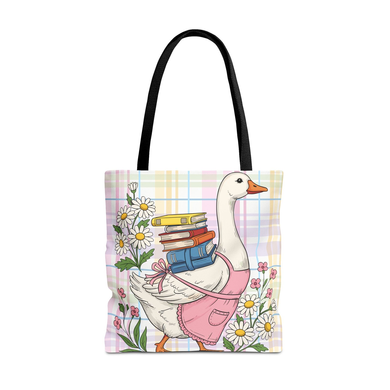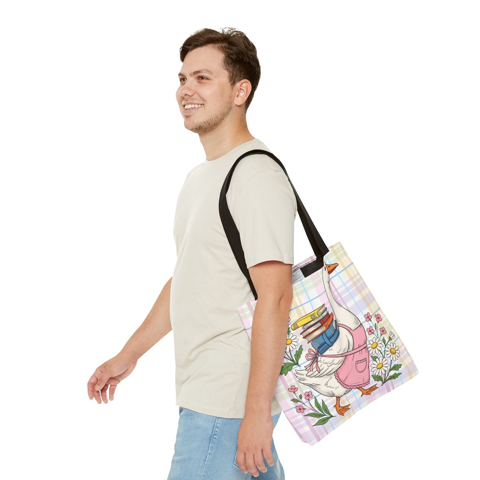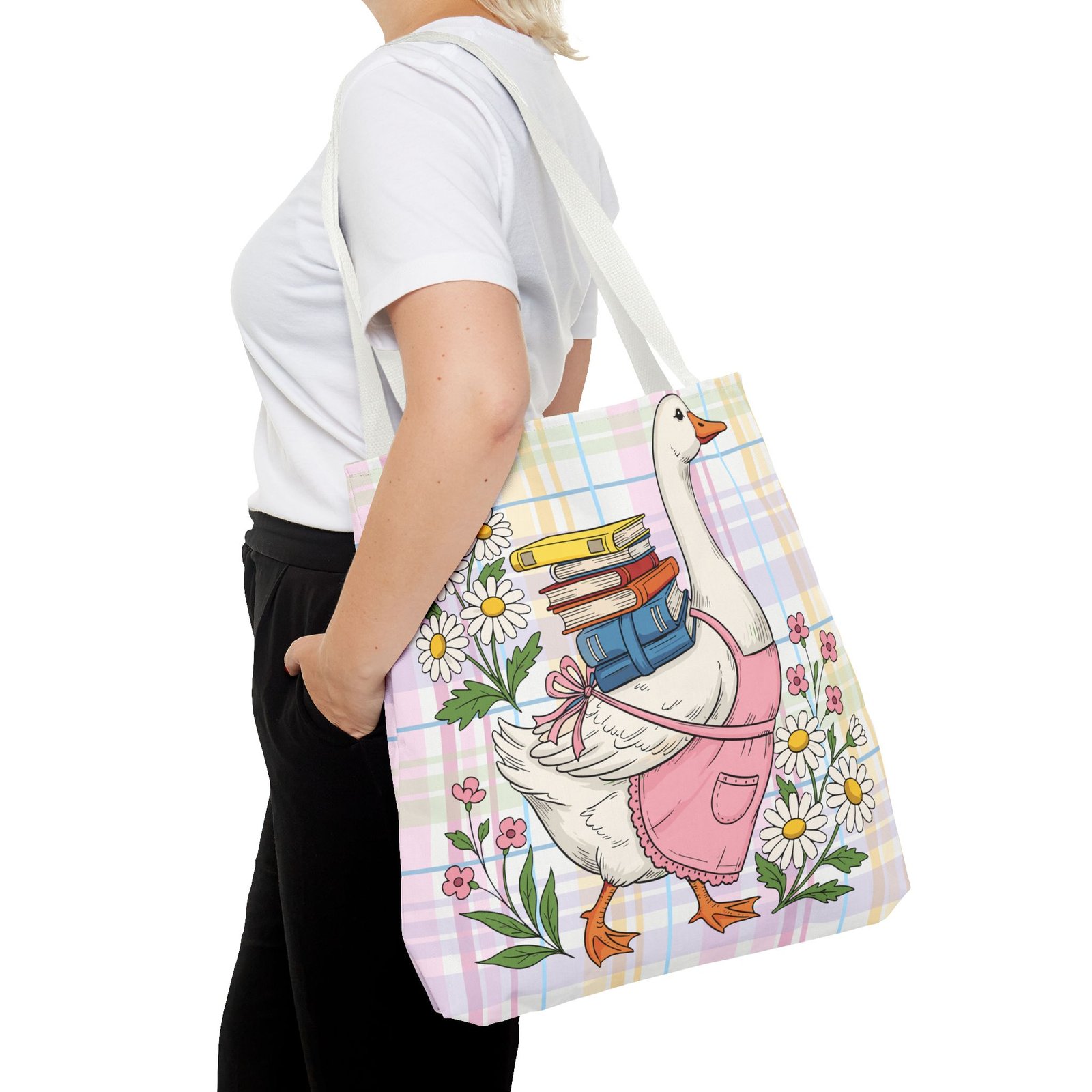 Scholarly Goose Illustration Tote Bag | Cottagecore Pastel Plaid, Daisy Accent
