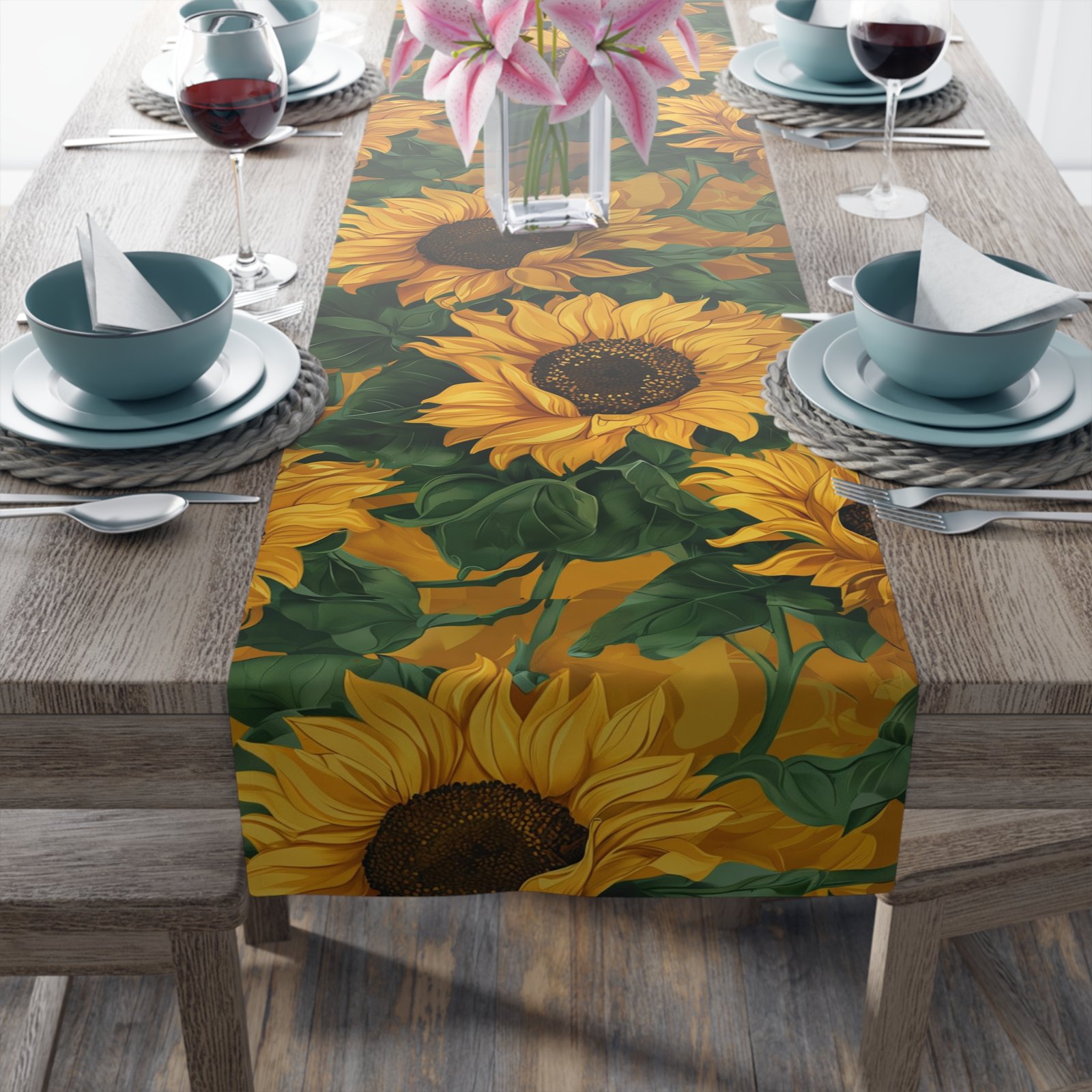 Brighten up your dining space with this stunning sunflower table runner, featuring a bold and cheerful floral design that brings warmth and charm to any table setting. Perfect for everyday use, seasonal décor, or special gatherings, it adds a touch of rustic elegance to your home. Whether you’re hosting a festive dinner, decorating for summer, or simply adding a pop of color to your dining room, this sunflower table runner is the perfect finishing touch. Relevant for dinner parties, summer decor, and adding color to your dining room.