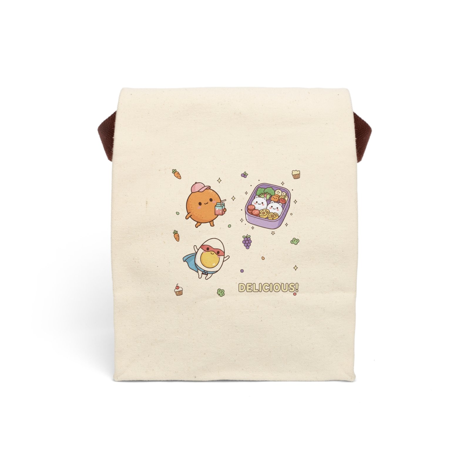 This canvas lunch bag brings playful charm to everyday meals. The roll-top silhouette keeps contents secure while the flat-bottom holds bento boxes upright. A cheerful “Super Food” print — a caped soft-boiled egg, a sunny orange friend, and tiny rice-bear lunches — brightens your day and makes packing lunch feel fun. Made from sturdy natural cotton canvas, the bag is soft to the touch yet built for daily wear. Contrast brown straps are stitched for comfortable carrying, and the adjustable roll-top with hook-and-loop tape lets you compress smaller lunches or expand for larger meal days. Lightweight, reusable, and easy to wipe clean, it’s a simple eco-conscious swap from disposable bags that adds personality to school runs, work lunches, or weekend picnics.