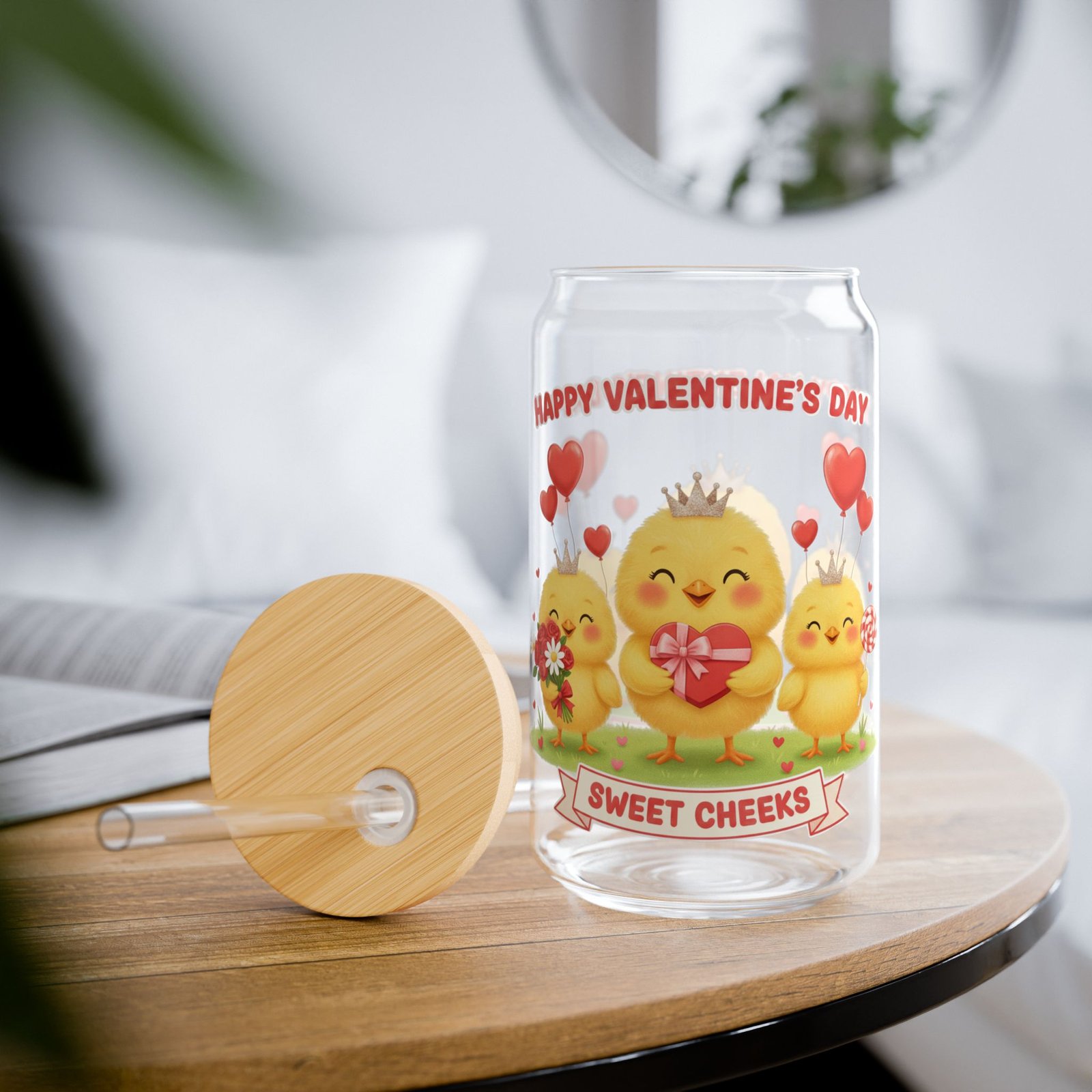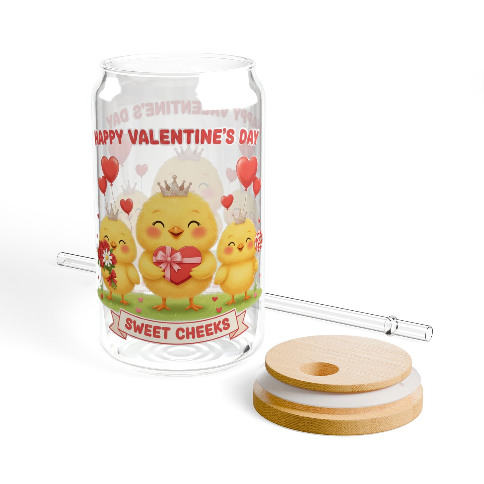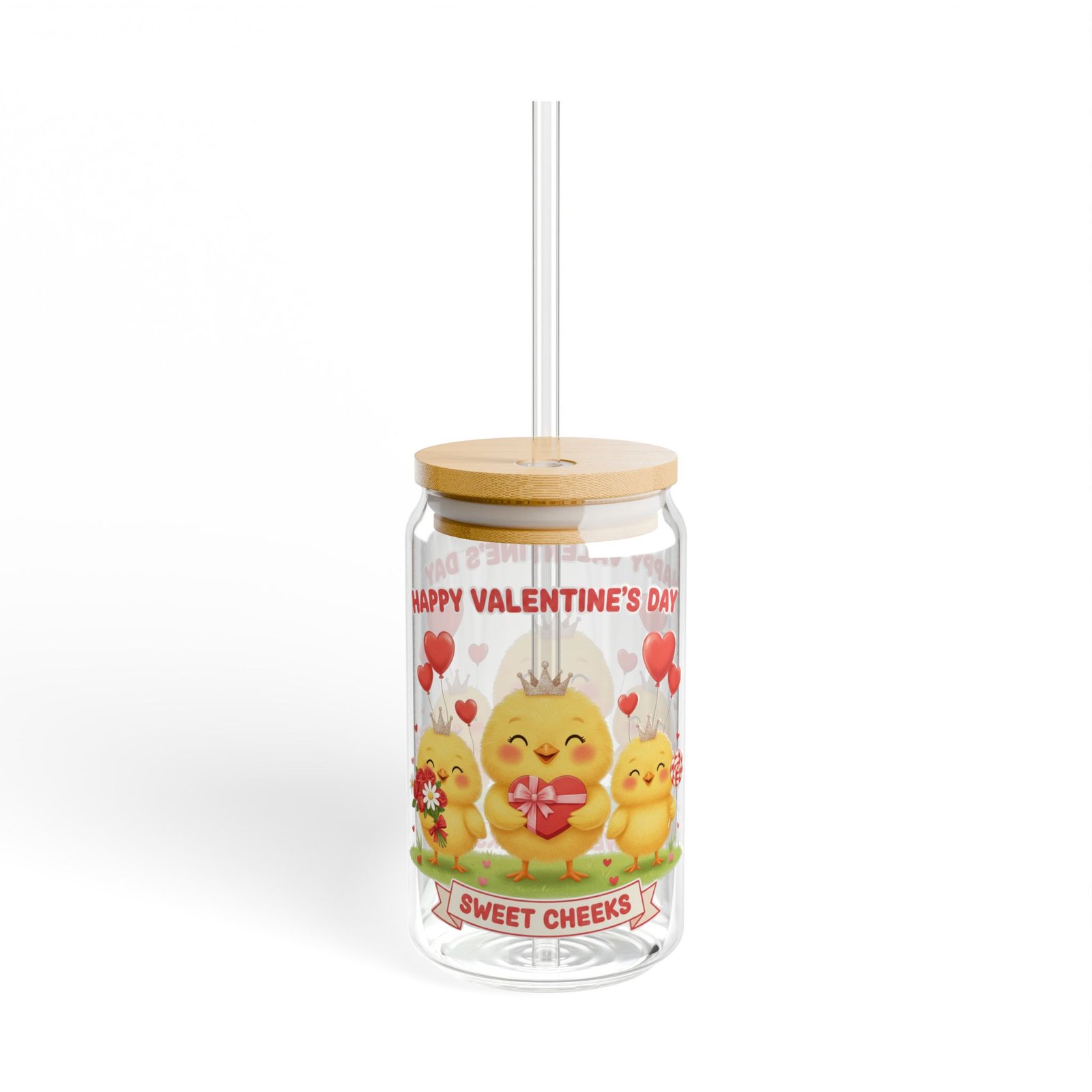 This 16oz can-shaped sipper glass brings a playful, cozy energy to everyday drinks. The wrap-around Valentine’s design — three sunny baby chicks, red hearts, and a “Sweet Cheeks” banner — feels like a little celebration with every sip. The iconic soda-can silhouette fits naturally in hand and looks cheerful on a kitchen shelf, picnic blanket, or cozy countertop. Choose the version with a natural bamboo push-lid and clear Tritan straw to cut down on disposable plastics and keep beverages spill-resistant while you’re on the go. The tempered glass is clear and sturdy, so your colors pop and your smoothies, iced coffees, and iced teas look as good as they taste. Hand wash gently to preserve the print and bamboo lid finish.