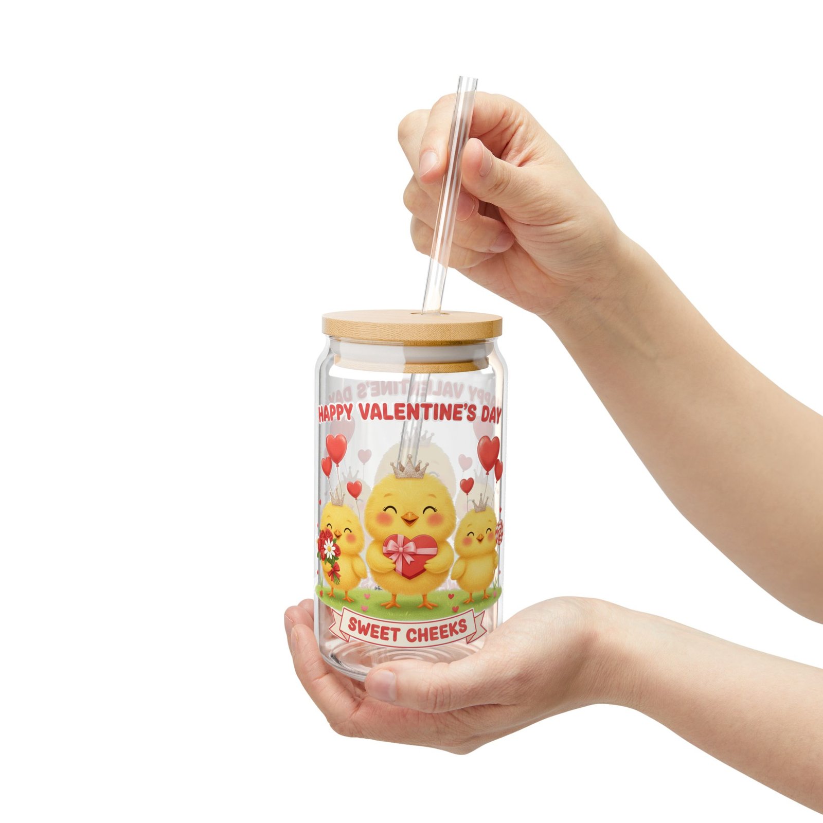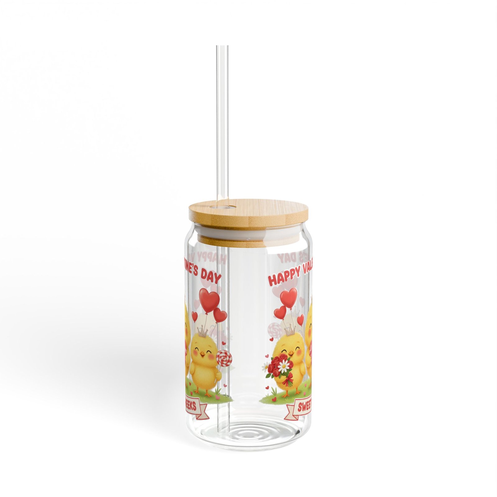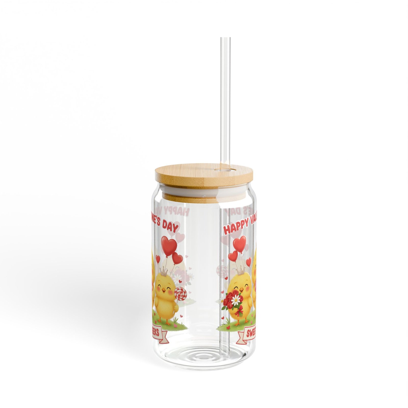 This 16oz can-shaped sipper glass brings a playful, cozy energy to everyday drinks. The wrap-around Valentine’s design — three sunny baby chicks, red hearts, and a “Sweet Cheeks” banner — feels like a little celebration with every sip. The iconic soda-can silhouette fits naturally in hand and looks cheerful on a kitchen shelf, picnic blanket, or cozy countertop. Choose the version with a natural bamboo push-lid and clear Tritan straw to cut down on disposable plastics and keep beverages spill-resistant while you’re on the go. The tempered glass is clear and sturdy, so your colors pop and your smoothies, iced coffees, and iced teas look as good as they taste. Hand wash gently to preserve the print and bamboo lid finish.