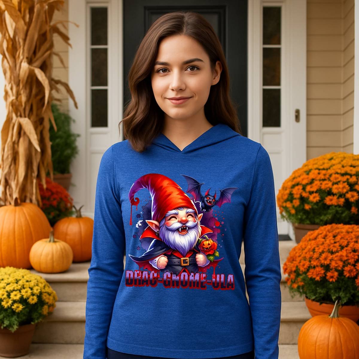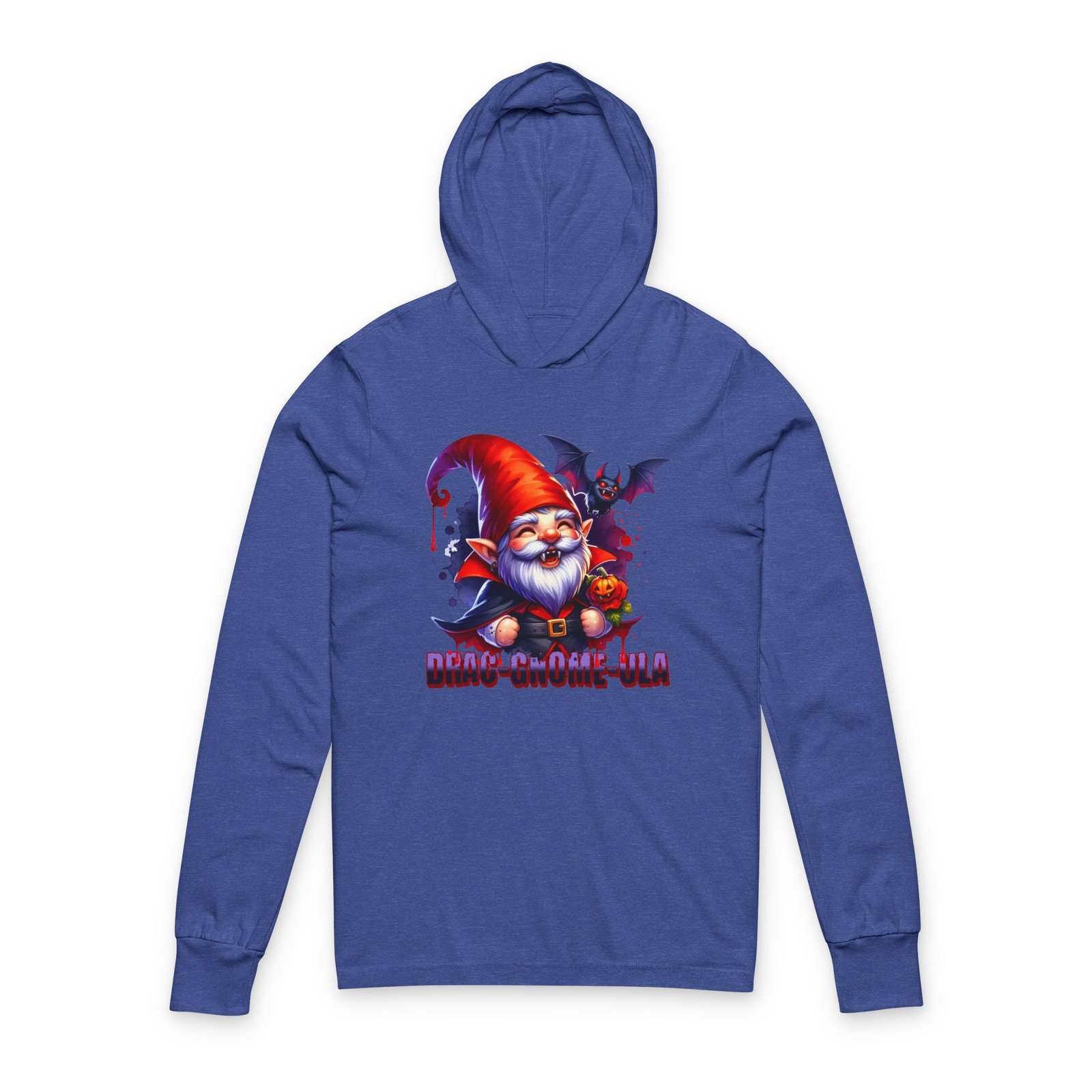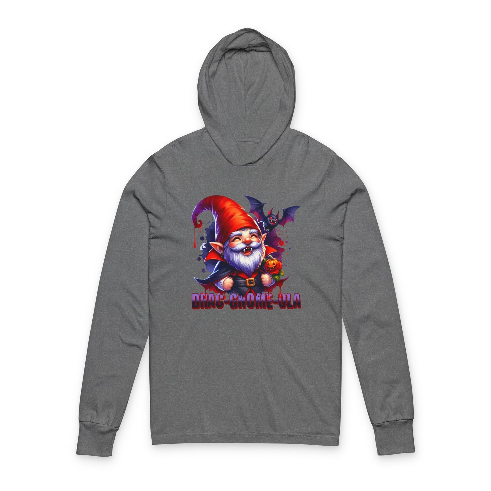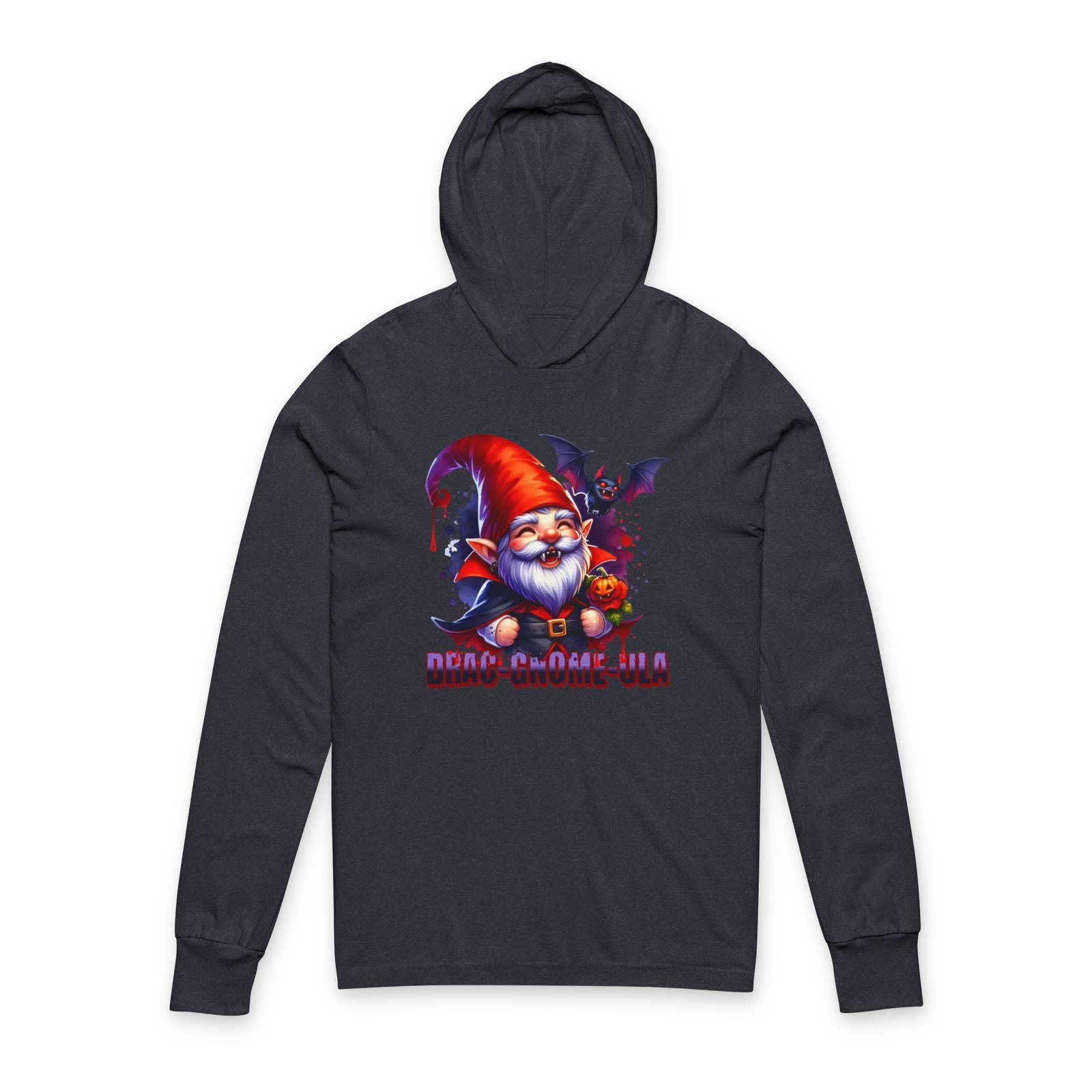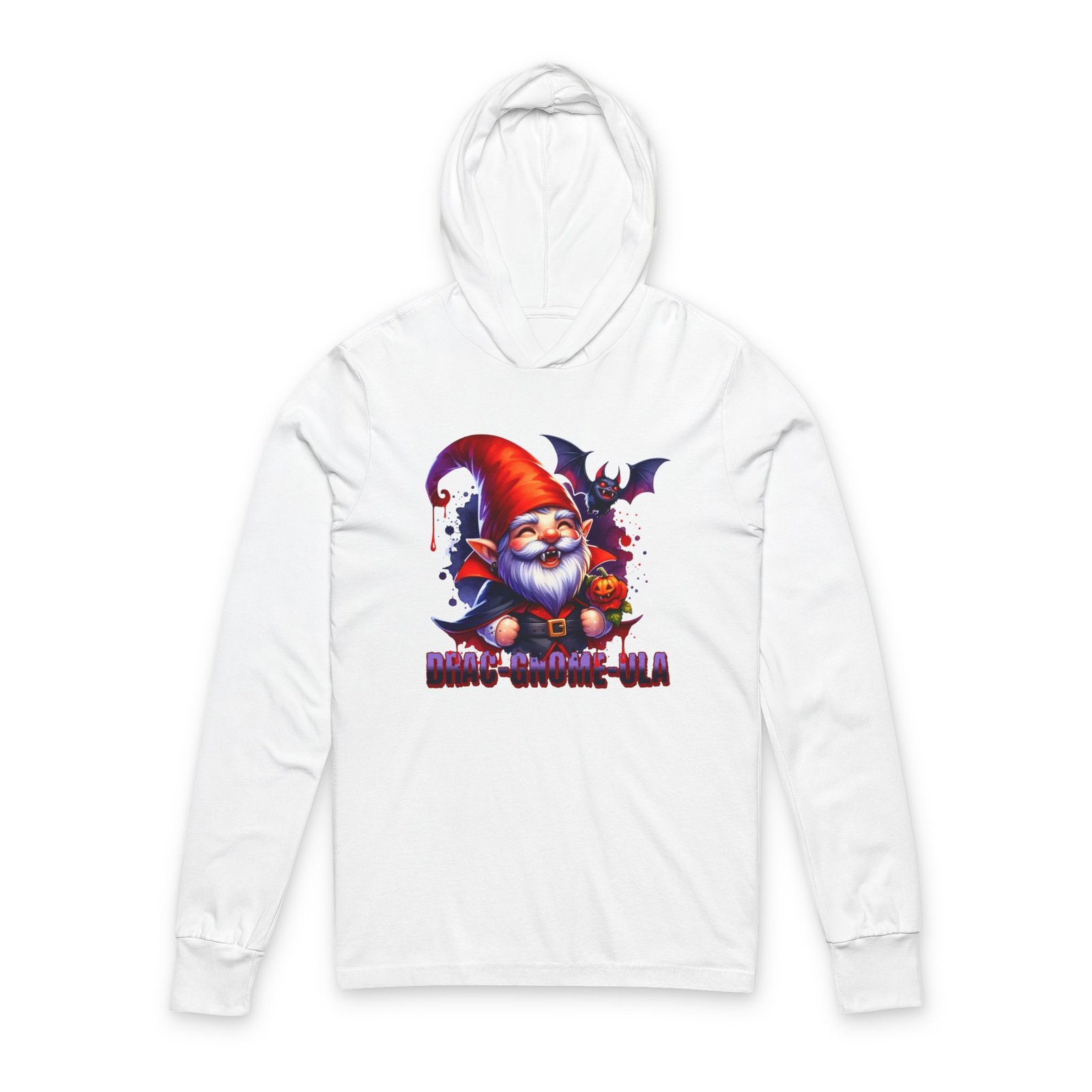 Add a little fang-tastic fun to your Halloween wardrobe with this Drag-Gnome-ula long sleeve hooded tee. Featuring a mischievous vampire gnome with sharp fangs, a glowing jack-o’-lantern, and his spooky bat sidekick, this design is equal parts creepy and cute. Printed in bold, vibrant colors, it’s perfect for anyone who loves playful Halloween fashion. Made with soft, breathable fabric, this unisex hooded tee is lightweight and comfortable, making it ideal for layering on chilly October nights. Perfect for Halloween enthusiasts and those who enjoy spooky cute fashion. Product features – 100% airlume combed and ringspun cotton – Regular fit for casual wear experience – Side-seamed construction for longer shirt shape – Fabric weight: 3.8 oz/yd² (128.84 g/m²) – Crossover “V” at the neckline Care instructions – Machine wash: cold (max 30C or 90F), gentle cycle – Non-chlorine: bleach as needed – Tumble dry: low heat – Iron, steam or dry: low heat – Do not dryclean