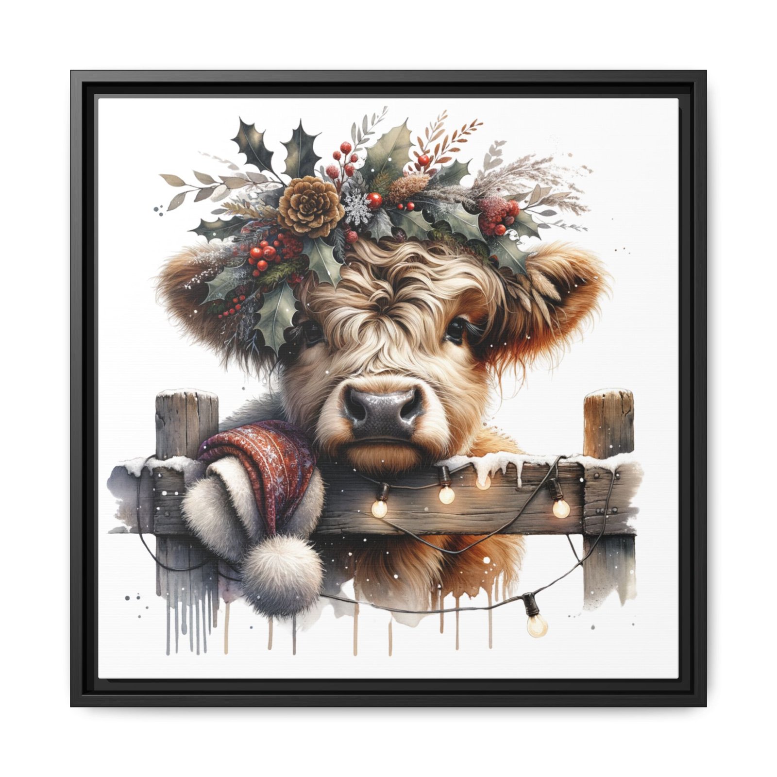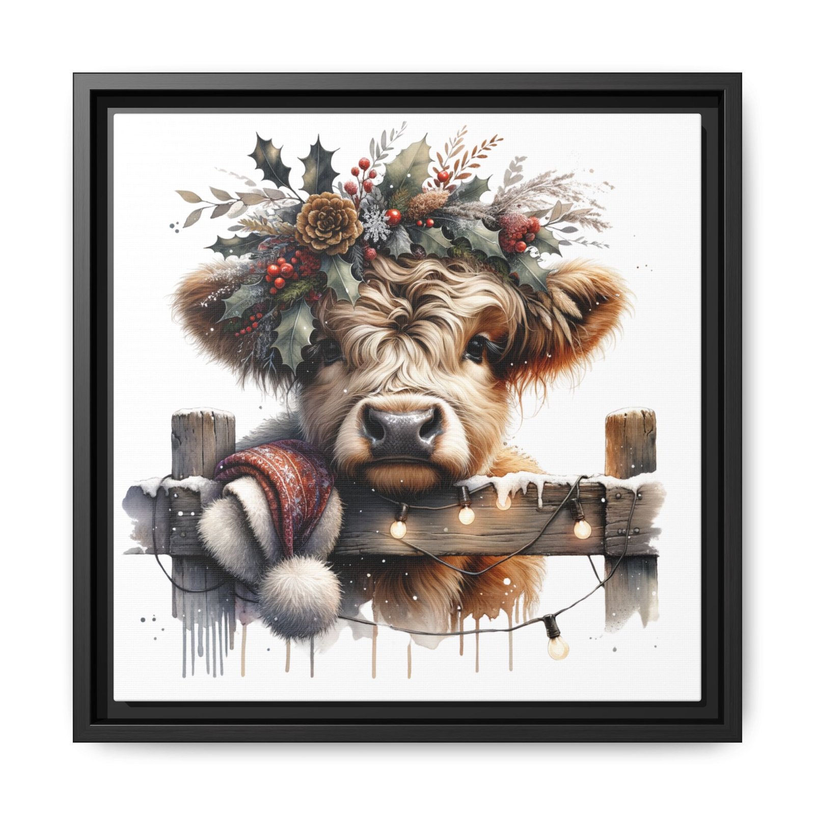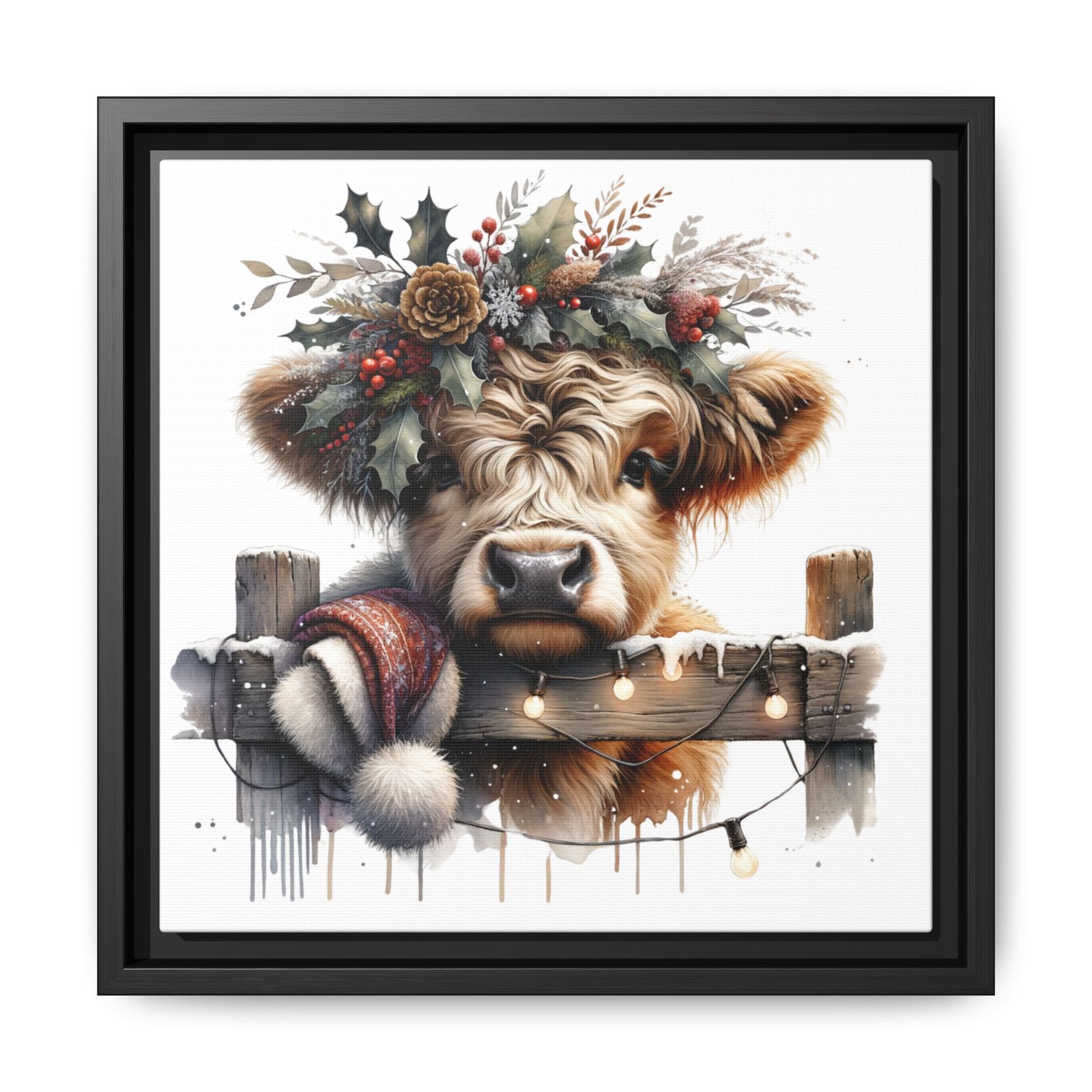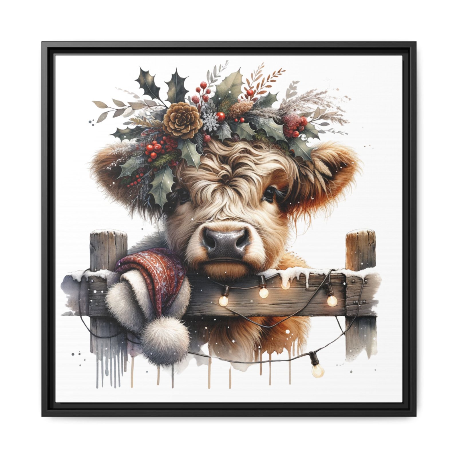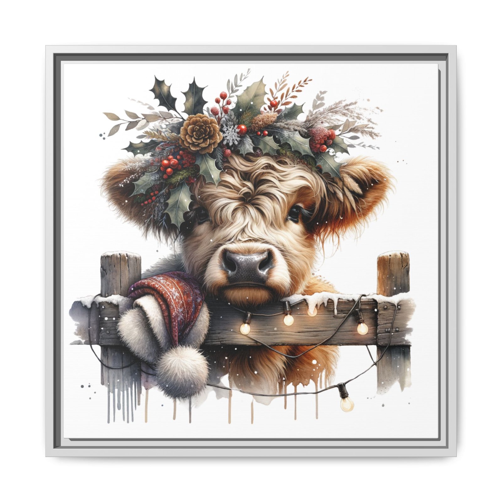 Bring rustic holiday charm into your home with this festive wall art featuring a fluffy Highland cow adorned with holly, berries, and winter greenery. Perfect for those looking to add a touch of country warmth and Christmas spirit to their decor. Ideal for holiday enthusiasts and fans of farmhouse-inspired design.
