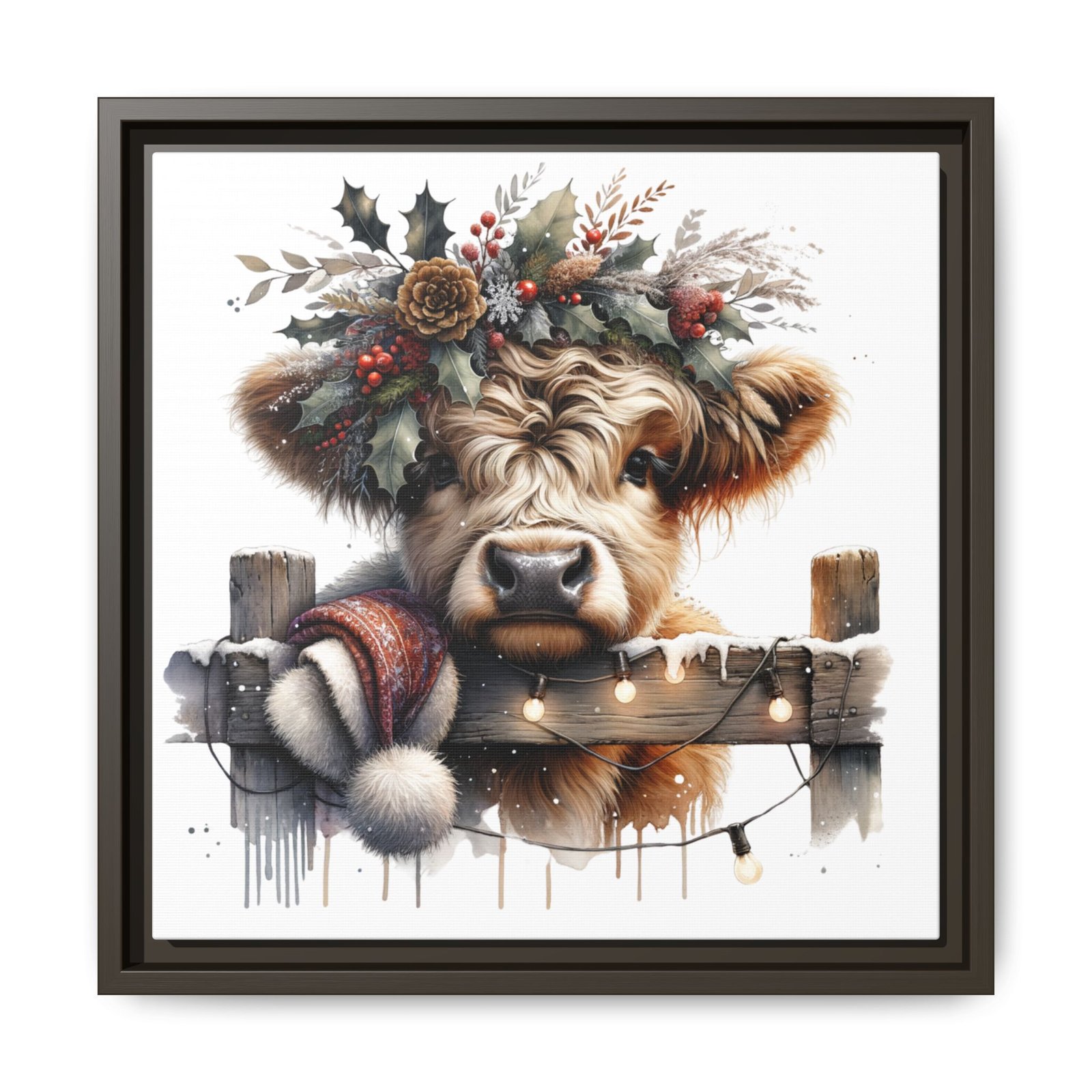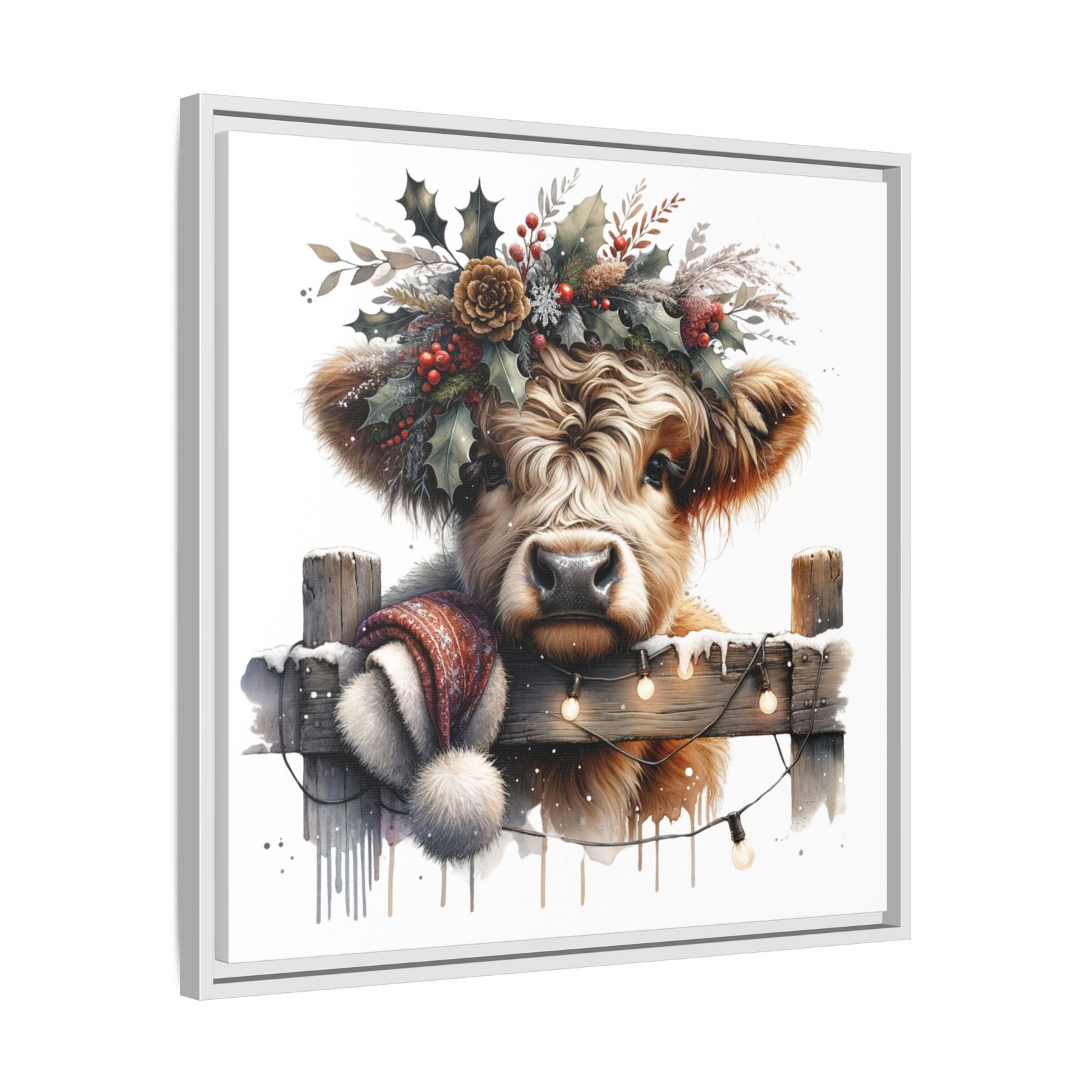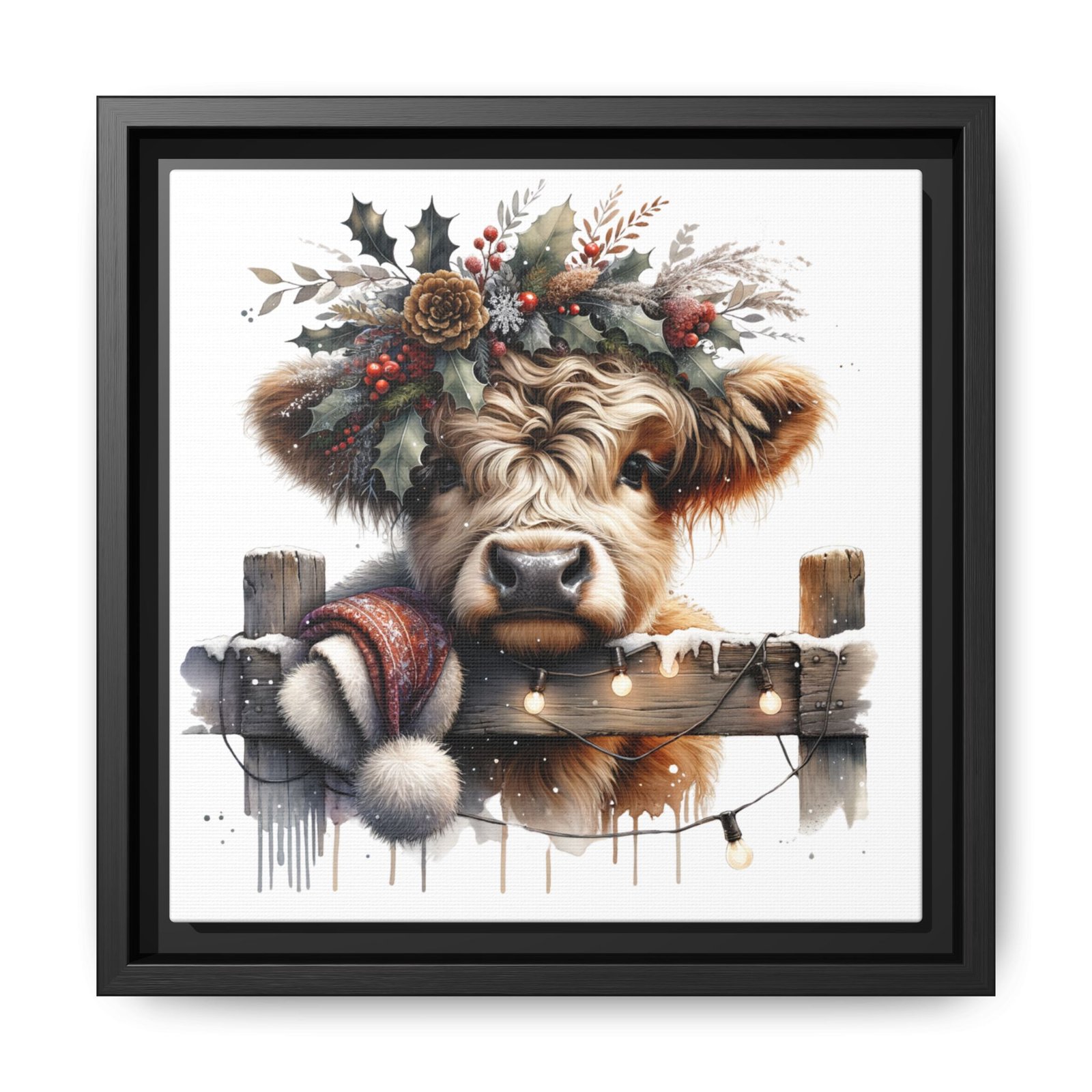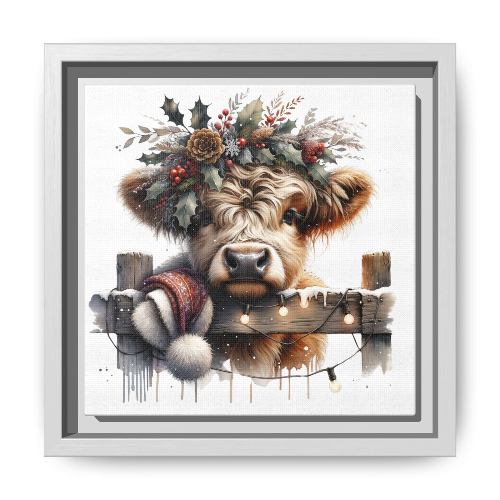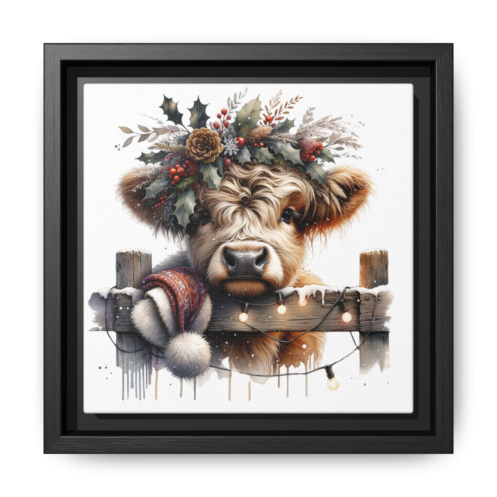 Bring rustic holiday charm into your home with this festive wall art featuring a fluffy Highland cow adorned with holly, berries, and winter greenery. Perfect for those looking to add a touch of country warmth and Christmas spirit to their decor. Ideal for holiday enthusiasts and fans of farmhouse-inspired design.