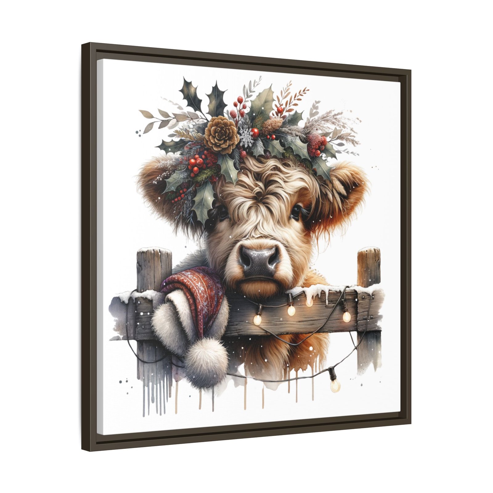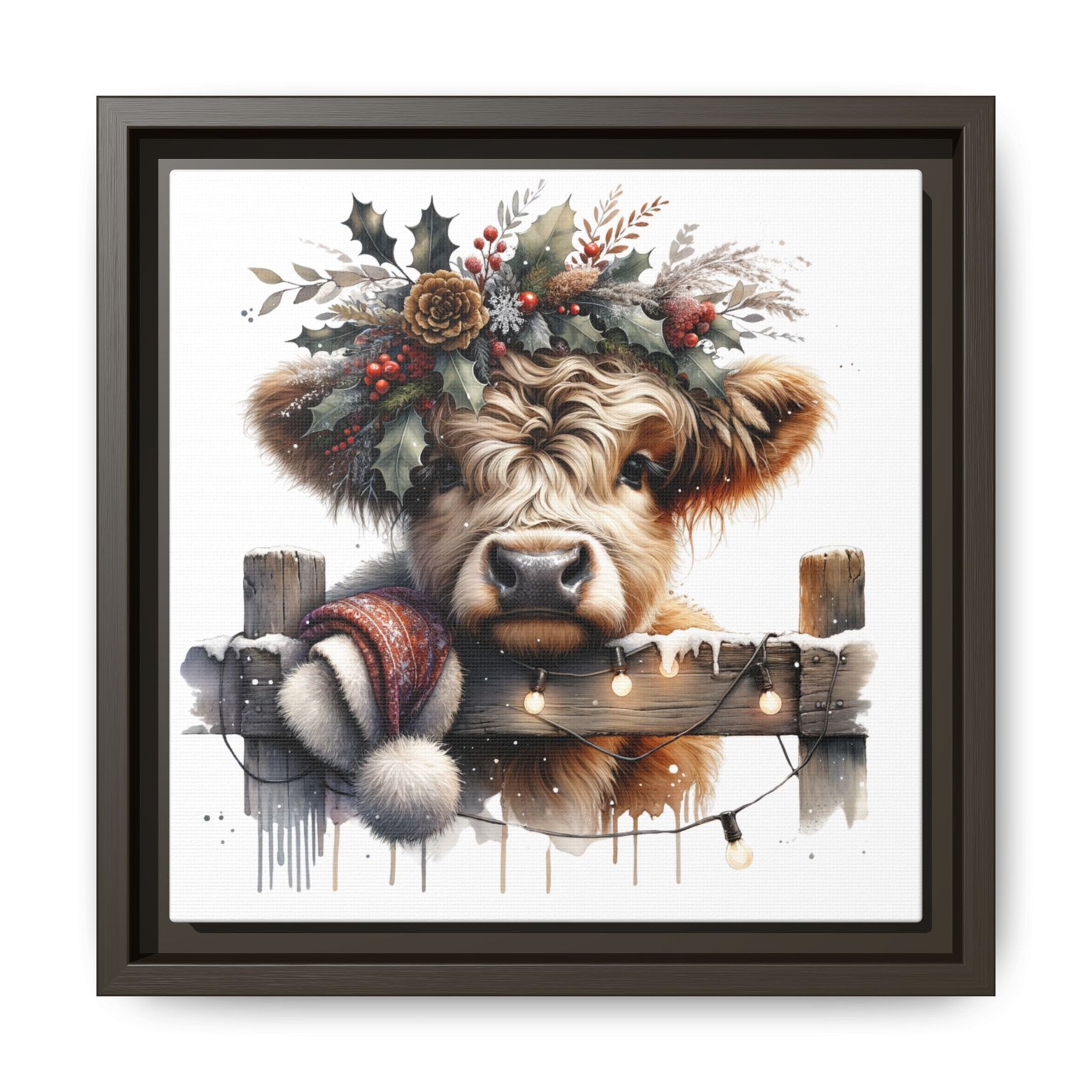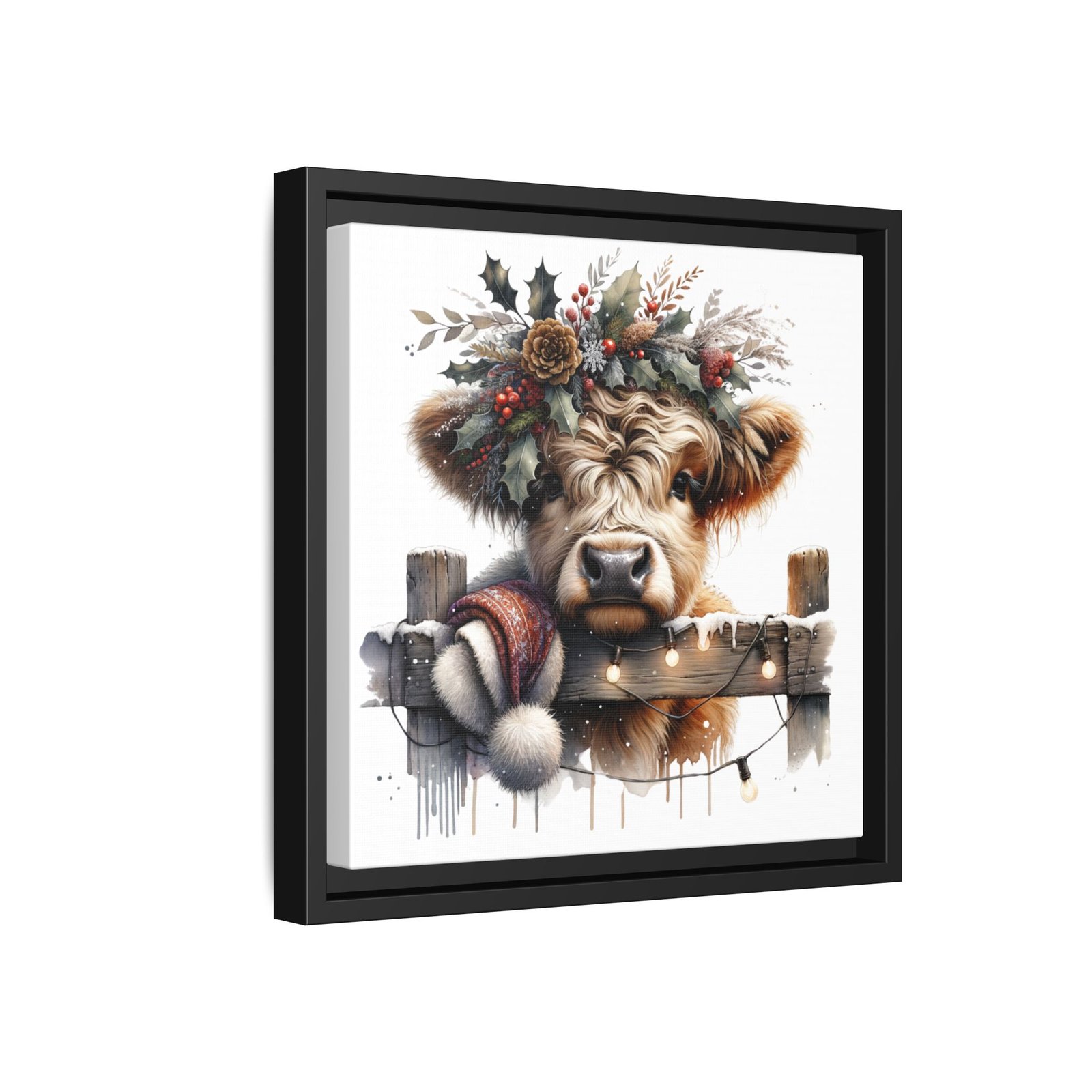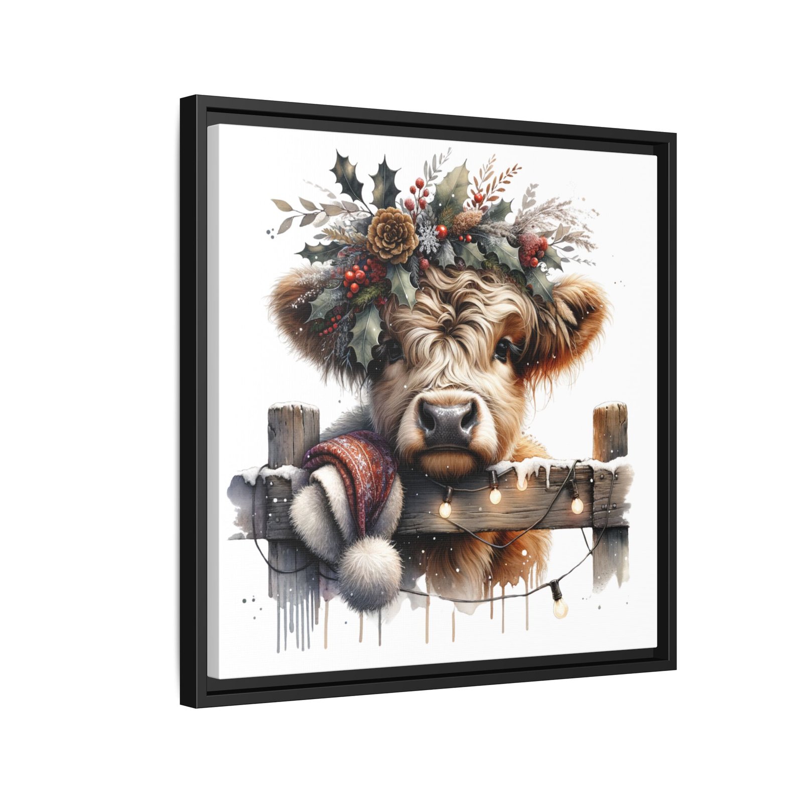Bring rustic holiday charm into your home with this festive wall art featuring a fluffy Highland cow adorned with holly, berries, and winter greenery. Perfect for those looking to add a touch of country warmth and Christmas spirit to their decor. Ideal for holiday enthusiasts and fans of farmhouse-inspired design.