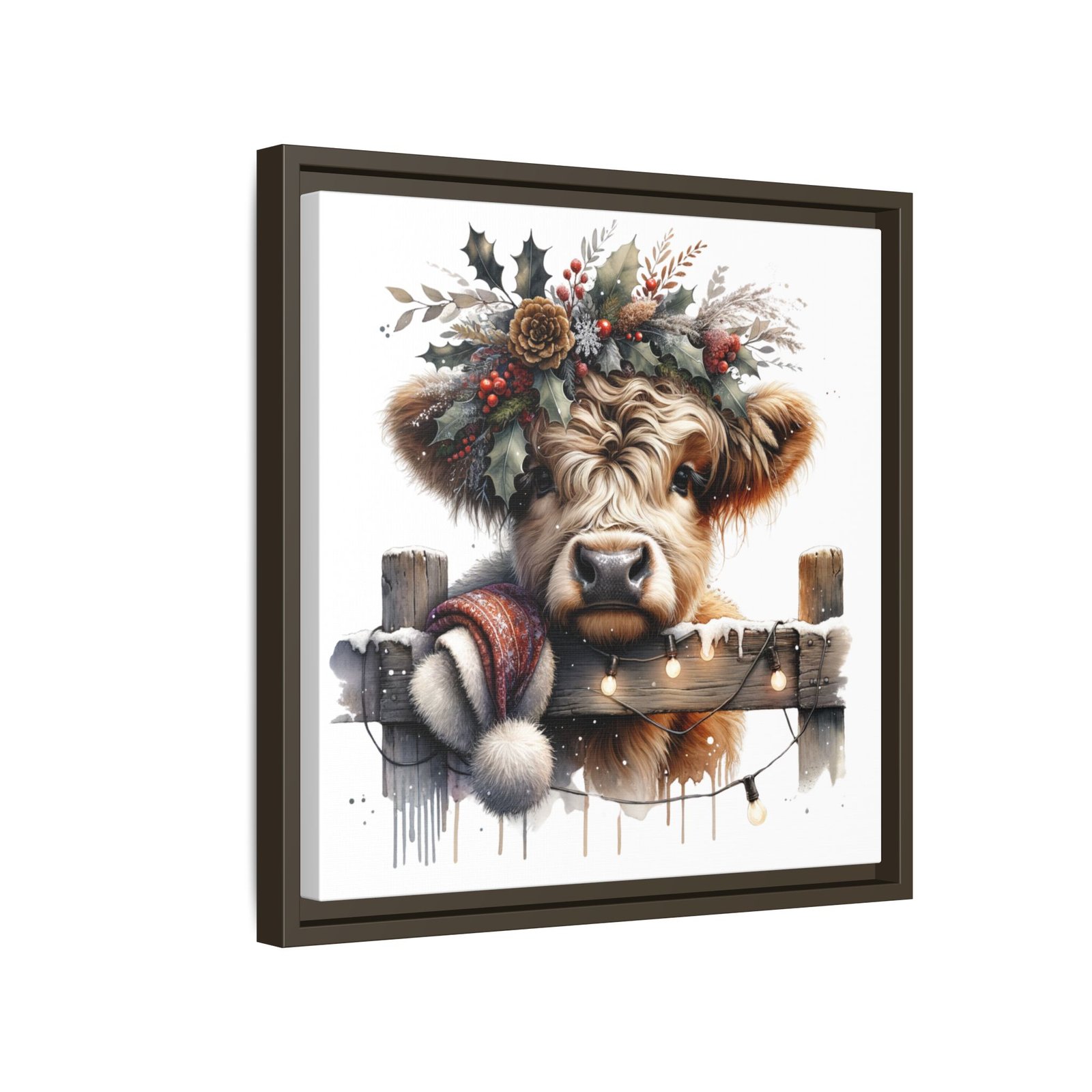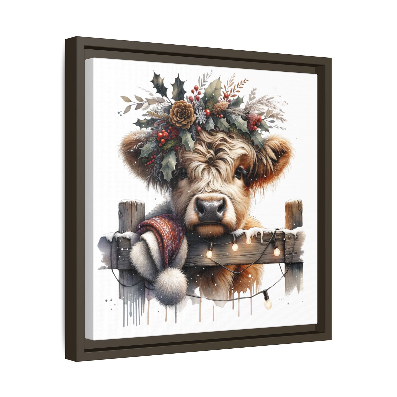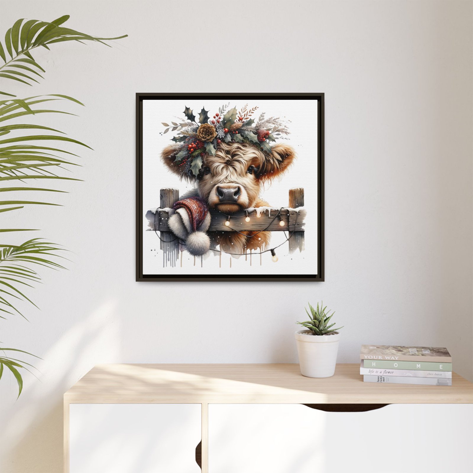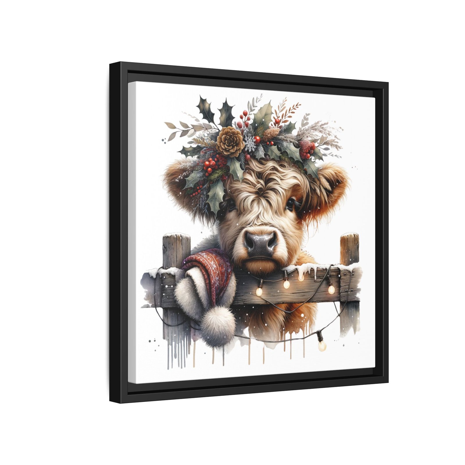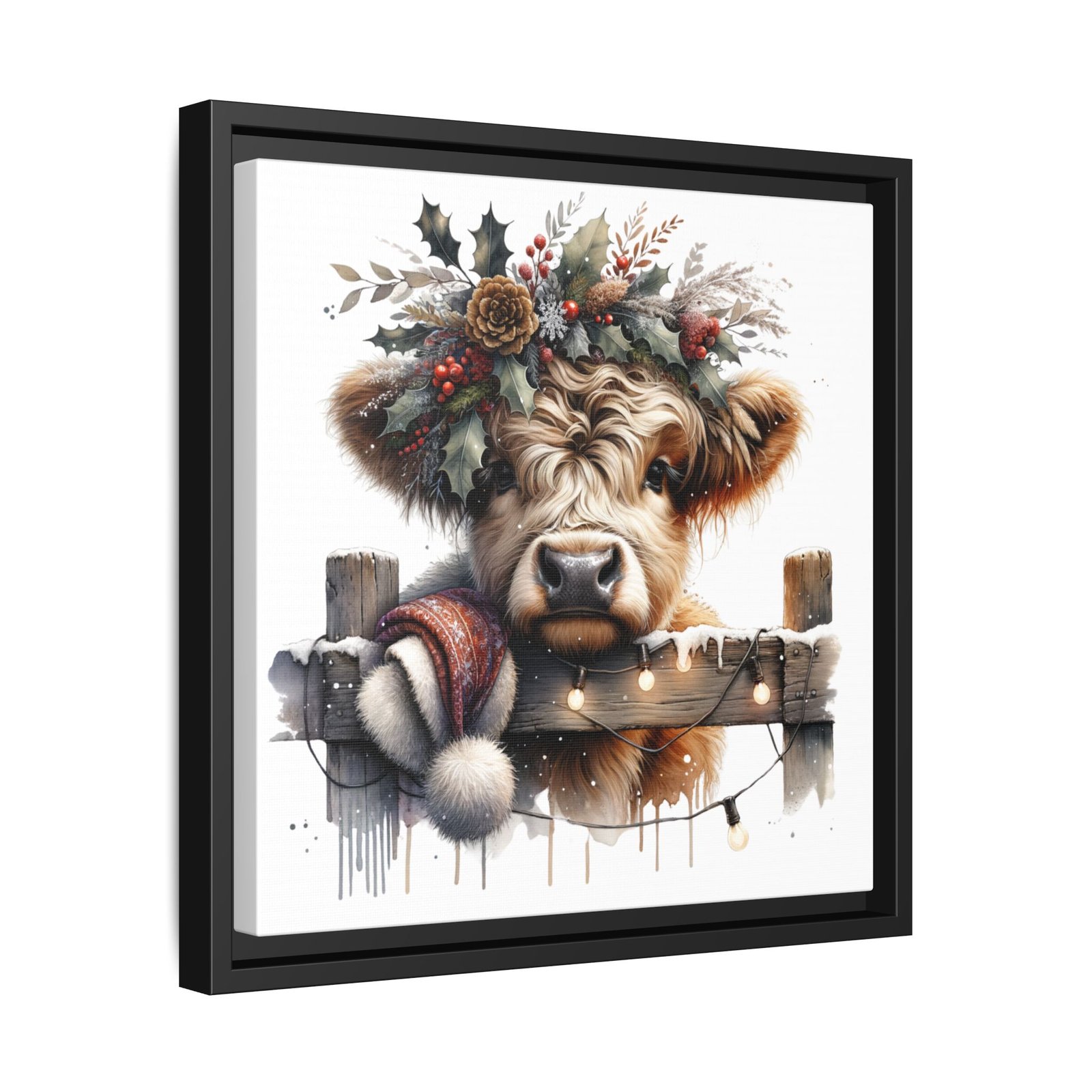 Bring rustic holiday charm into your home with this festive wall art featuring a fluffy Highland cow adorned with holly, berries, and winter greenery. Perfect for those looking to add a touch of country warmth and Christmas spirit to their decor. Ideal for holiday enthusiasts and fans of farmhouse-inspired design.
