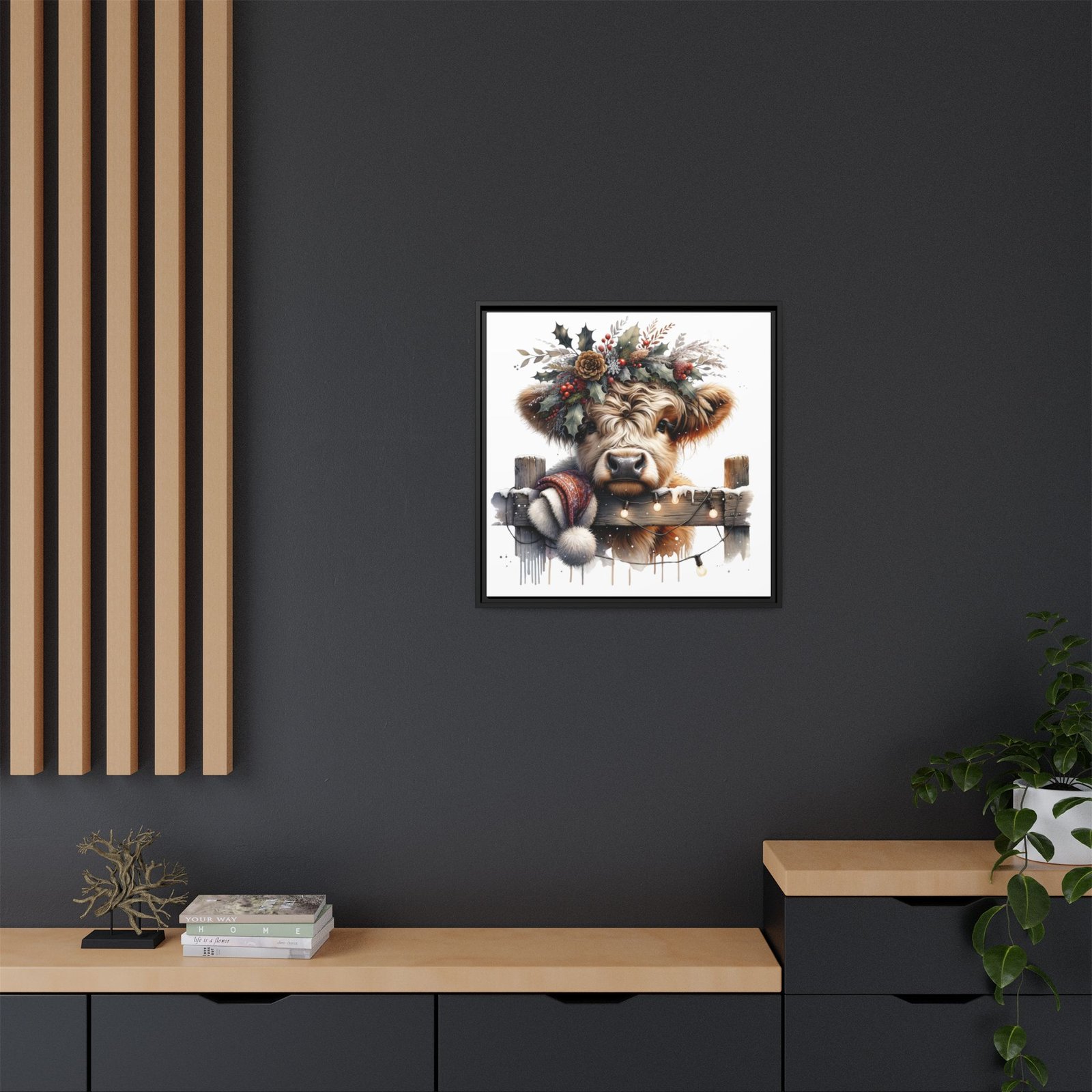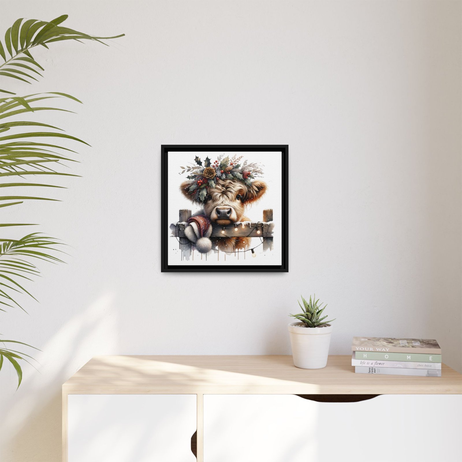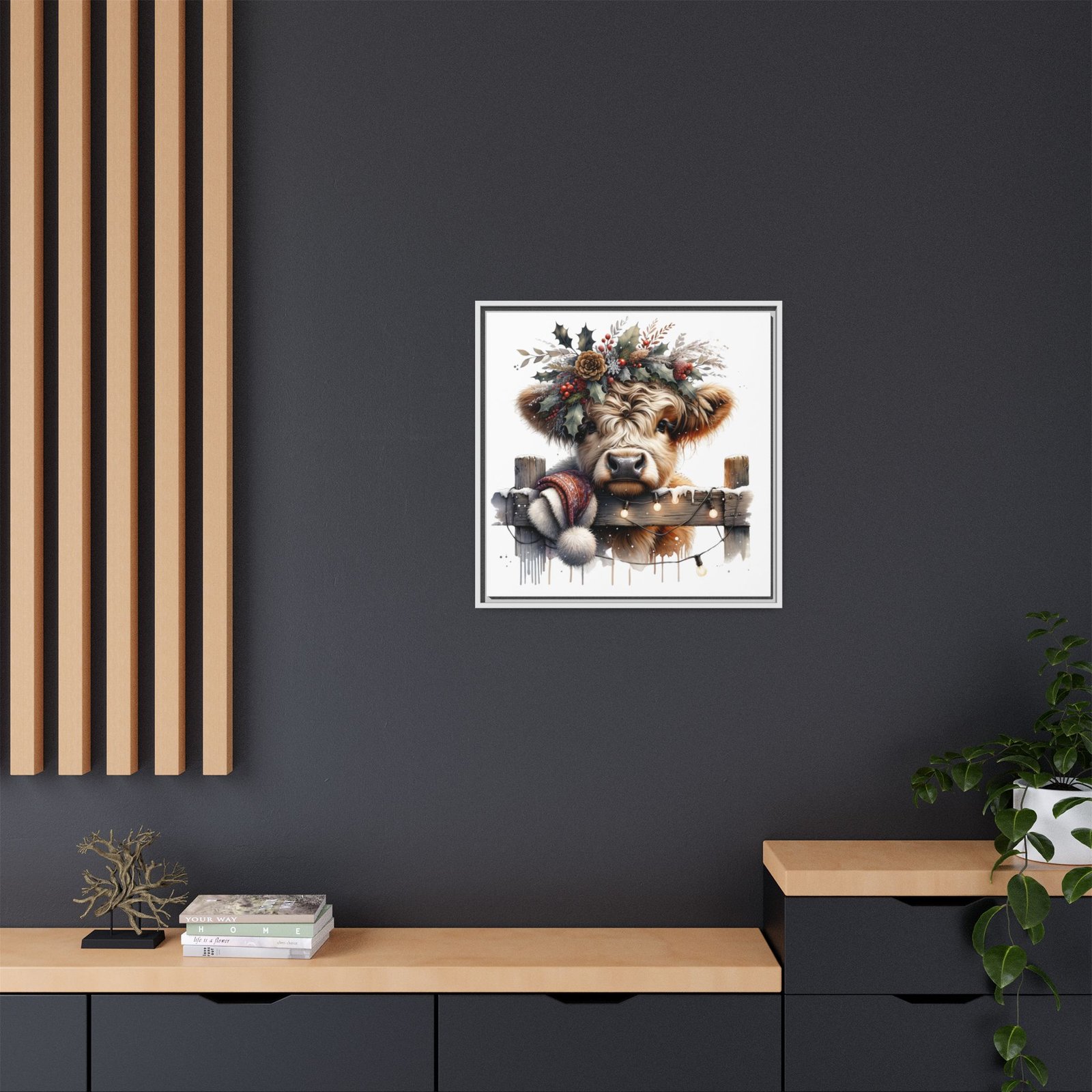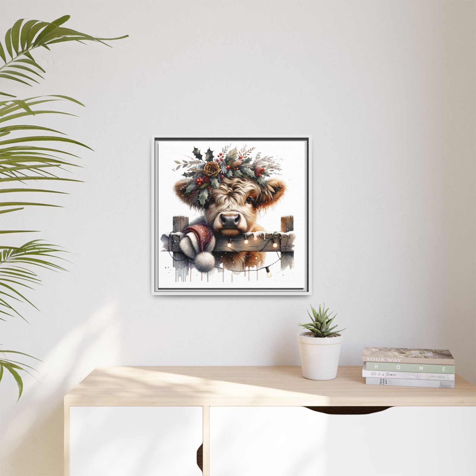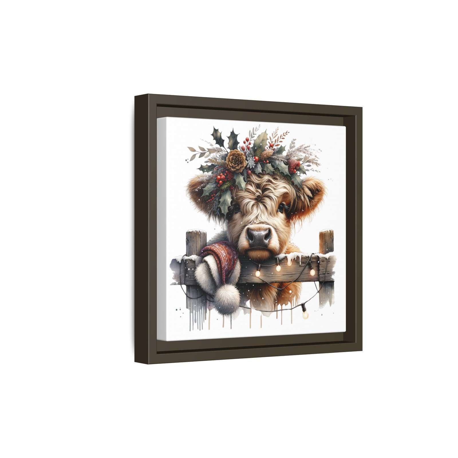 Bring rustic holiday charm into your home with this festive wall art featuring a fluffy Highland cow adorned with holly, berries, and winter greenery. Perfect for those looking to add a touch of country warmth and Christmas spirit to their decor. Ideal for holiday enthusiasts and fans of farmhouse-inspired design.