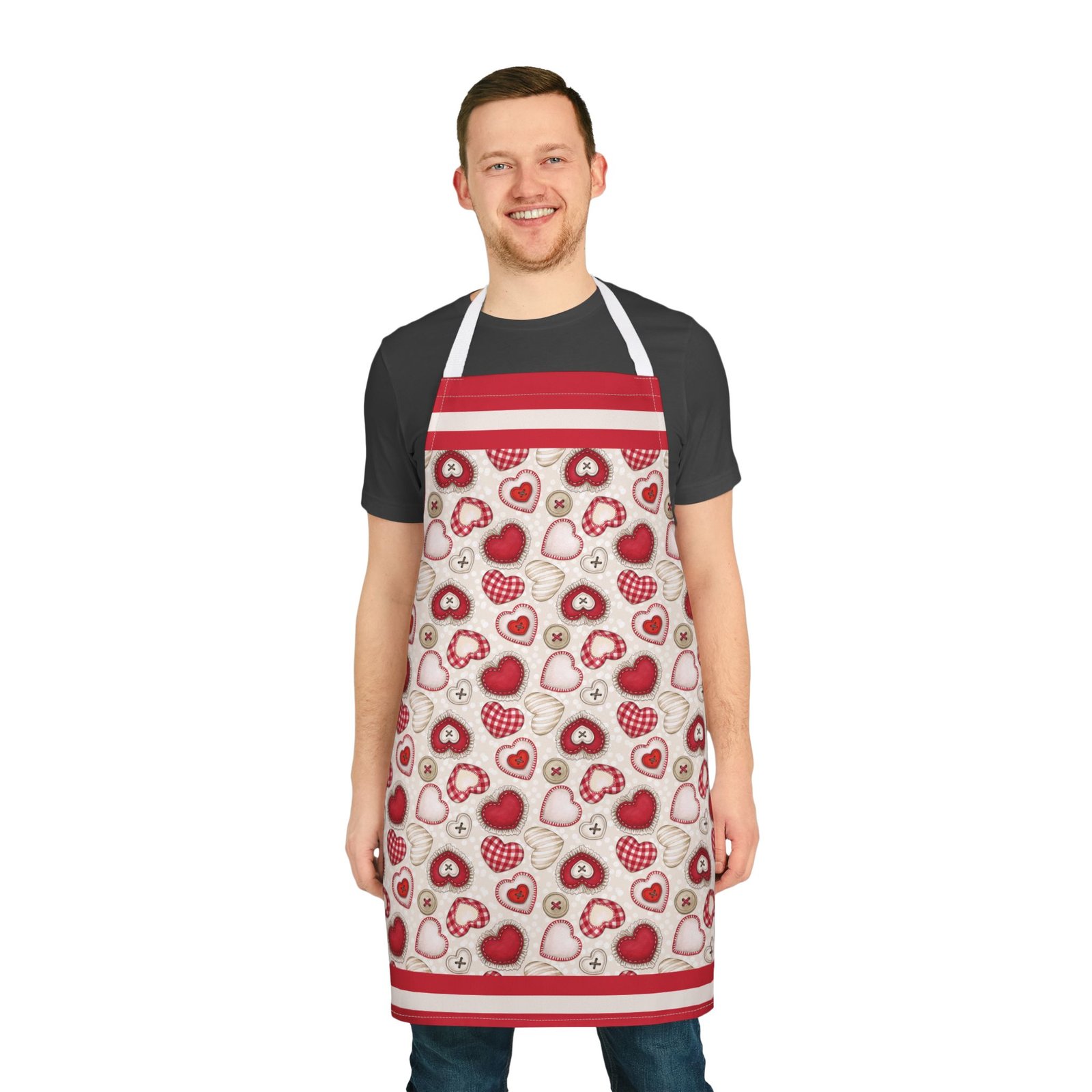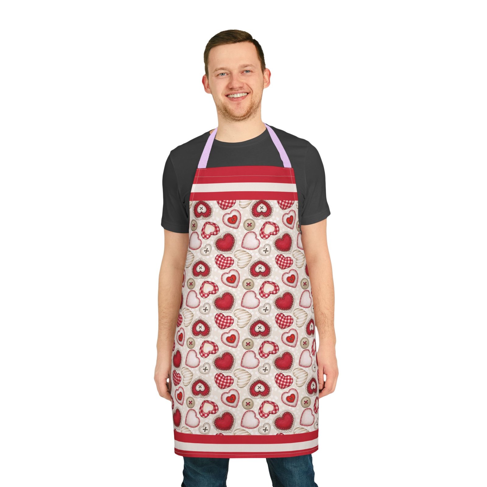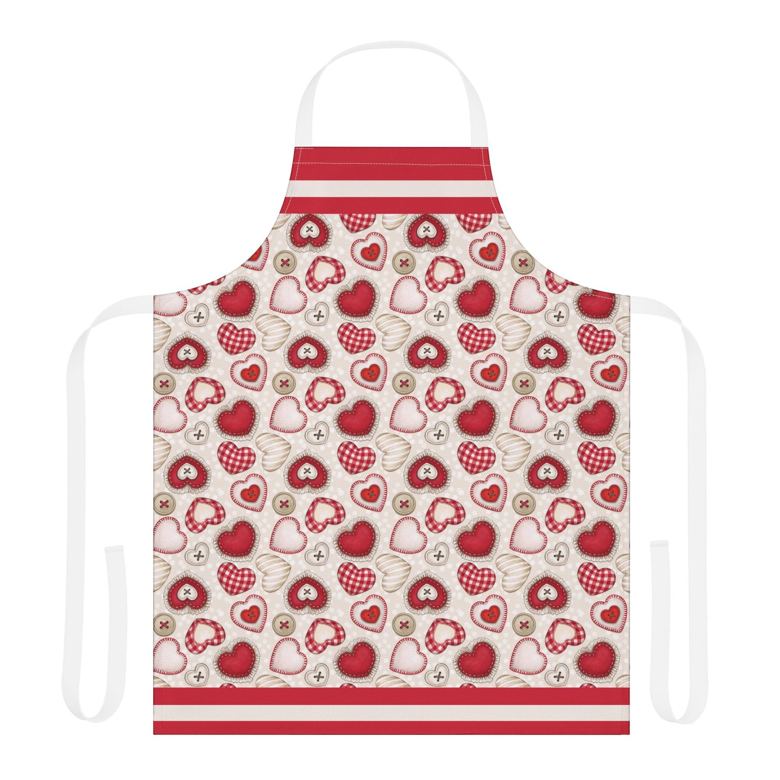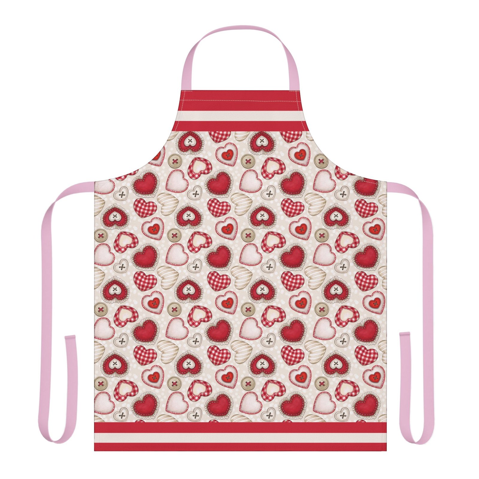 This apron brings a soft, handcrafted romance to the kitchen. Heart motifs in rich reds and blushing pinks sit alongside tiny “button” and stitched details, like a pocketable love note pinned to your waist. It feels gentle against skin and stays vibrant wash after wash, so you can knead dough for Valentine’s cookies, paint a card for someone special, or slow-cook a cozy dinner while the straps add a subtle pop of personality. The tie-back closure lets you adjust the fit quickly between tasks. It’s the kind of apron that makes everyday rituals—baking, crafting, or plating—feel a little more considered and quietly joyful.