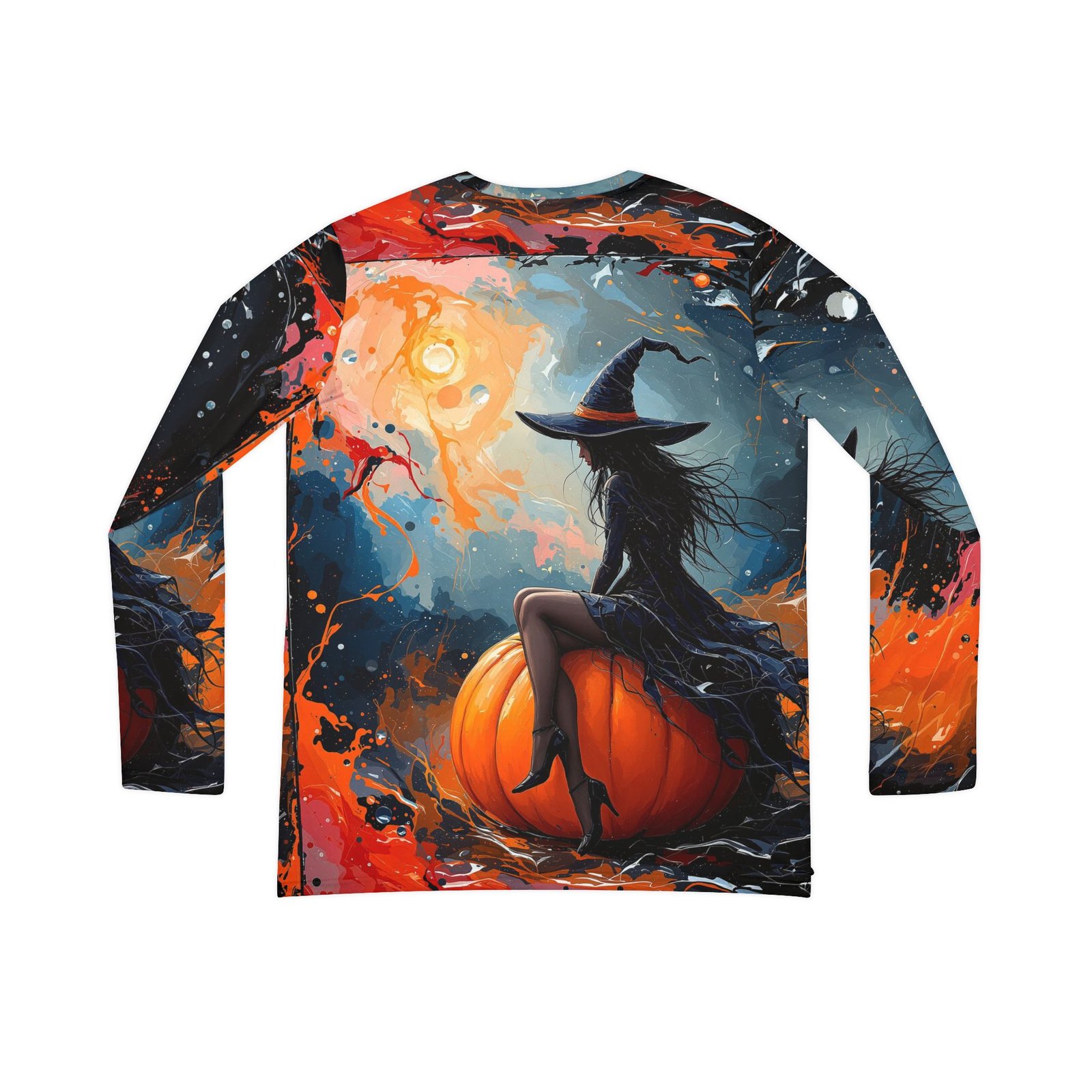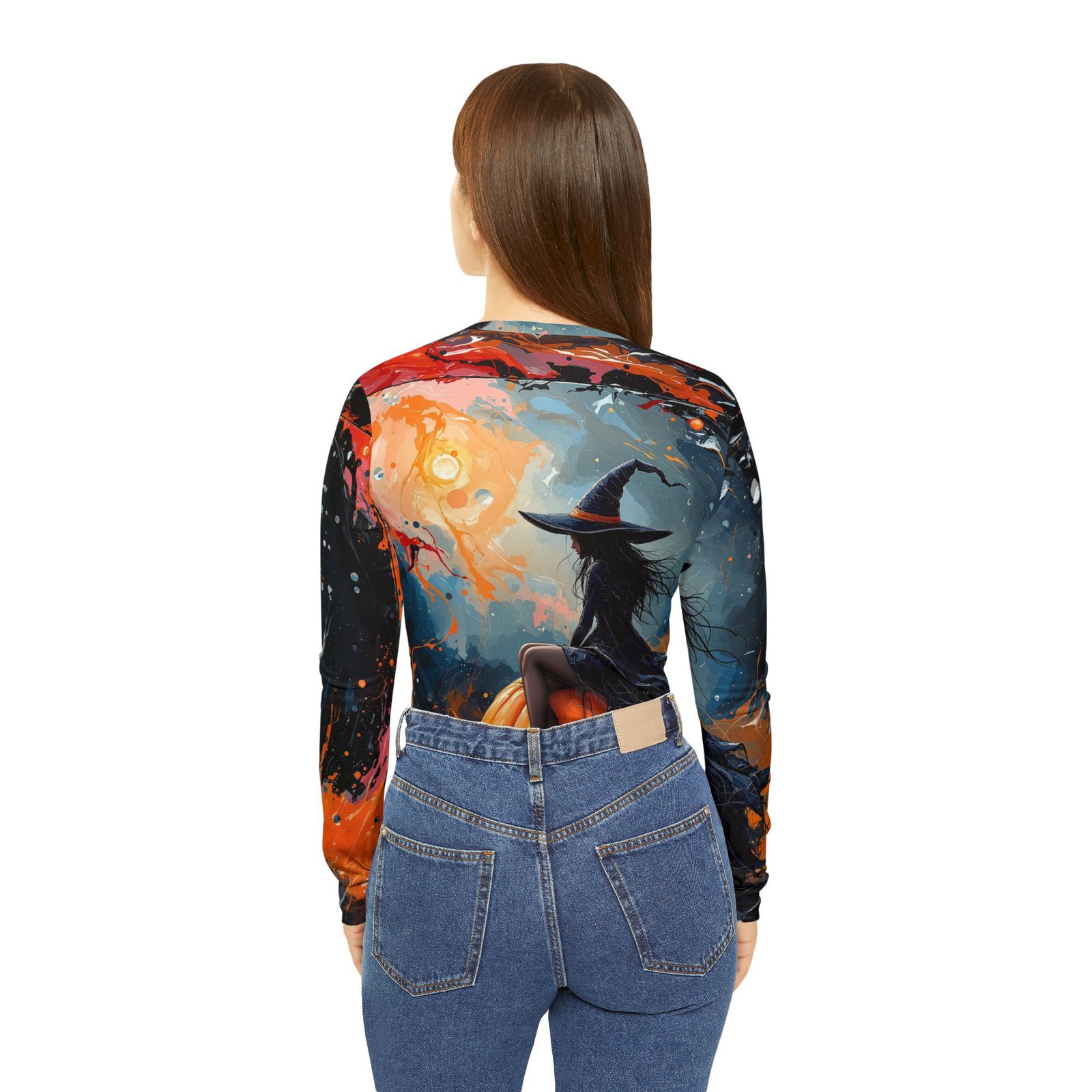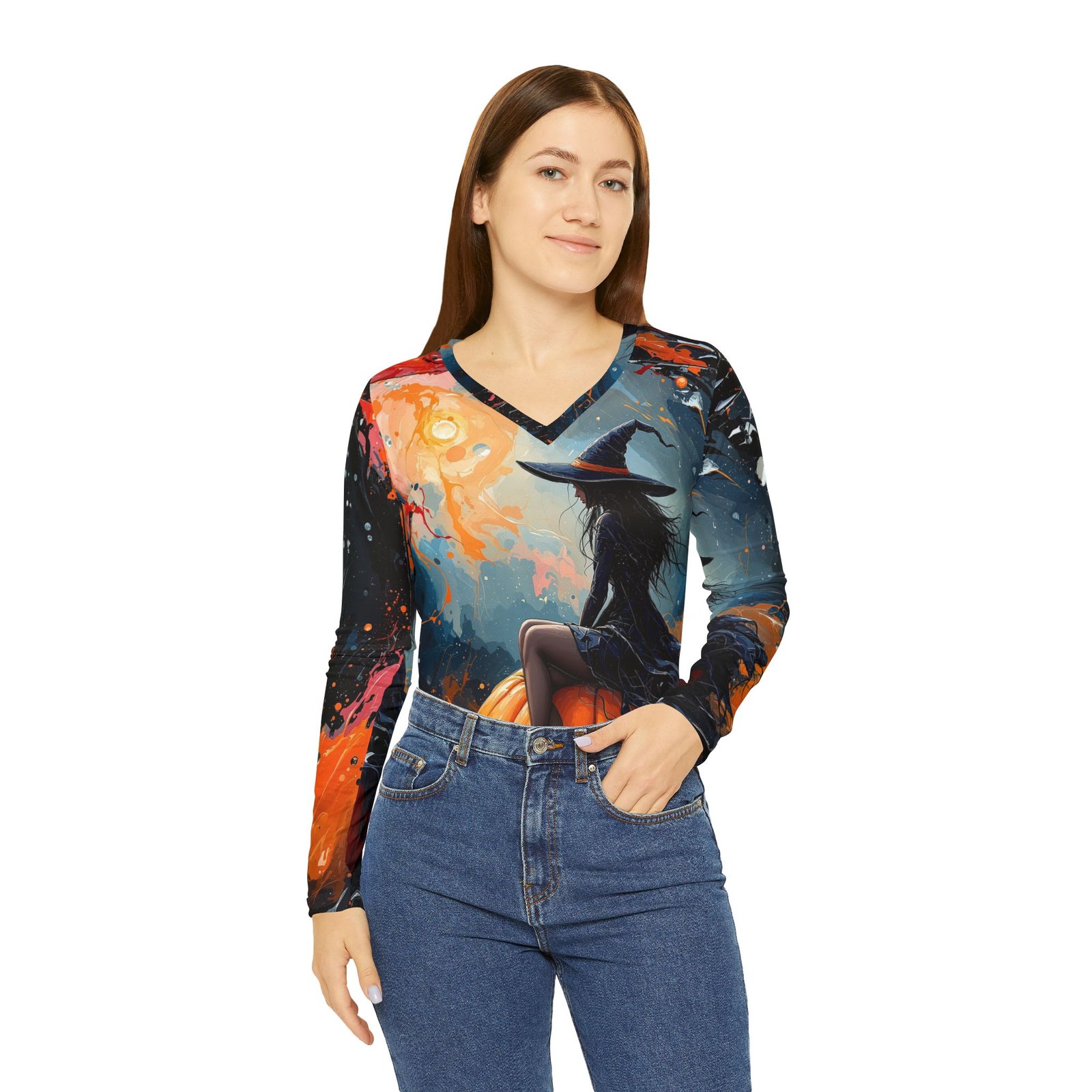 Artistic witch Halloween long sleeve V-neck shirt for women. Made of super soft and lightweight polyester-spandex blend, perfect for leisure or activewear. This shirt gives off a spooky, witchy vibe and is perfect for Halloween celebrations. Relevant to women who love artistic, unique clothing pieces. Product features – 95% Polyester 5% Spandex for softness and durability – Double needle sleeve, neck, and bottom hem for longevity – Printed-in size and care label for convenience – Lightweight fabric for comfort (5.6 oz/yd²) – Seam thread color matches design for a cohesive look Care instructions – Do not dryclean – Do not iron – Tumble dry: low heat – Do not bleach – Machine wash: warm (max 30C or 90F)