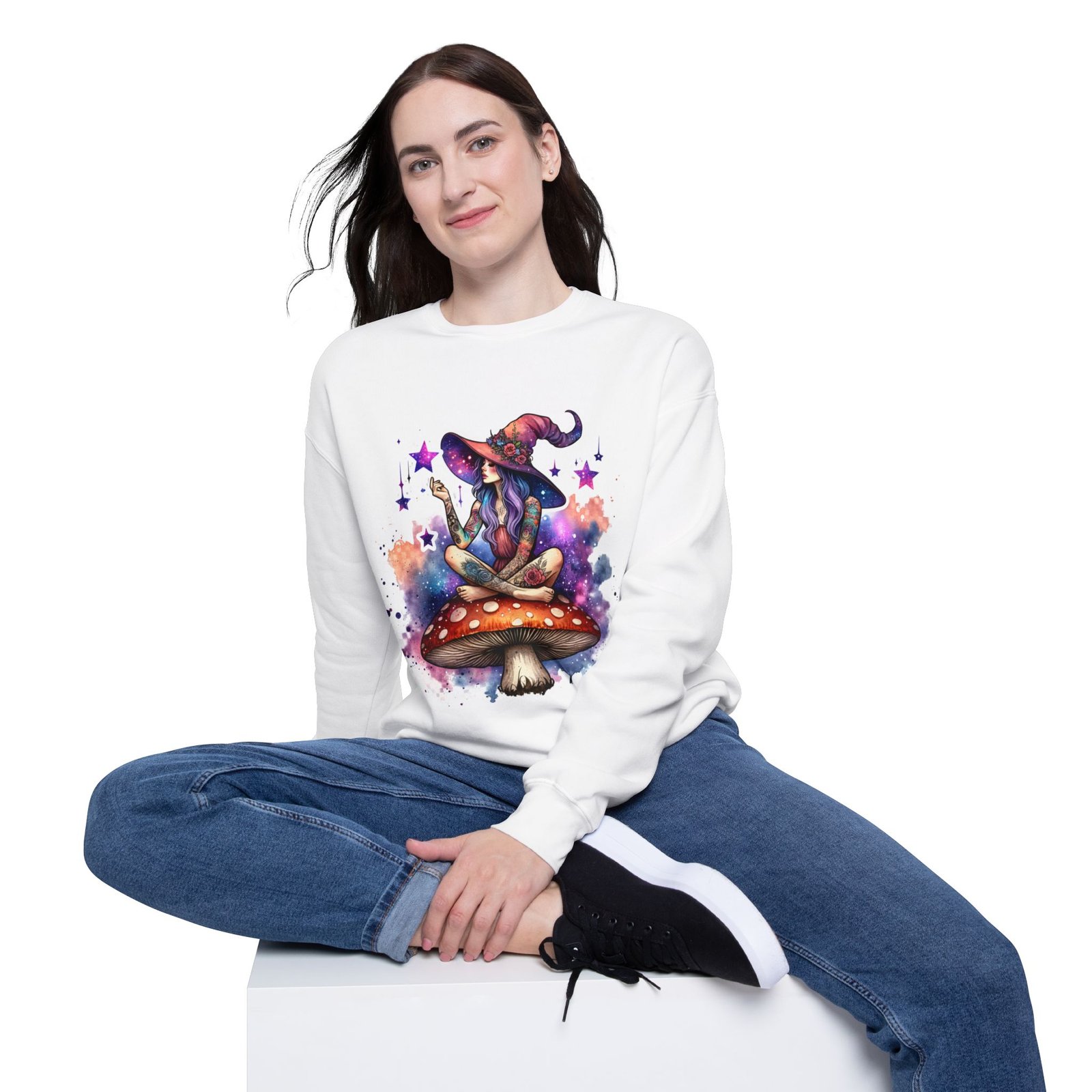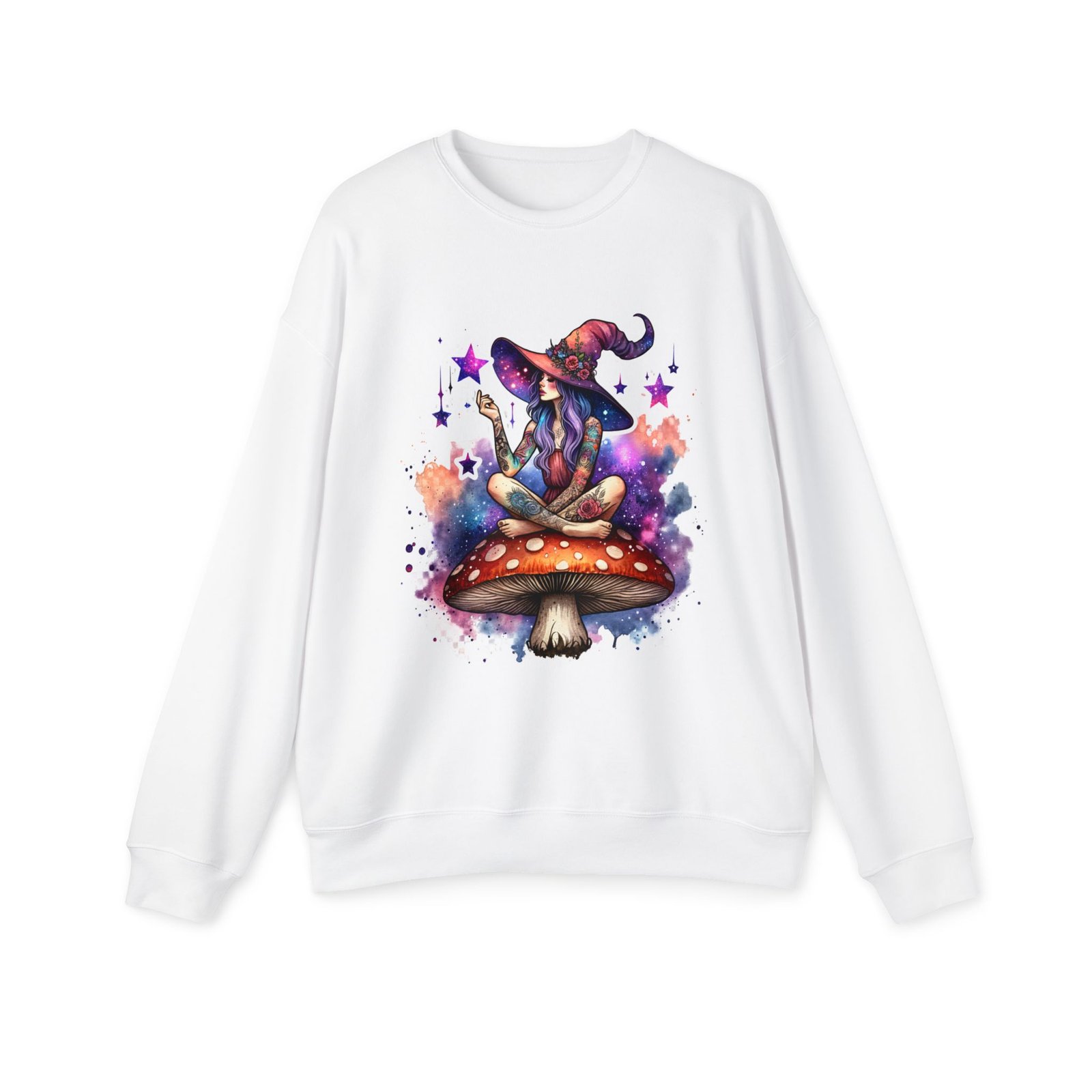 A cozy and vibrant Halloween-themed drop shoulder sweatshirt featuring a witch sitting on a mushroom. The vivid colors and unique design give off a spooky and fun vibe, perfect for Halloween celebrations. This sweatshirt is made of soft and luxurious fabric, with dropped shoulders for a relaxed fit. Ideal for those who love Halloween and want to add a touch of whimsy to their wardrobe.